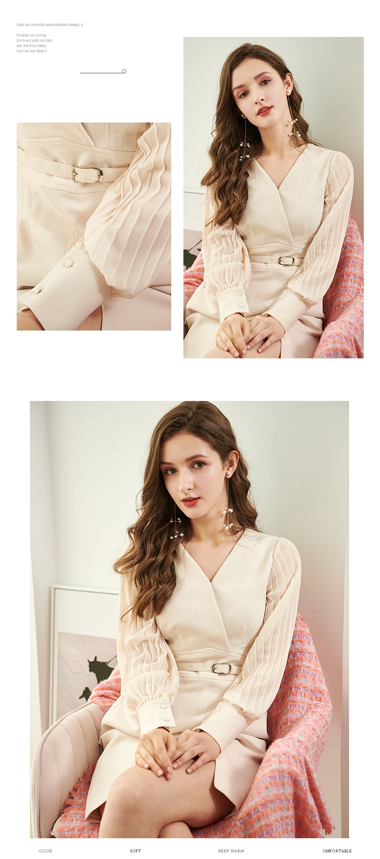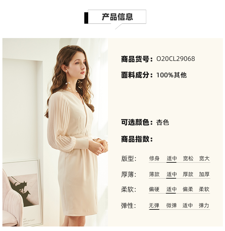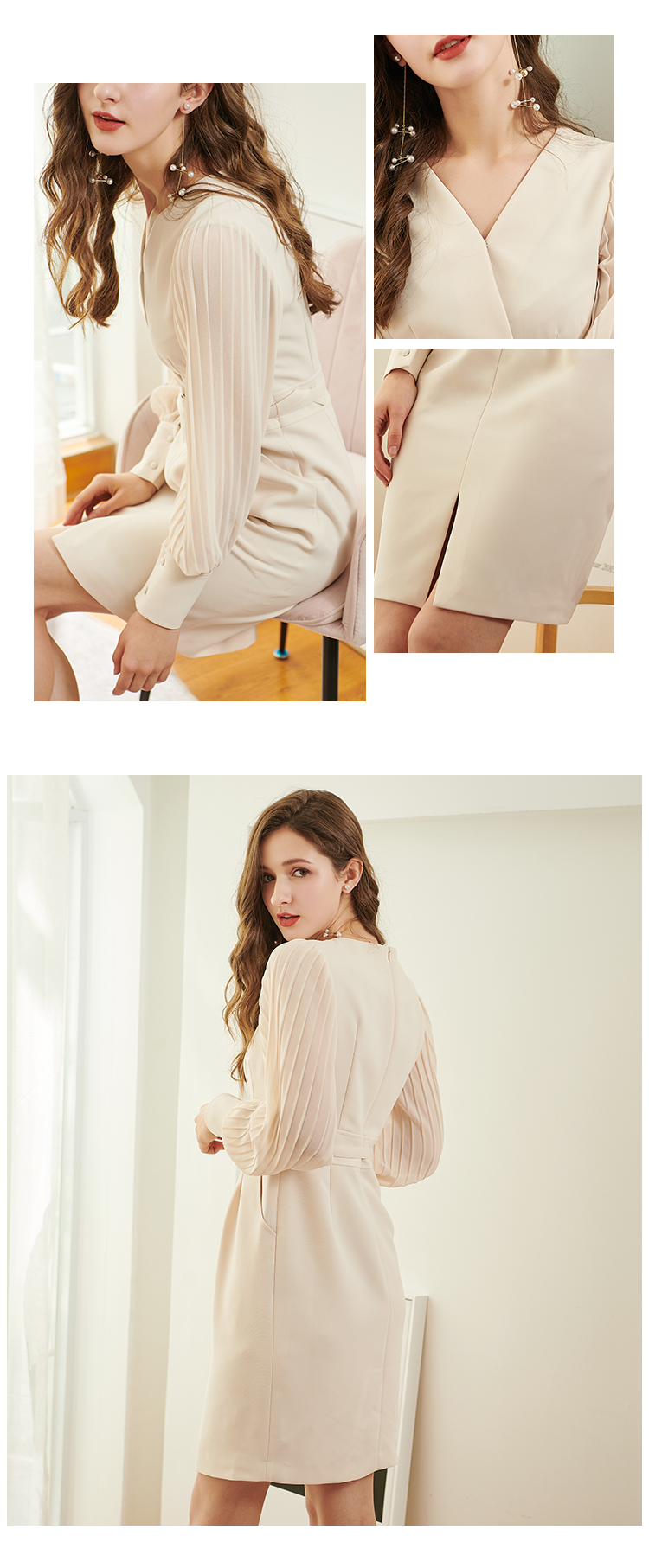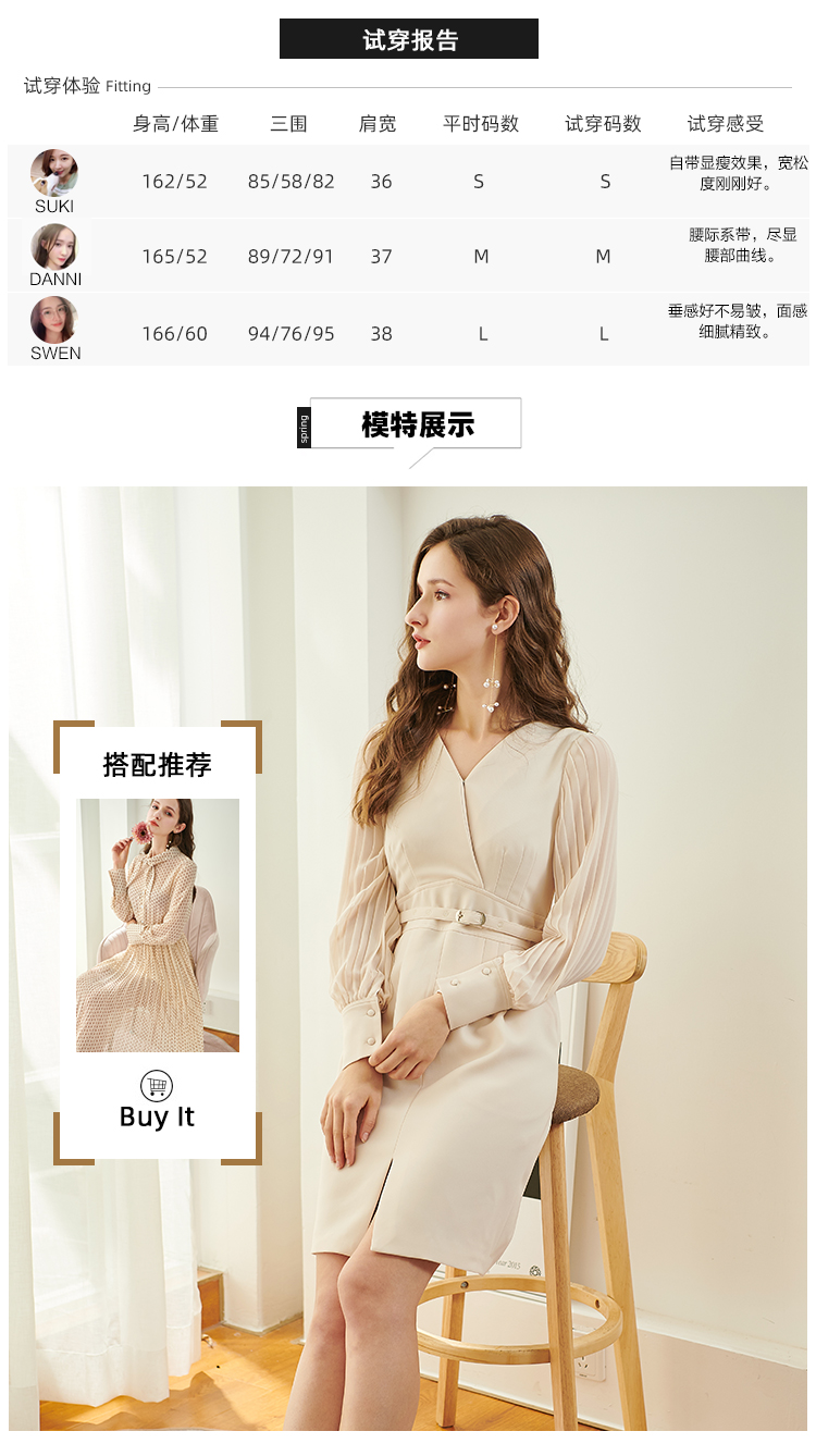 欧芮儿新款长袖V领雪纺连衣裙中长款显瘦气质收腰包臀裙