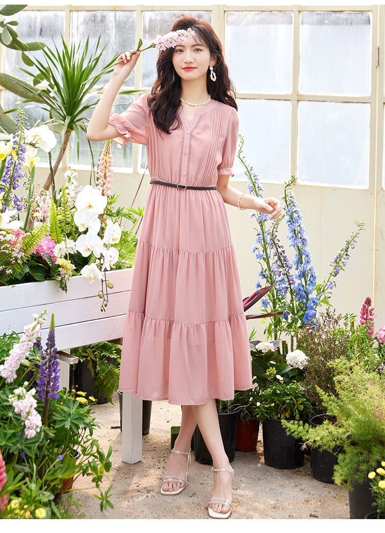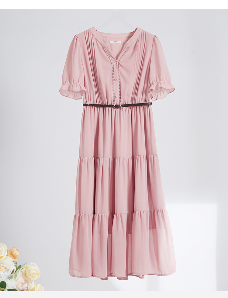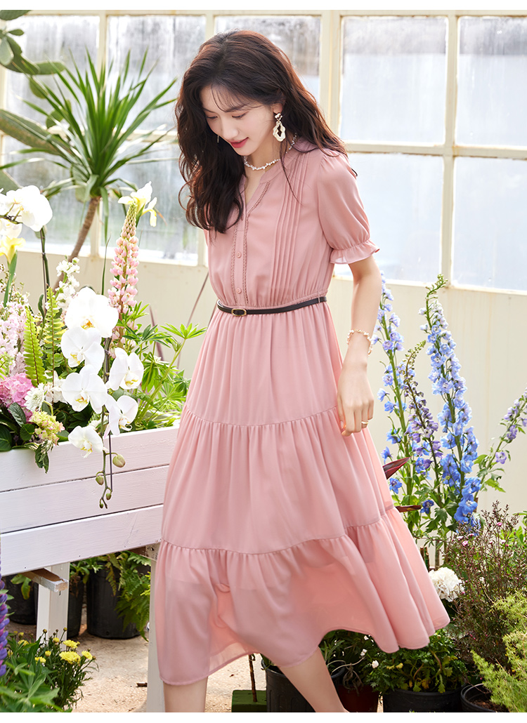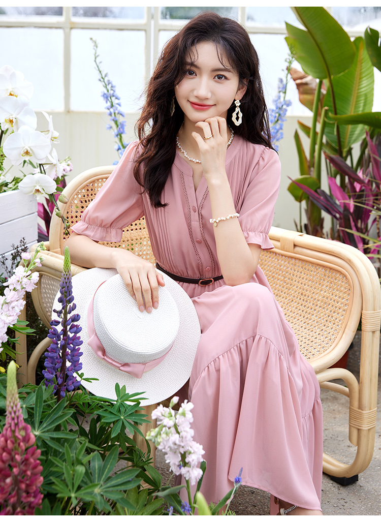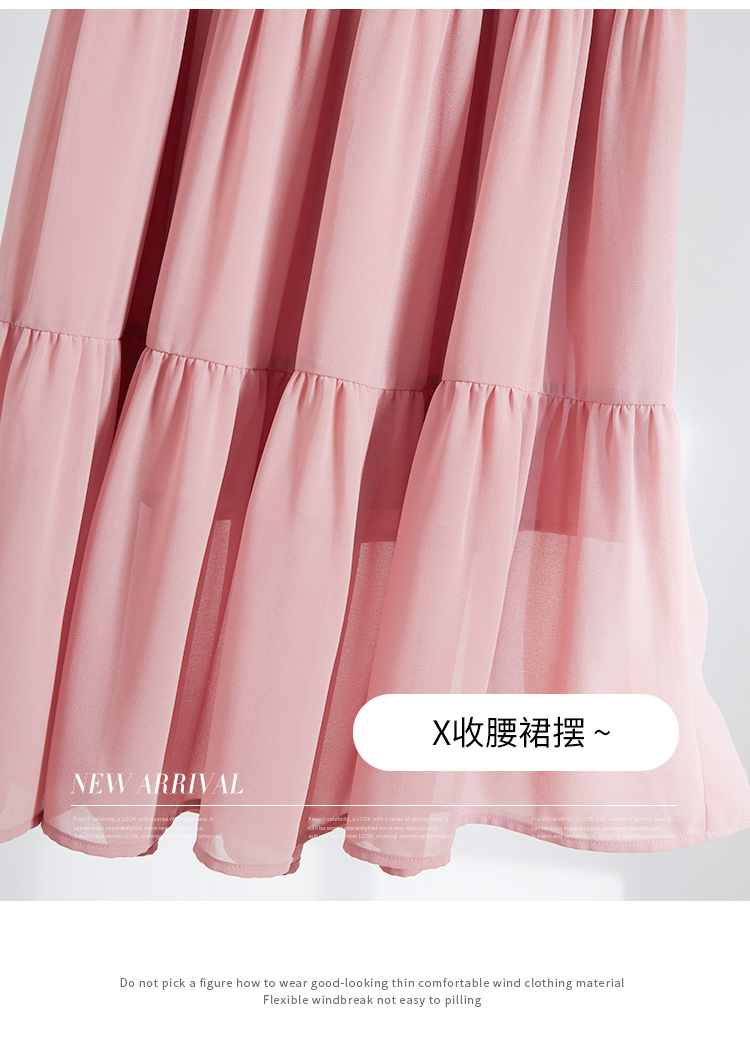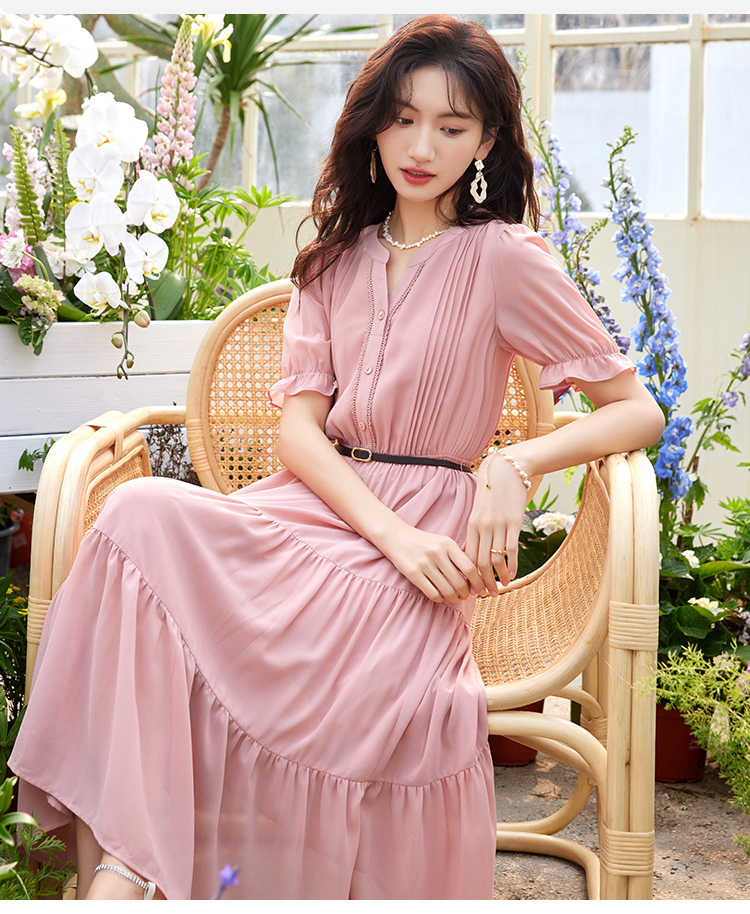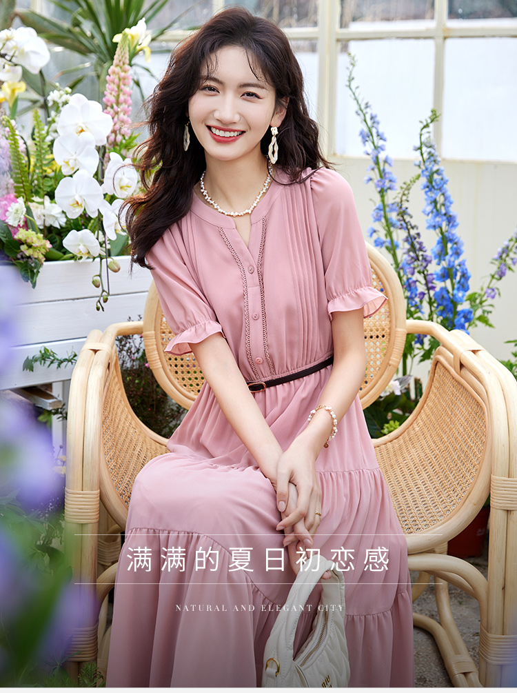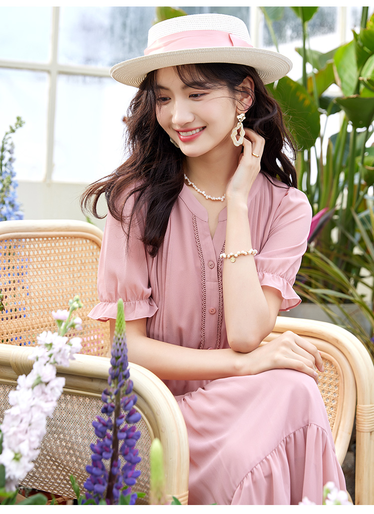 【618秒杀】熙世界法式温柔风雪纺连衣裙女设计感小众气质粉色荷叶边夏季裙子