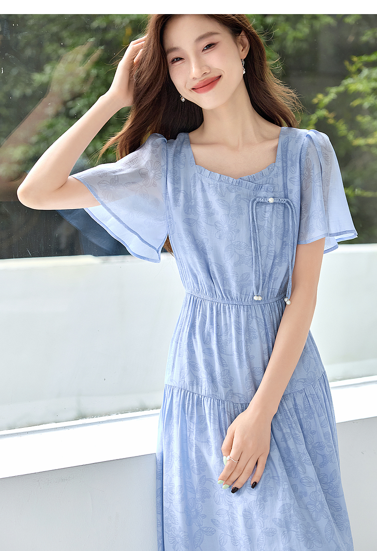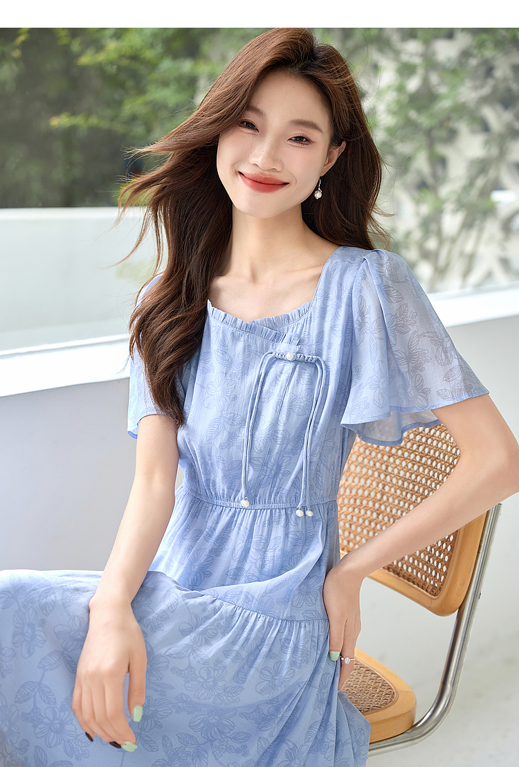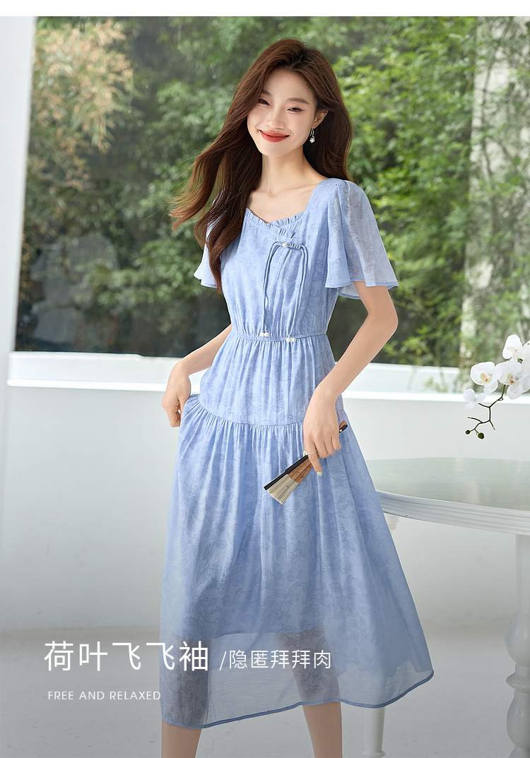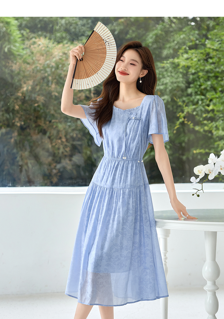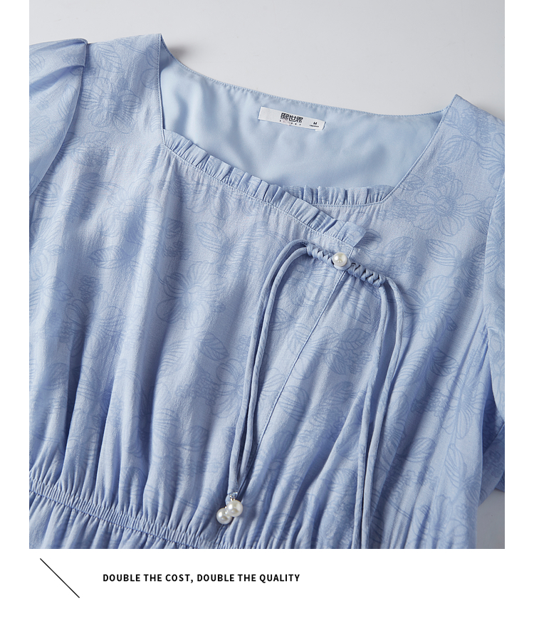 【专属特价】熙世界温柔风花纹蓝色连衣裙夏季新款气质时尚方领收腰中长裙子