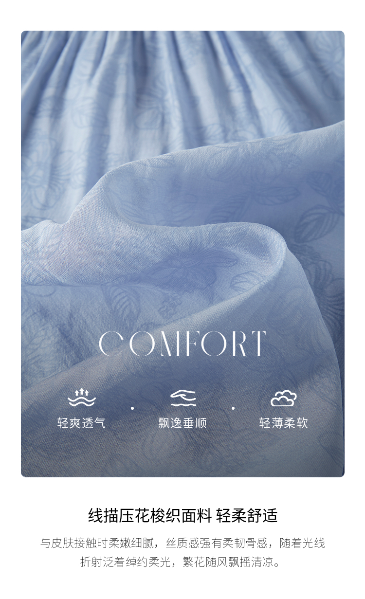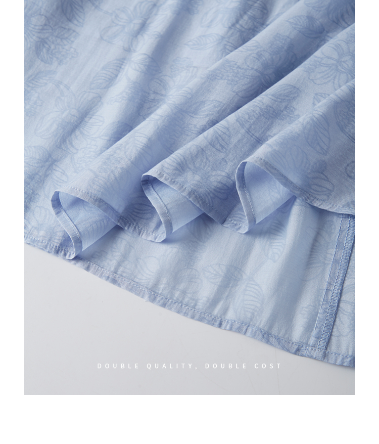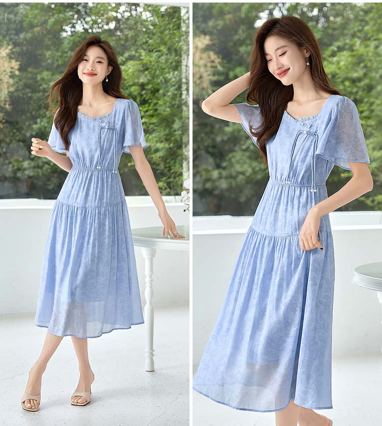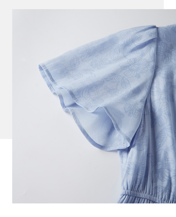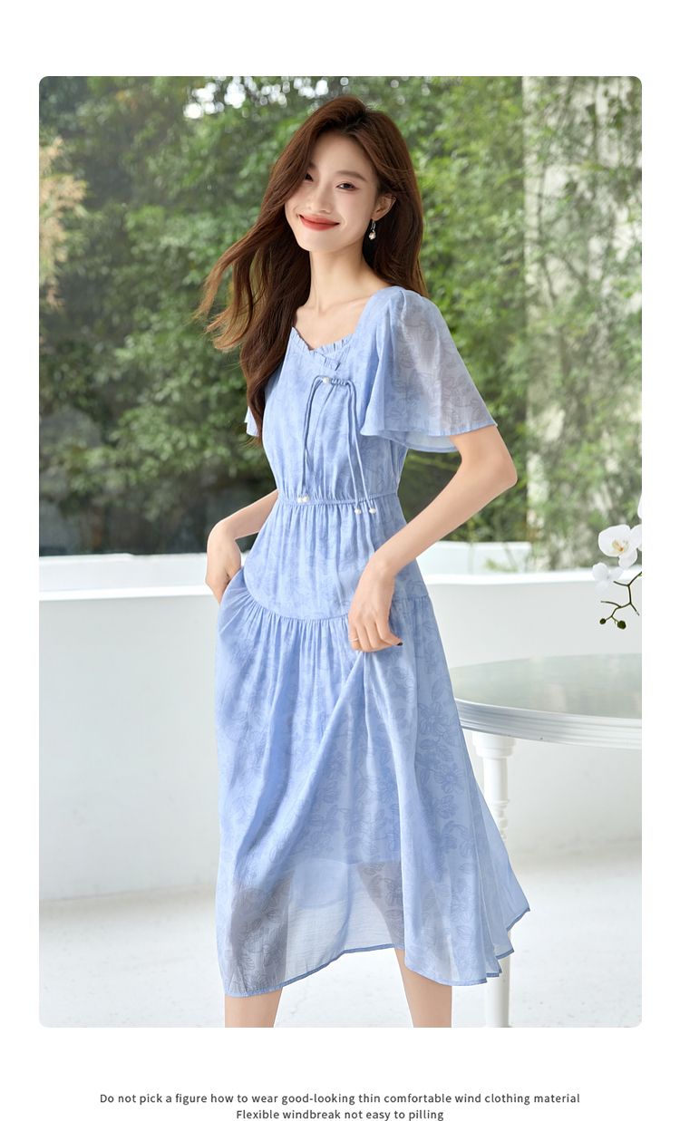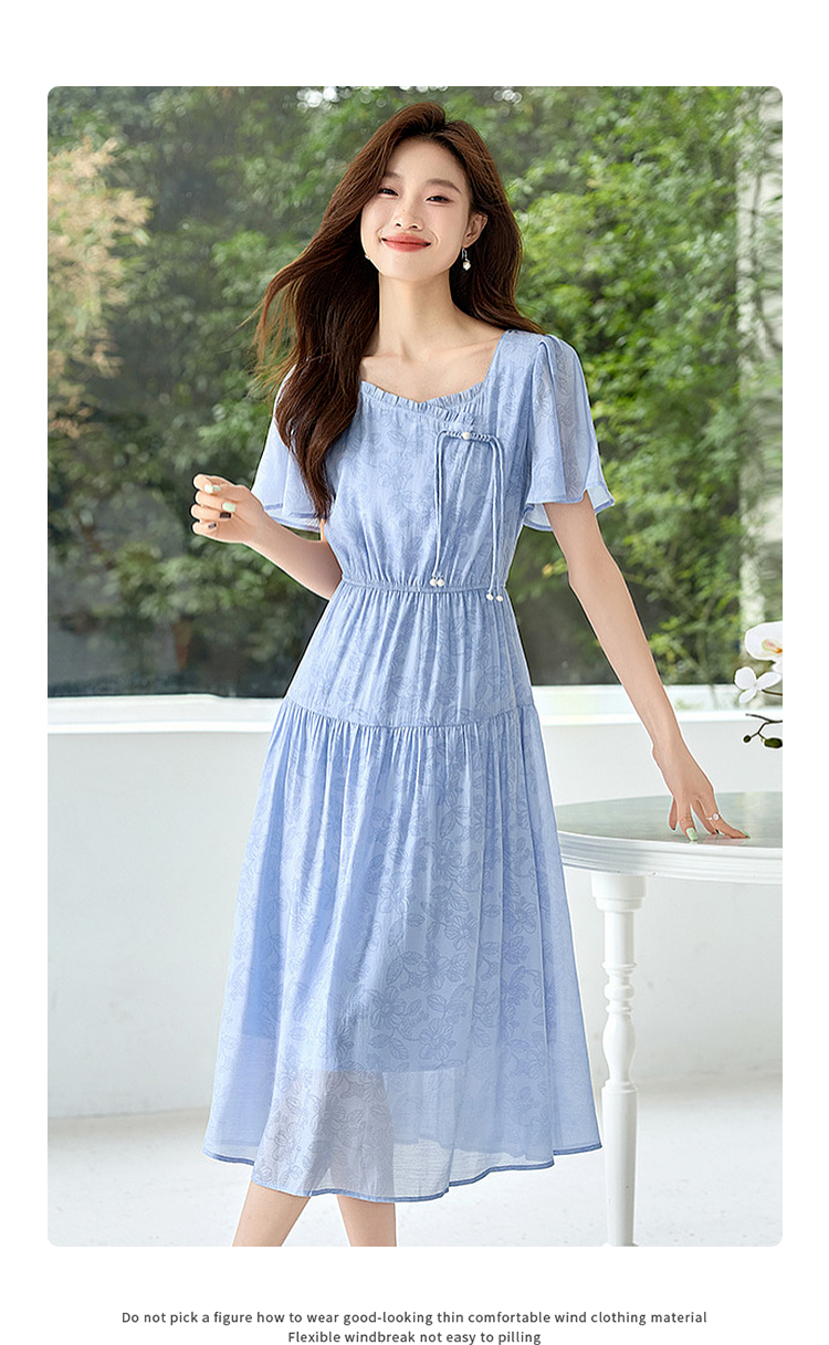 【专属特价】熙世界温柔风花纹蓝色连衣裙夏季新款气质时尚方领收腰中长裙子