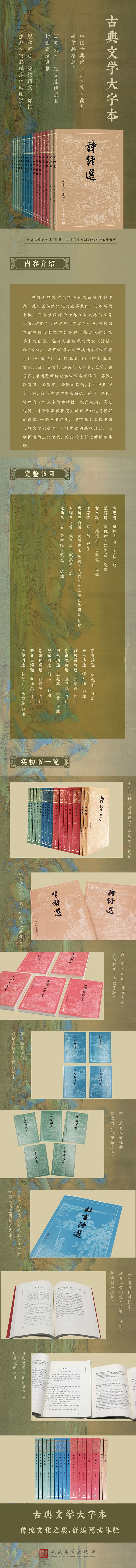 中国古典文学包括诗词文曲等多种题材,是中国传统文化的重要载体,历朝历代也诞生了众多闪耀于世界文学之林的文学大家。这套“古典文学大字本”丛书,精选基本的中国古典文学典籍和一些古代著名文学家的作品,包括先秦诗歌的代表《诗经》和《楚辞》,历代诗词文的经典选本《古文观止》《千家诗》《唐诗三百首》《宋词三百首》《元曲三百首》,唐诗名家李白、杜甫、白居易、李商隐的诗选和宋词名家柳永、苏轼、李清照、辛弃疾、姜夔的词选。本丛书共16个品种,由古典文学专家精选、详注、解读,特以大开本大字简体横排,版式疏朗,赏心悦目,对于需要保护视力的读者来说是很好的选择。一套丛书在手,即可基本掌握中国古典文学的菁华,同时典雅的装帧设计,大字护眼的正文版式,给您带来舒适的阅读体验。