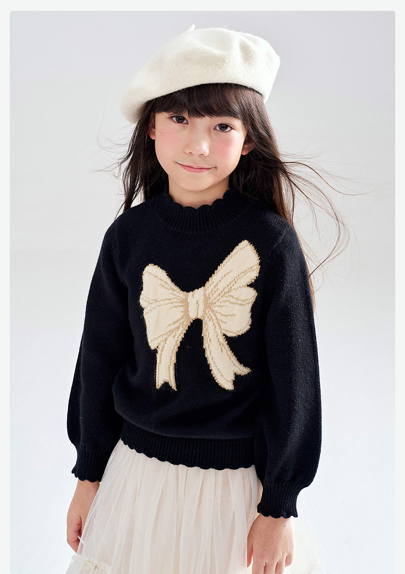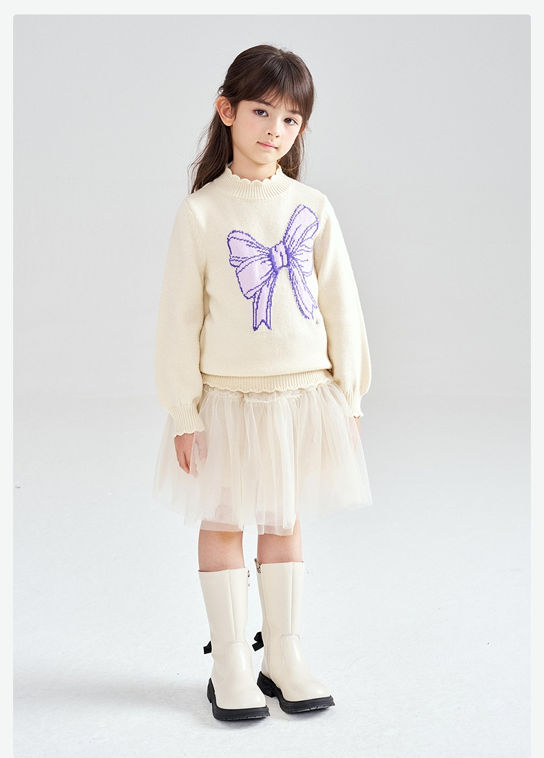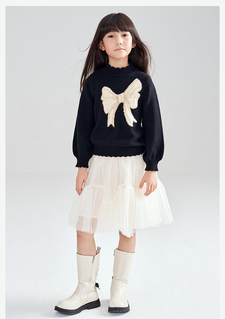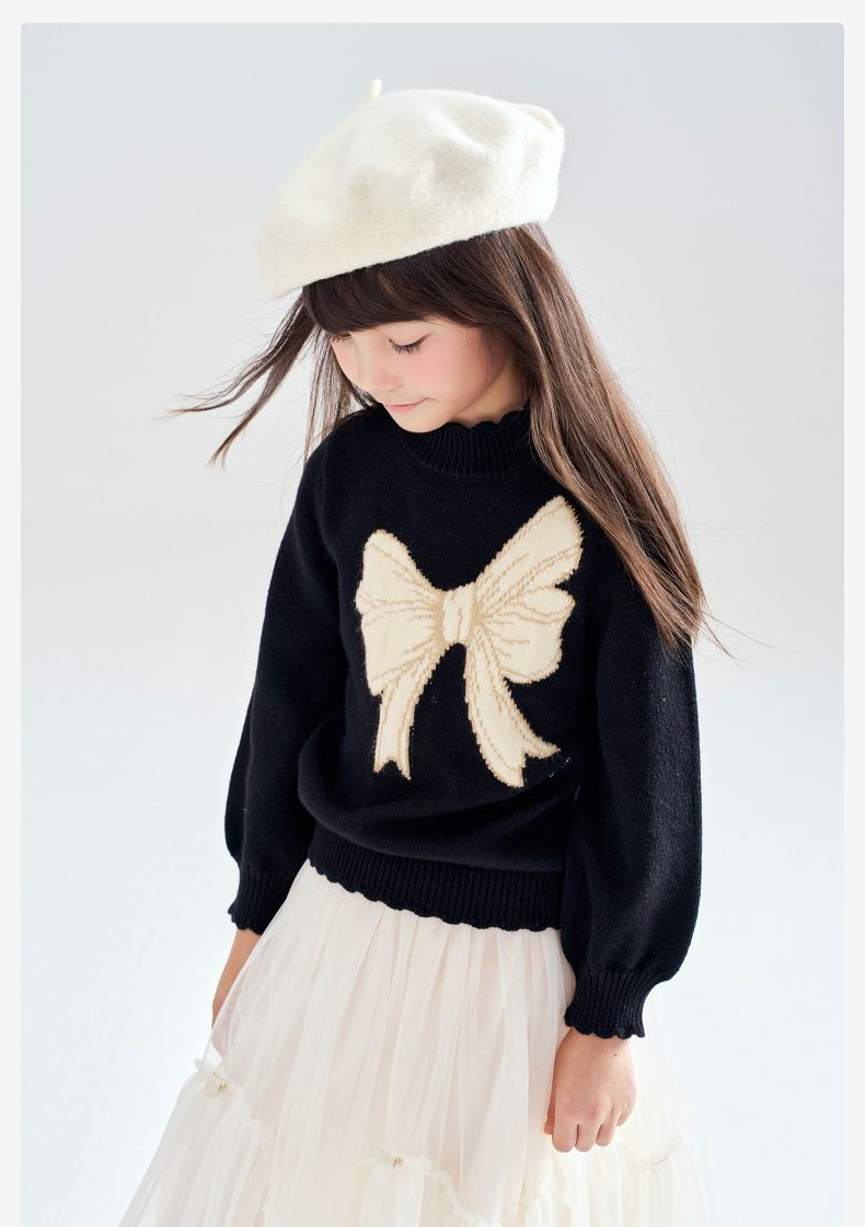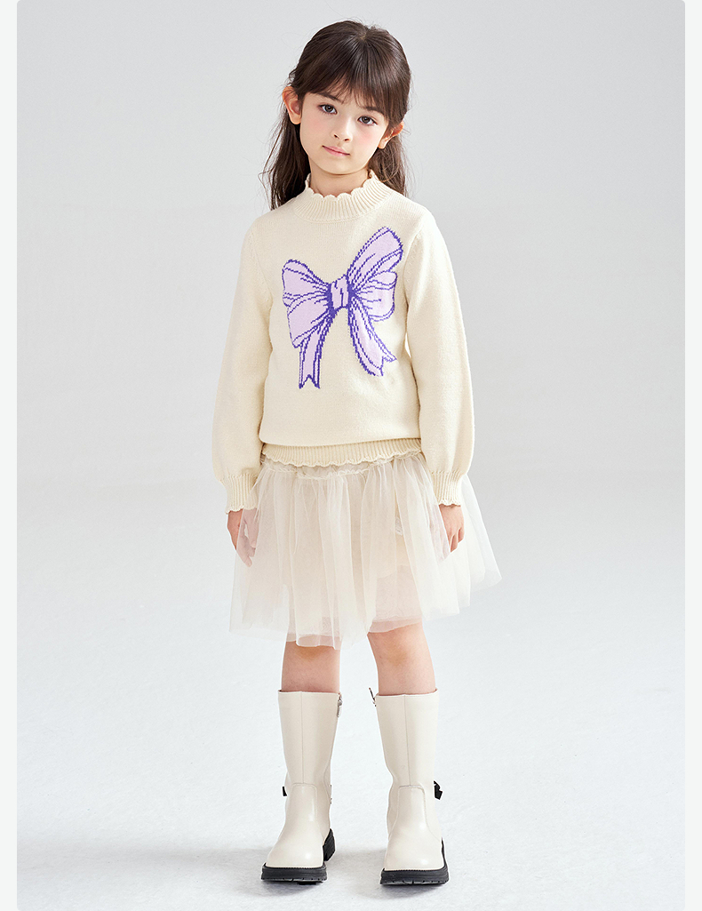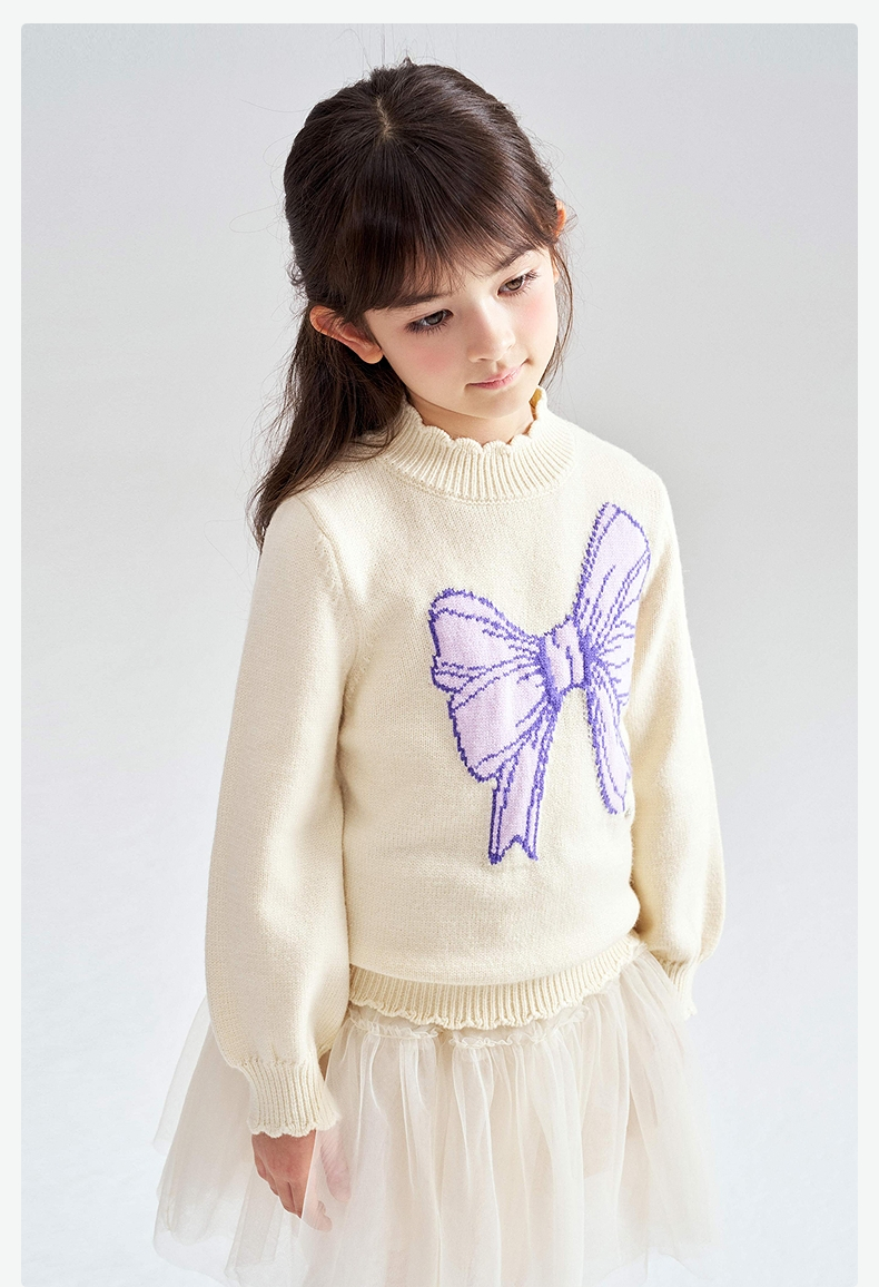 笛莎Deesha 2025冬季新款女童甜美蝴蝶结提花半高领套头针织衫