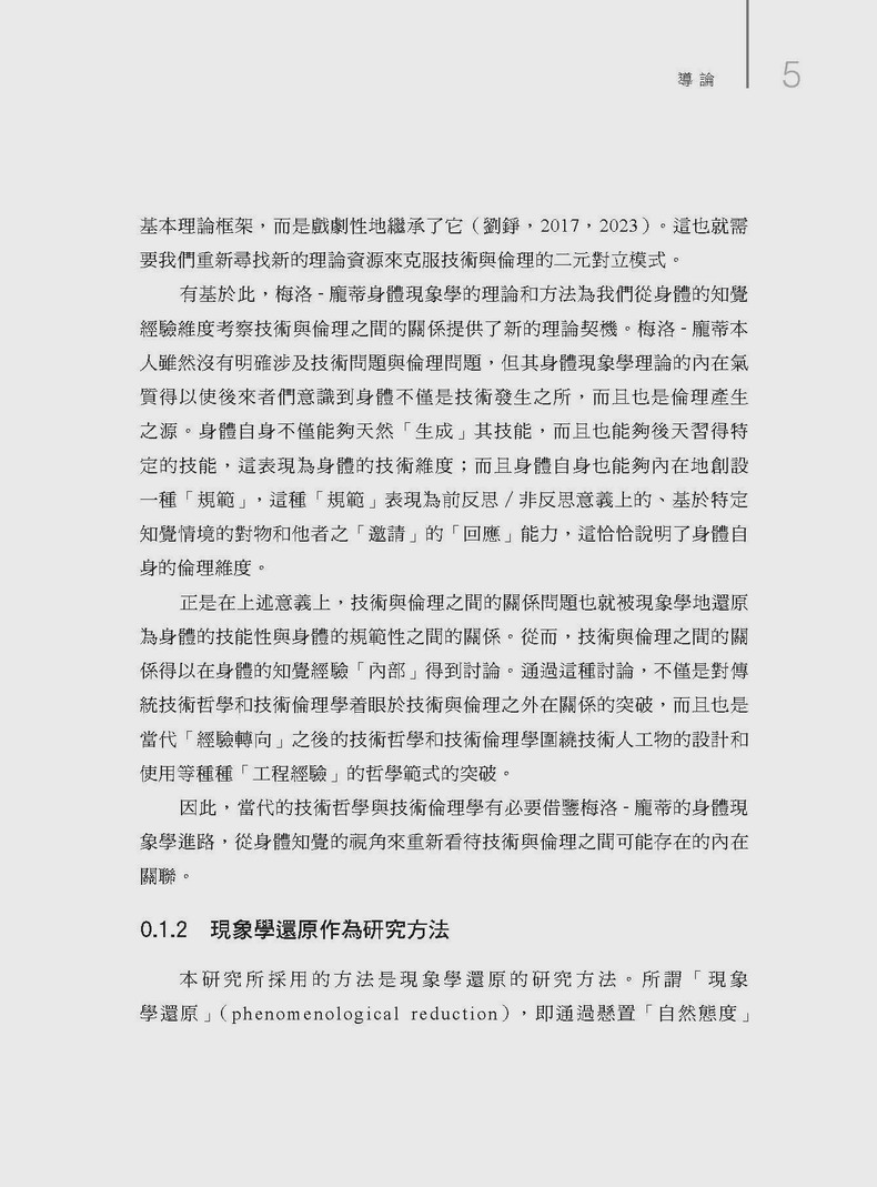 本書通過對梅洛- 龐蒂身體現象學的闡釋,試圖在源初身體知覺層面建立技術與倫理的內在關聯,將身體的源初知覺規範情境作為倫理的現象學源頭,將身體在知覺層面的源初技能性作為技術的現象學源頭。通過將技術與倫理的關係回溯到源初身體之中,不僅論證了技術與倫理在身體當中的同源性,而且也運用身體的可逆性解釋了源初倫理和源初技術的內在運作與相互分化機制。