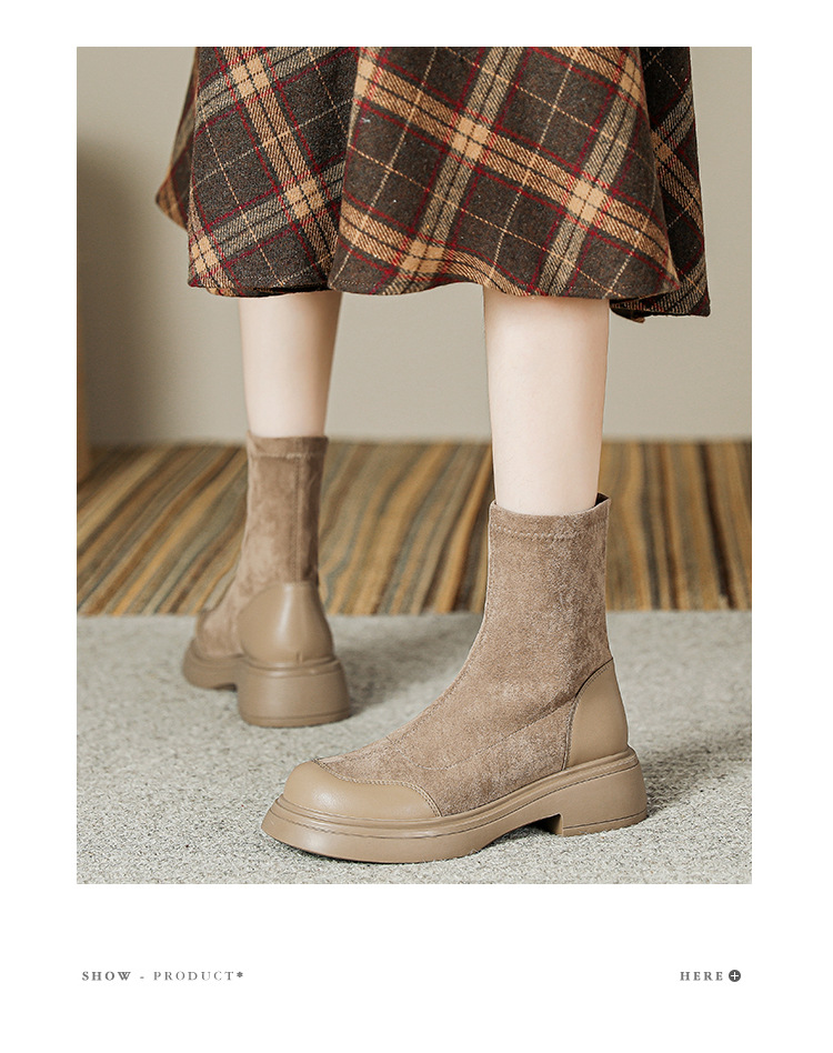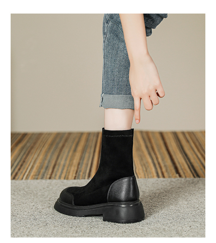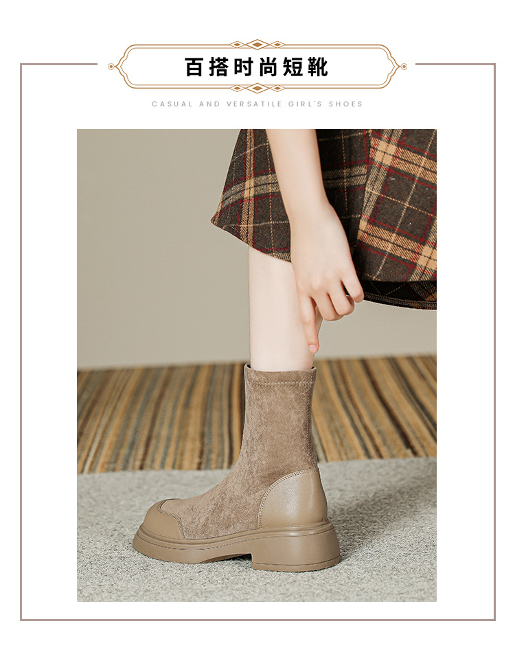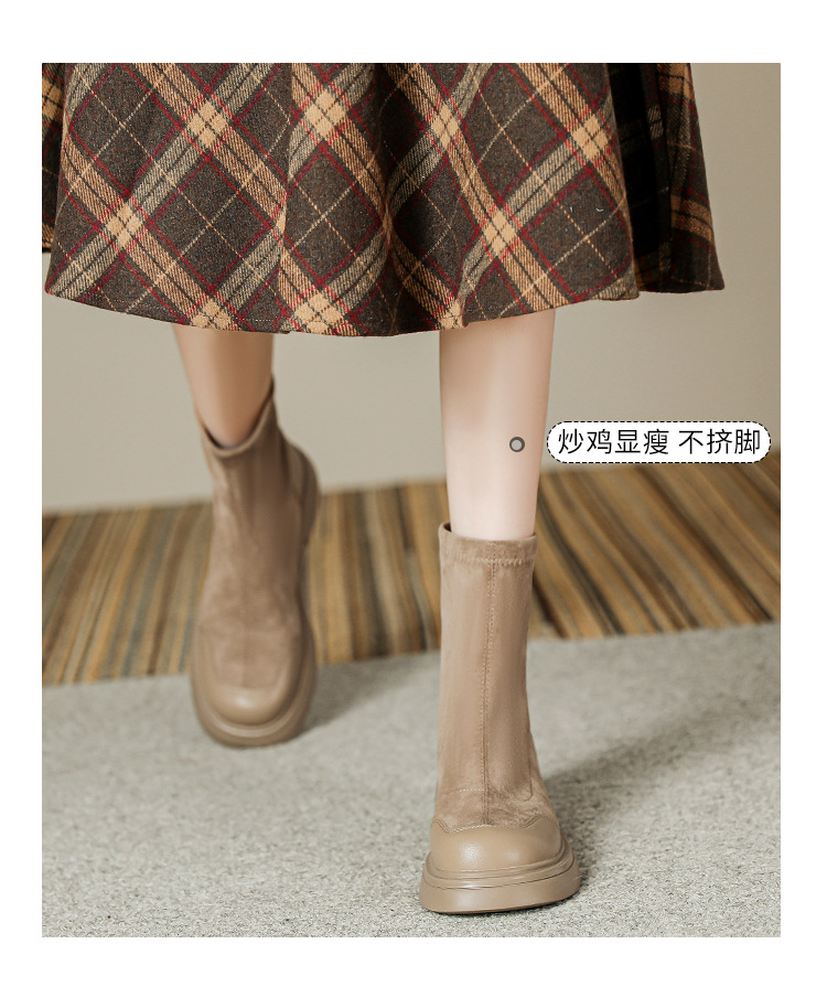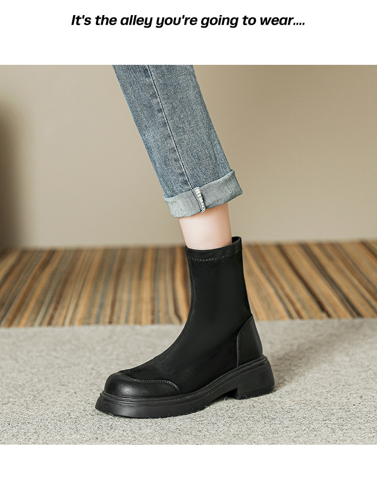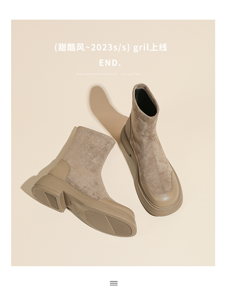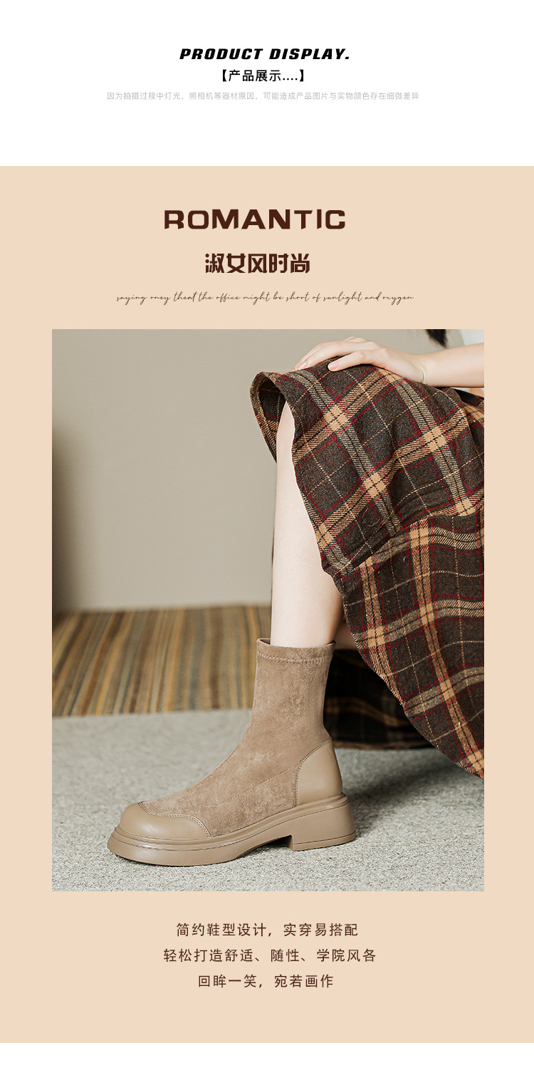 丝滑质感绒面短靴女2023新款复古英伦风圆头弹力短筒靴子女瘦瘦靴