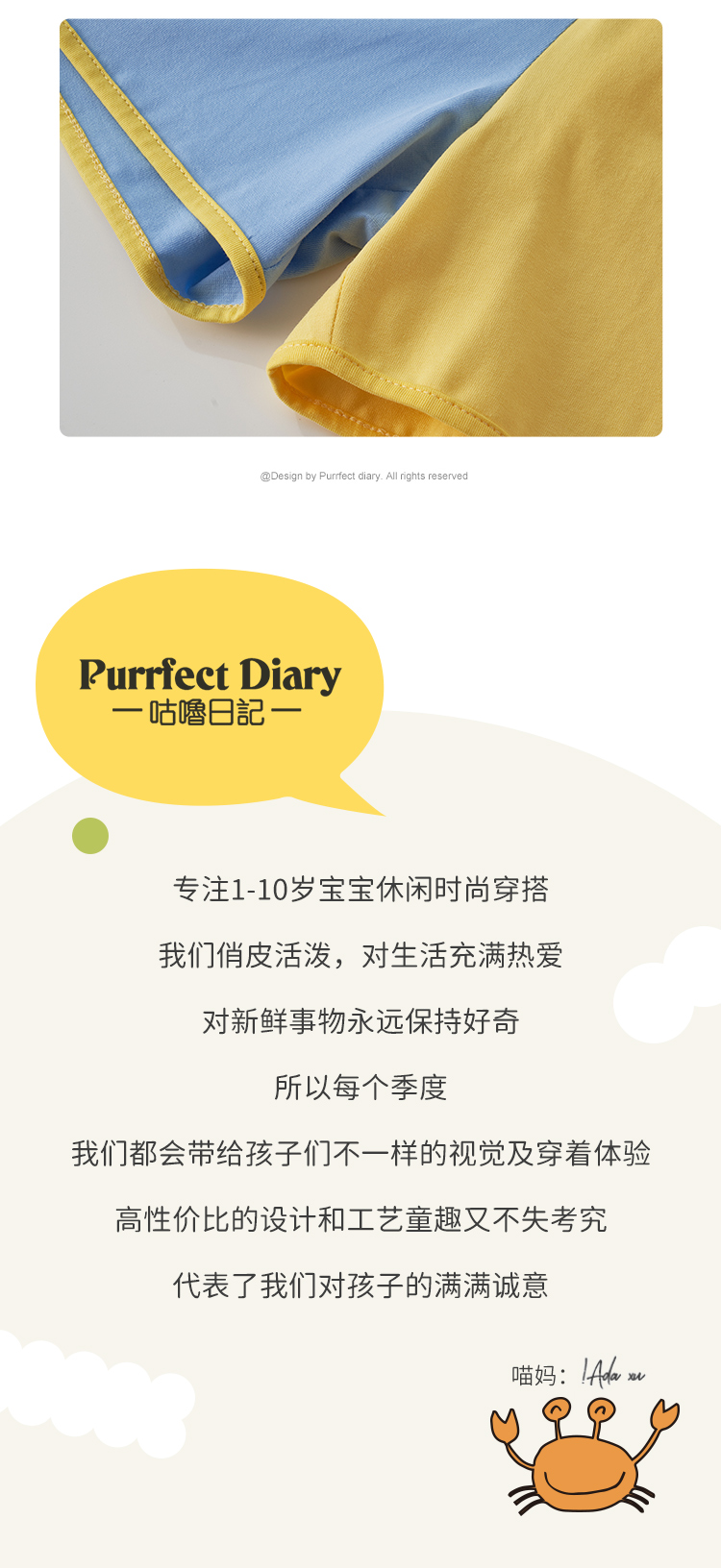 Purrfect-Diary专注于贴近自然随性的穿着概念,轻奢平价的童装文化传播,在产品设计上更加注重婴童穿着的舒适性、安全性、更出众的国际化品牌,将欧美的育婴文化在中国进行深入的传播与推广。