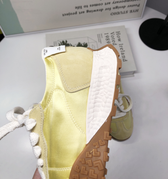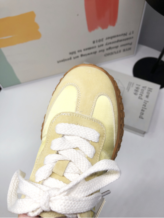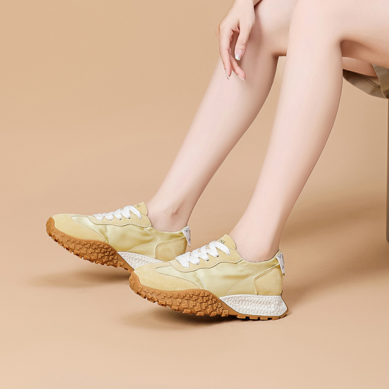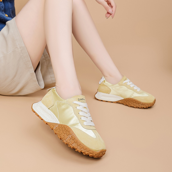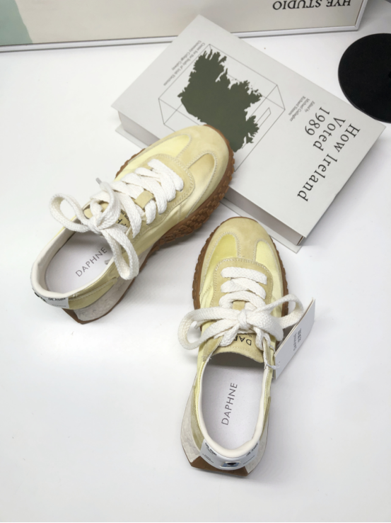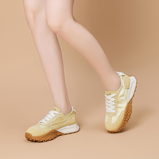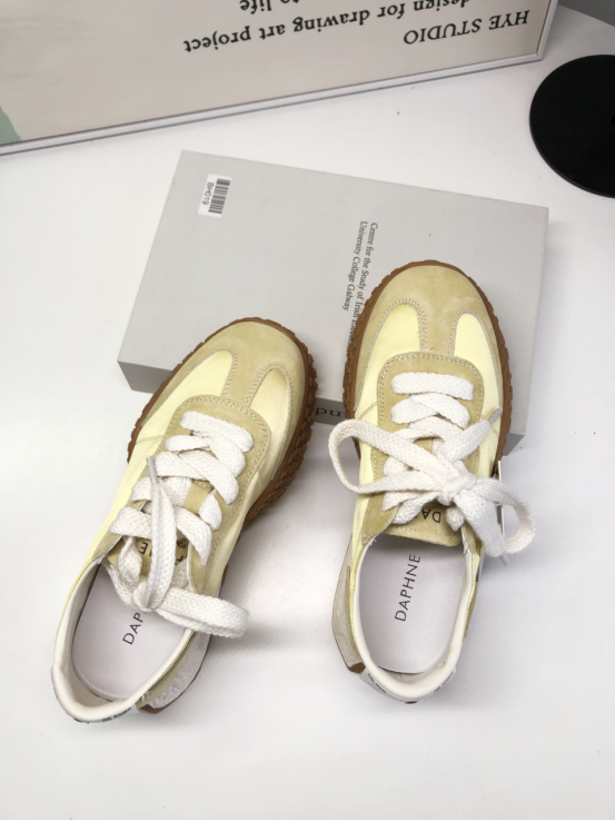 达芙妮厚底薄款透气阿甘德训鞋 🔺层次拼接鞋面,透气耐磨,防撞鞋头,舒适护趾 🔺舒适内里,轻盈细腻柔软,裸感上脚 🔺4.5cm舒适增高厚底,轻松迈步无负担 ➖➖➖➖【模特上脚图】➖➖➖➖ 🖤黄色/米色/粉色