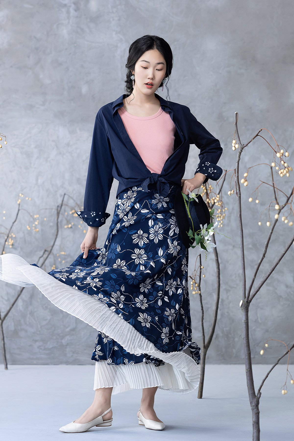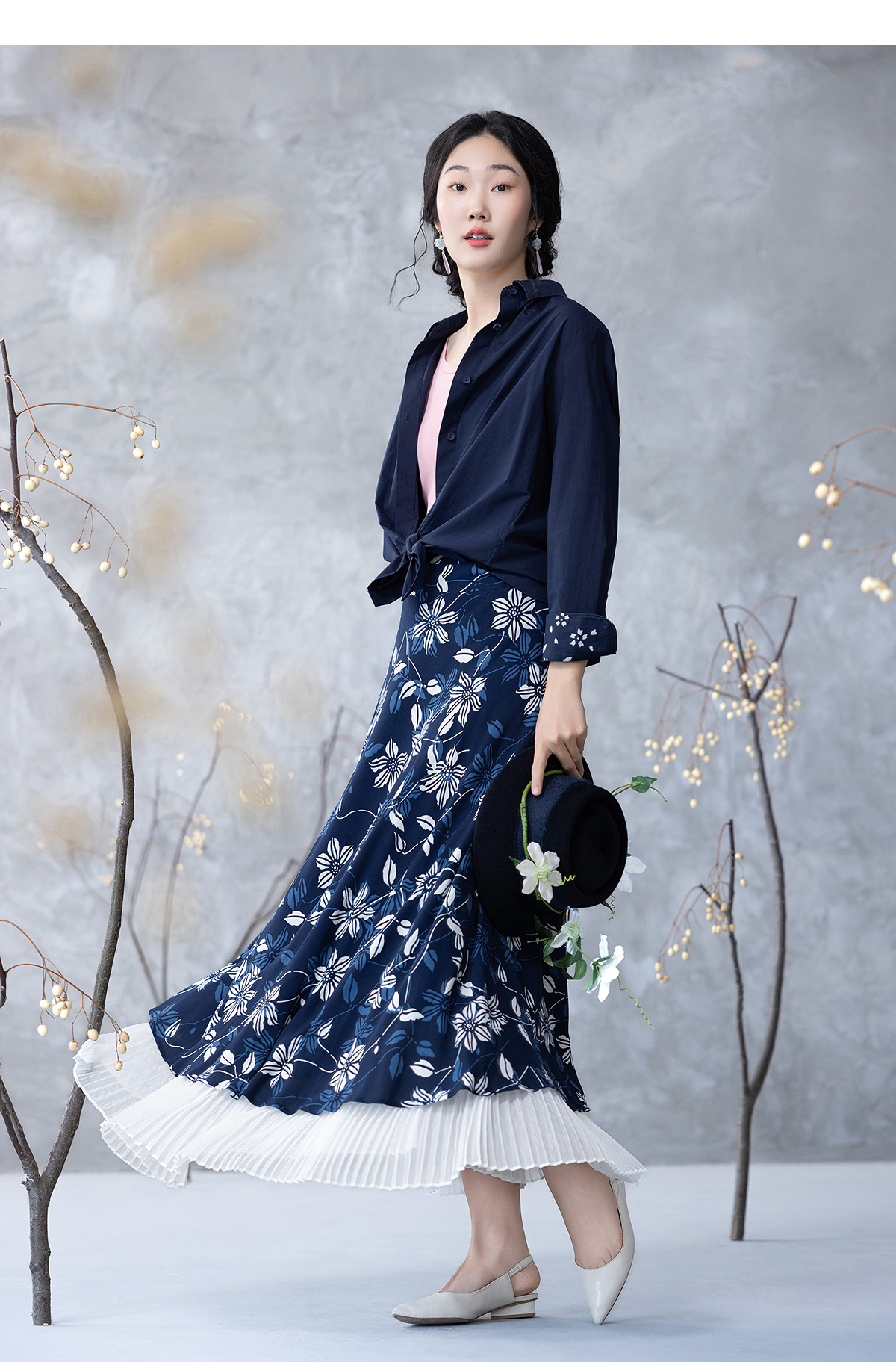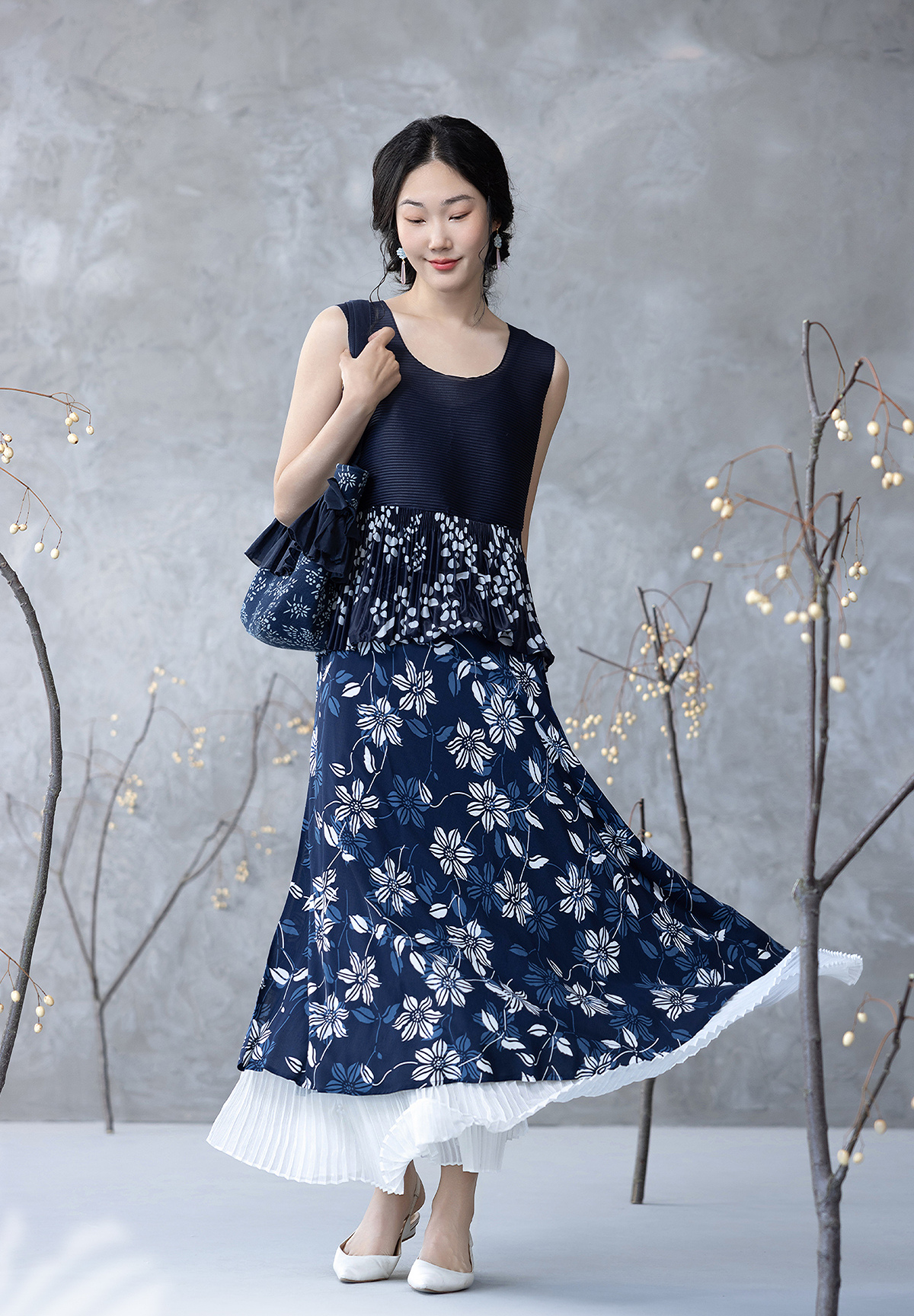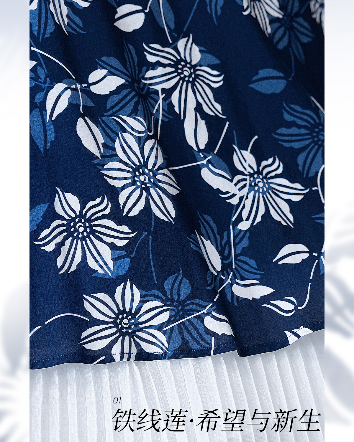 【林栖设计小店】【多种穿法】(部分尺码现货)传统蓝印花铁线莲花纹半身裙一片式系带宽松层次感2025夏季新品裙子女1952130