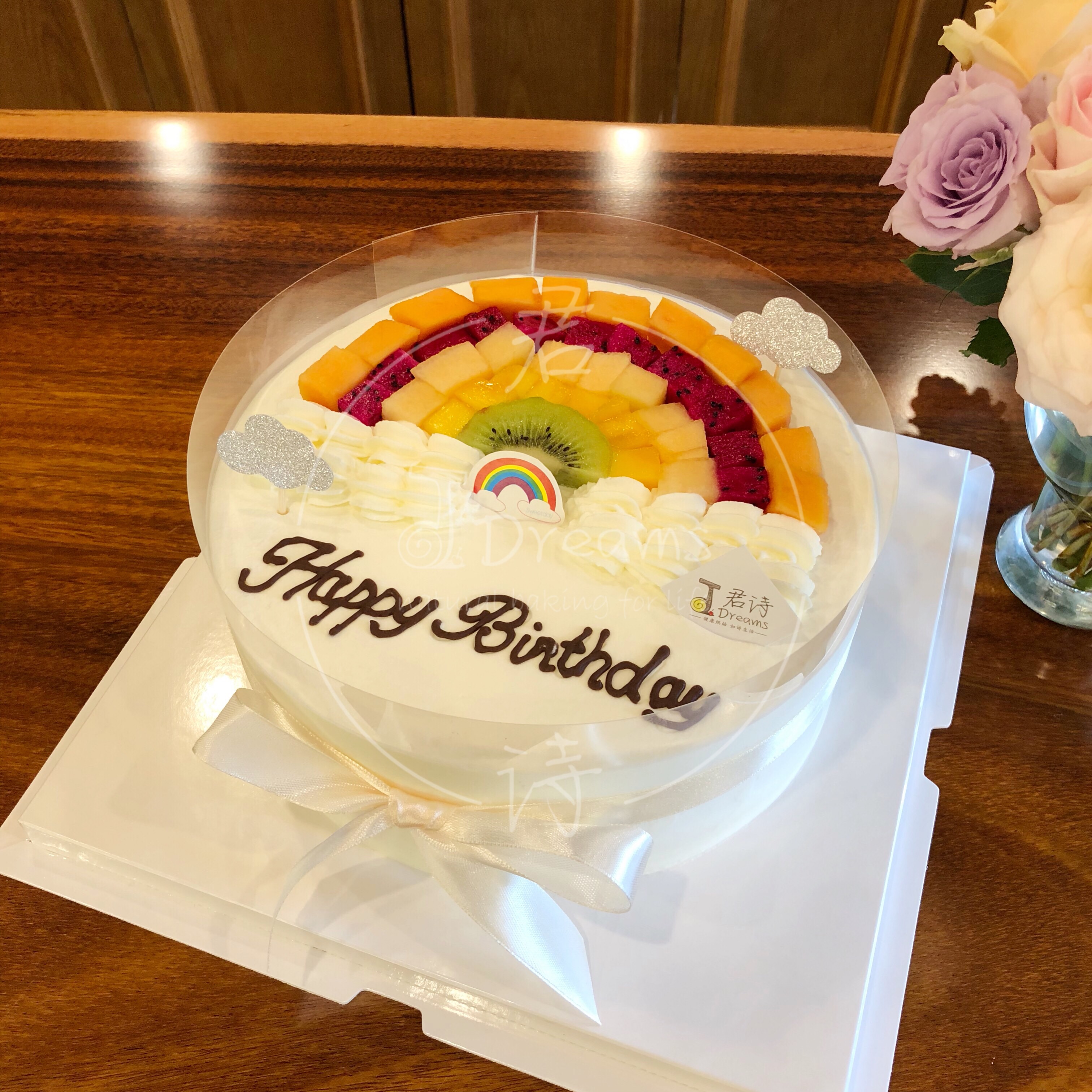 表面为各种应季新鲜水果,不一定和图片一致,根据季节改变。水果组成的彩虹,造型简单大气。