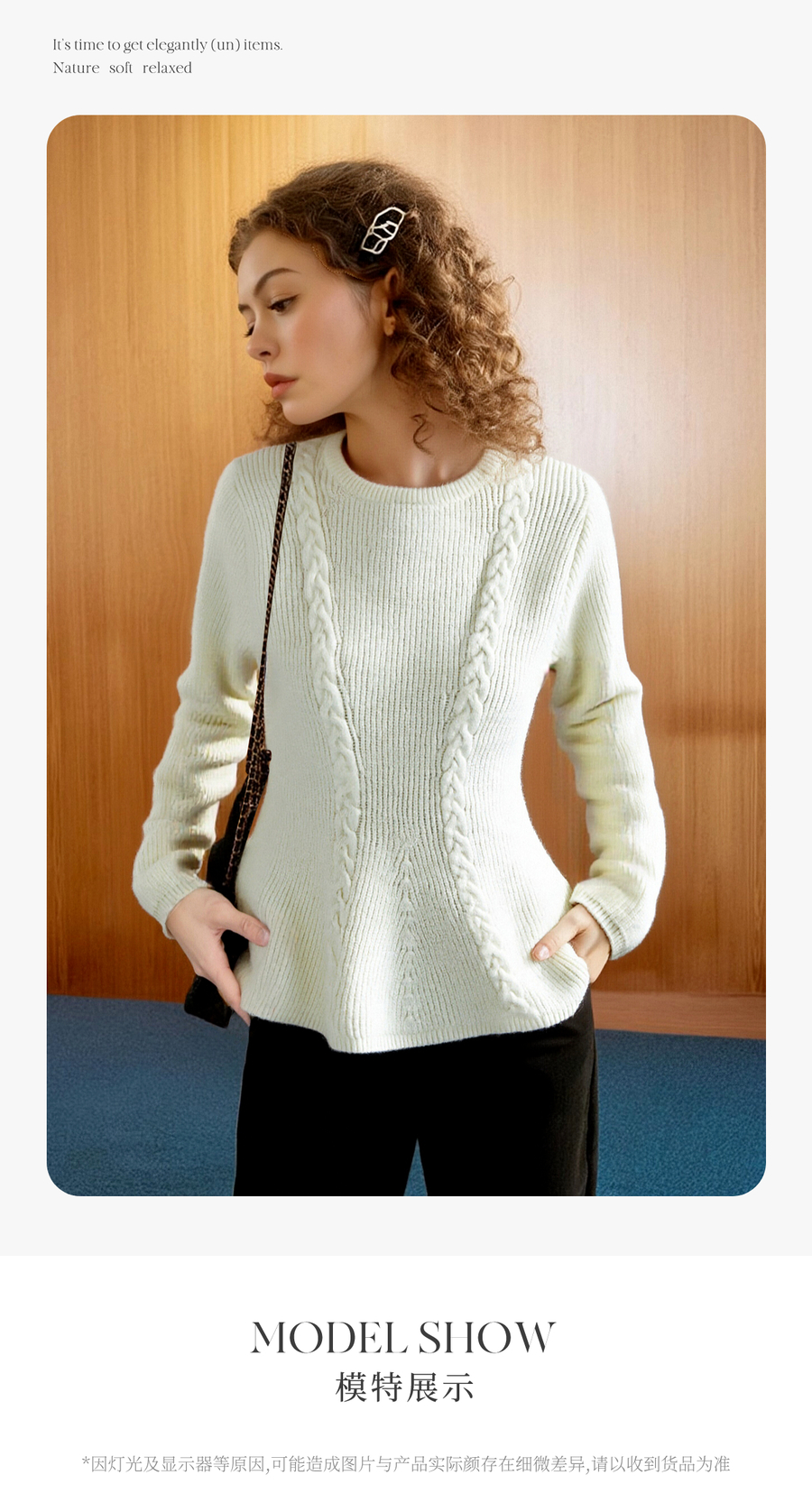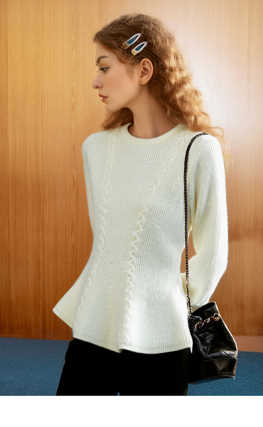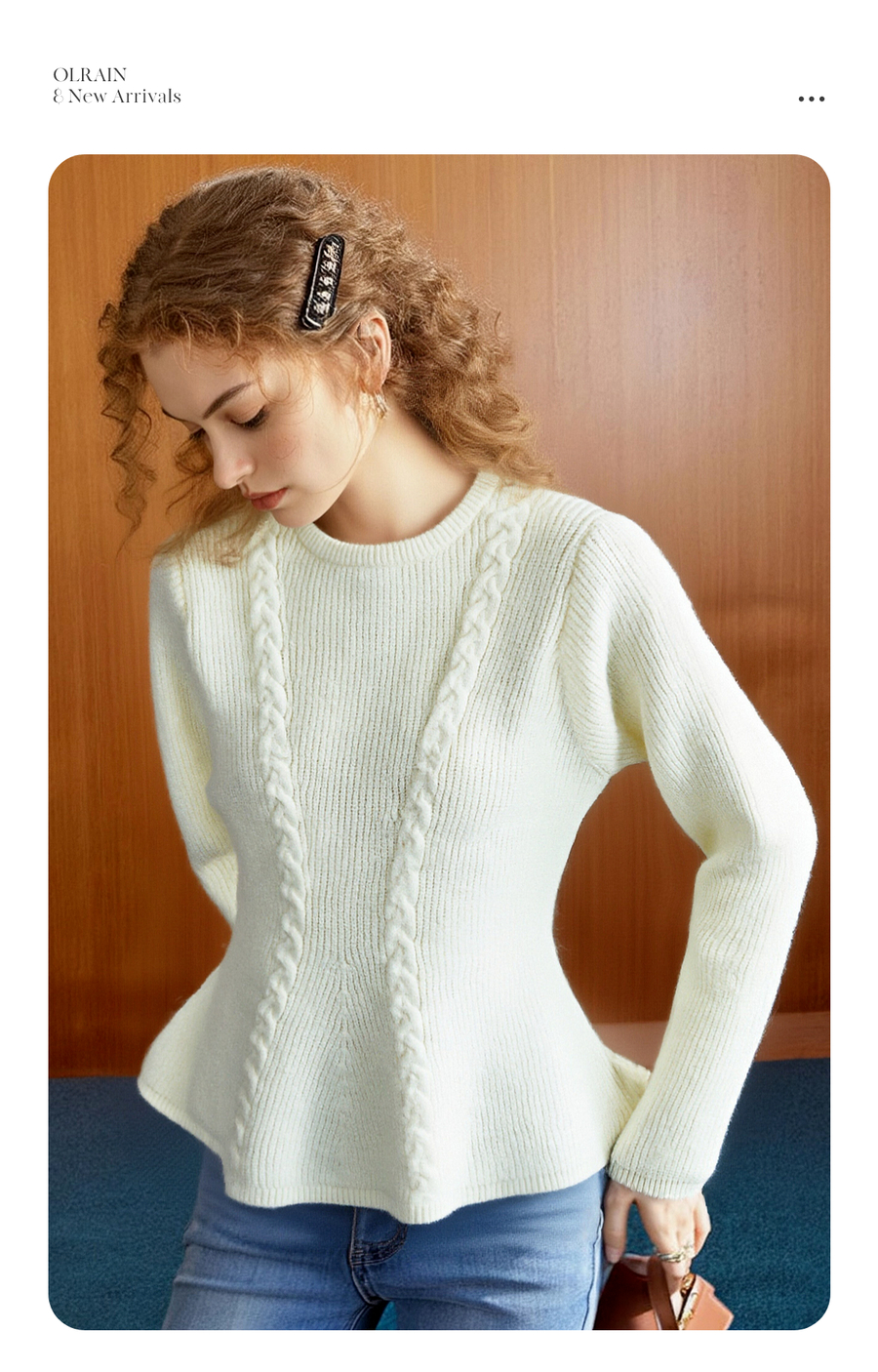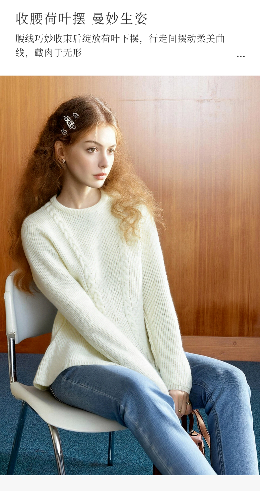 简约磨毛圆领收腰叶边针织打底衫女冬季法式纯色显瘦休闲套头毛衣