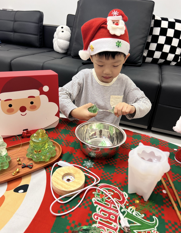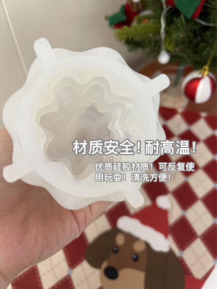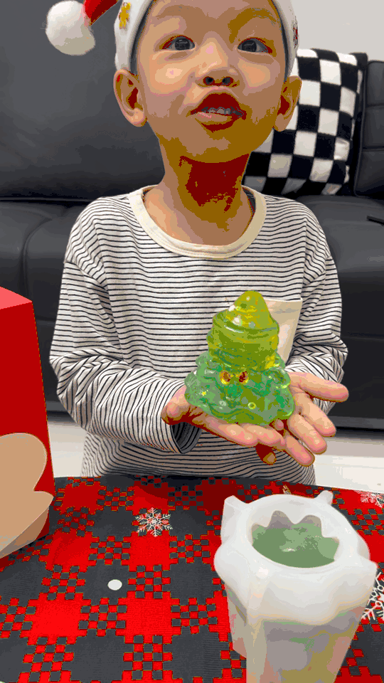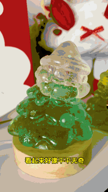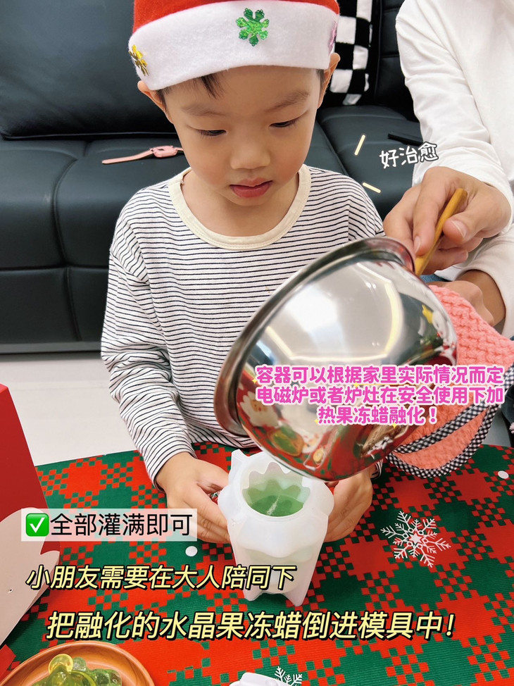 简单的操作视频可参考如下! 1.准备个小锅,先取小部分果冻蜡用剪刀剪成小块,方便更快速加热融化。 2.降融化的果冻蜡以次倒进圣诞硅胶模具中(搭配的颜色是绿色为主色,白色或者黄色为点缀色) 随机搭配50g果冻蜡,可以做成品一只有余。 3.倒入模具中,自然静止等待3-4个小时冷却成型即可脱模(过程中注意指甲不要戳到成品) 4.给自己的圣诞果冻灯加上闪粉,小铃铛或者小领花等装饰。 5.把它放在usb灯座上,注意不要使用快充头!打开开关就是一个水晶圣诞果冻灯了! 当小夜灯或者氛围灯超好看的!