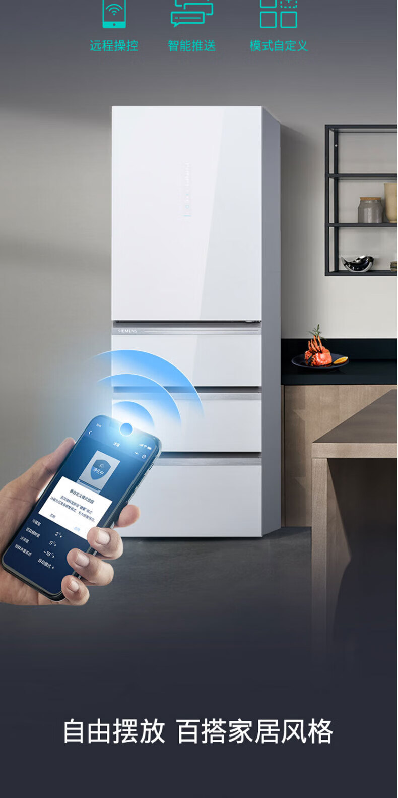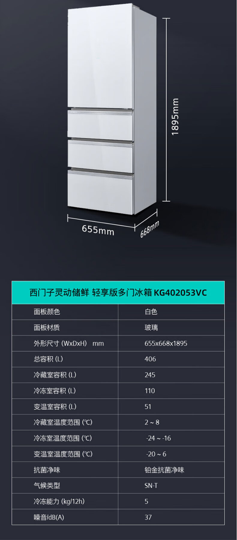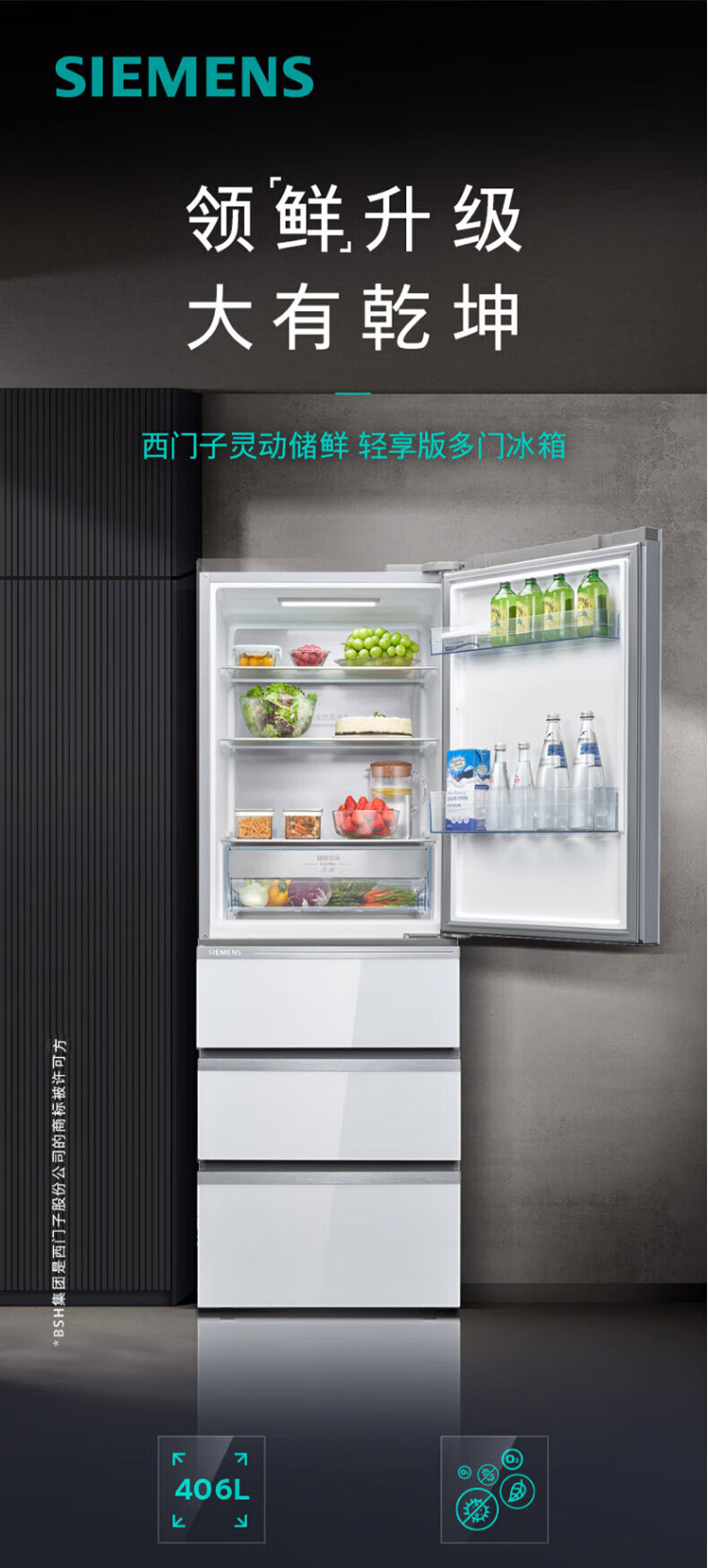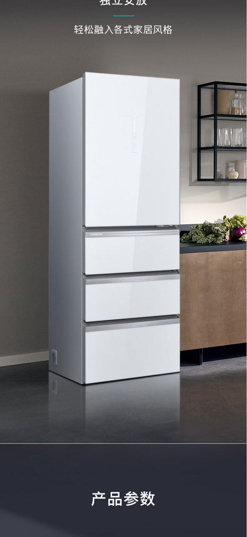 西门子(SIEMENS)406L大容量多门四门冰箱 铂金净味百变储鲜一级能效风冷无霜纤薄可嵌入电冰箱玻璃面板KG402053VC