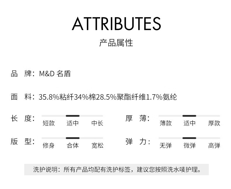 | 风格: 通勤风,商务休闲 | 材质: 棉35.8%,再生纤维素纤维35.8%,涤纶(聚酯纤维)26.9%,氨纶(聚氨酯弹性纤维)1.5% |