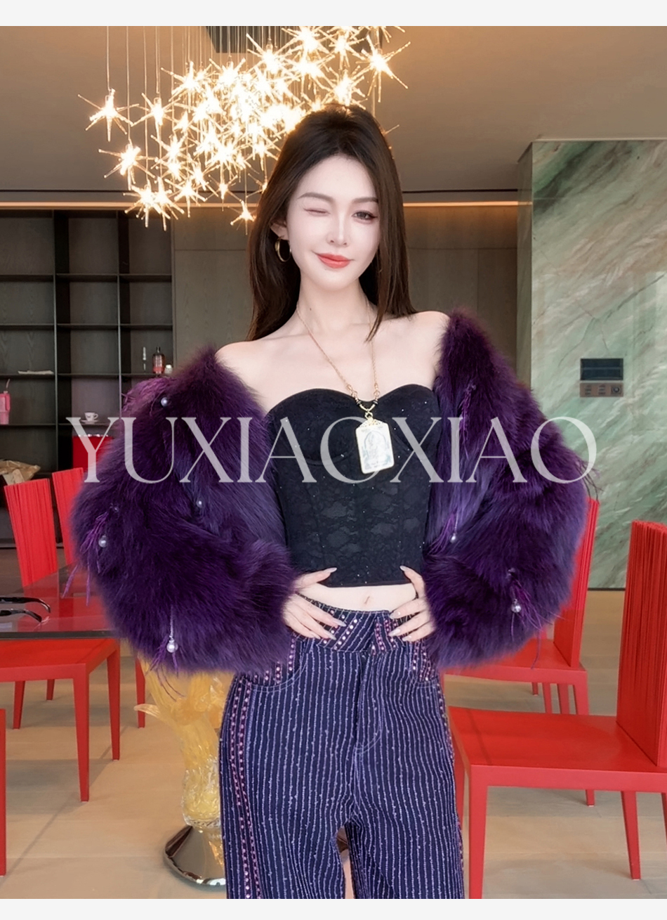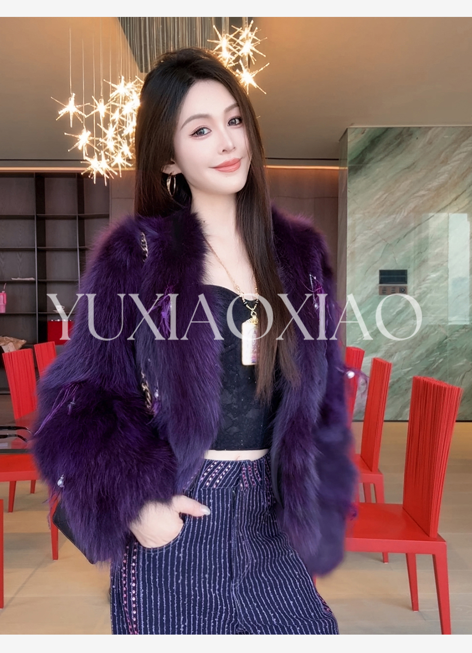 余潇潇【魅惑甜心】重工高级感定染色拼接绵羊皮小V领狐狸皮草