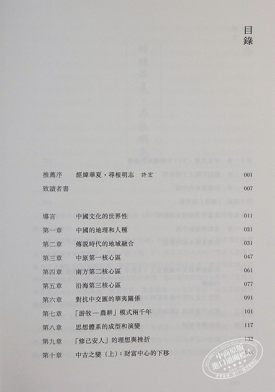 在超越五千年的長程敘述中,作者借由對區域文化如何交纏為一,以及中國如何應對來自外界之衝擊的細緻分析,最終揭示了華夏文明能夠延續至今,並將綿延永在的核心與奧秘,以赤子之心瞻見了一個有根底和方向的中國。