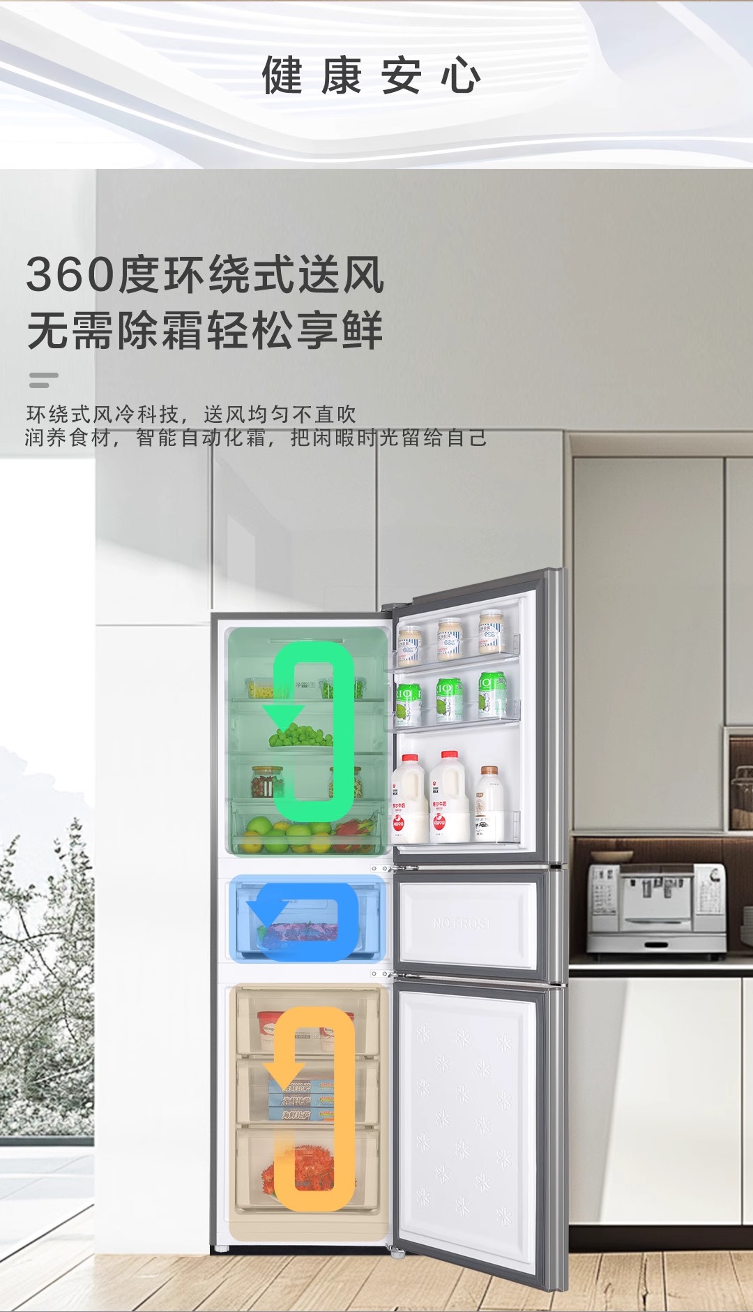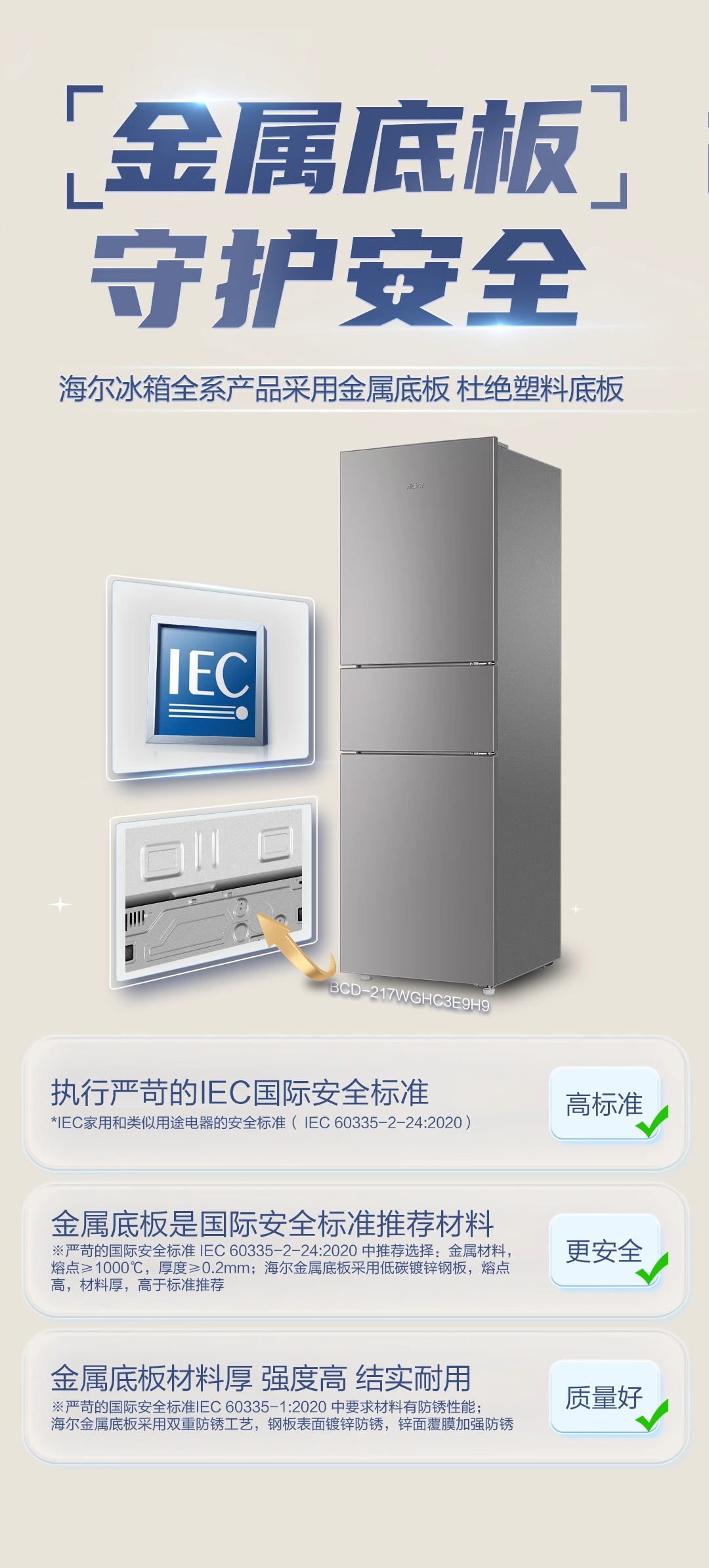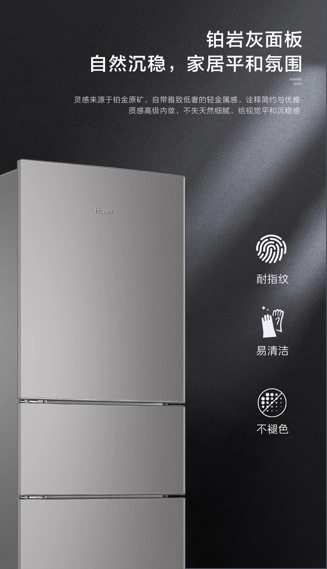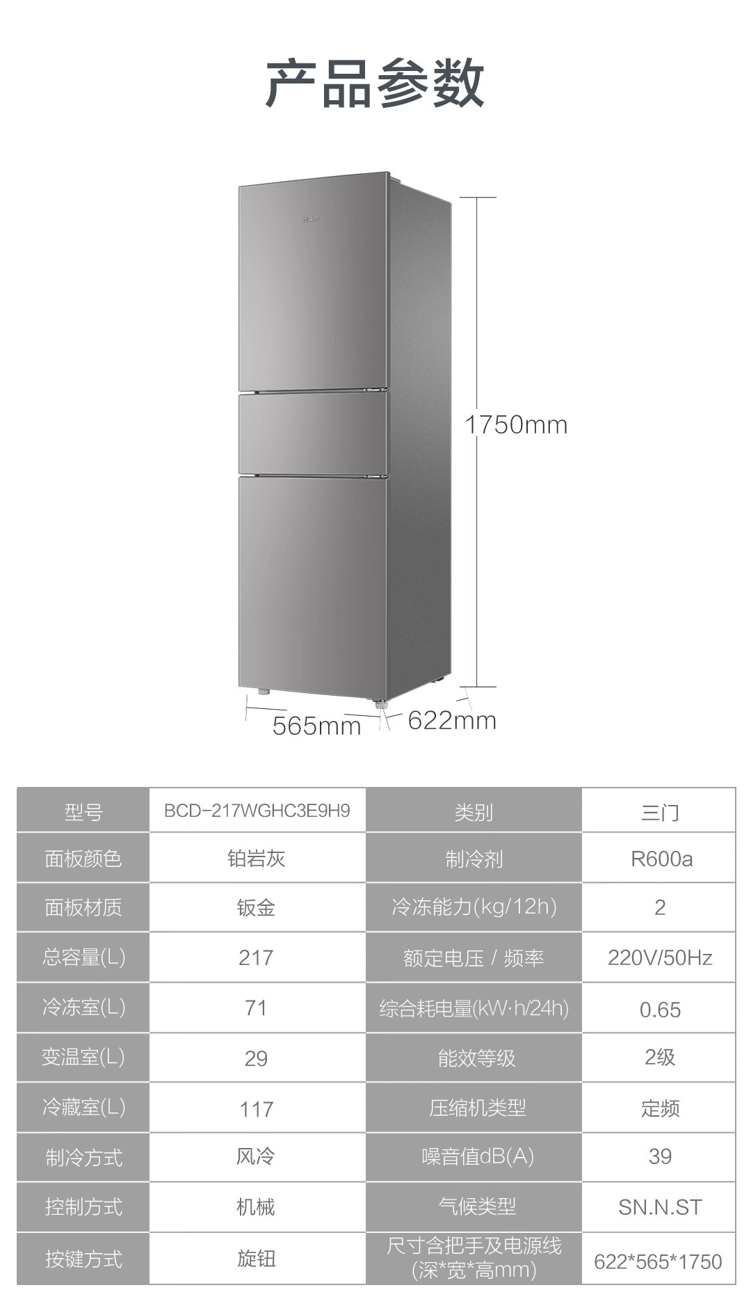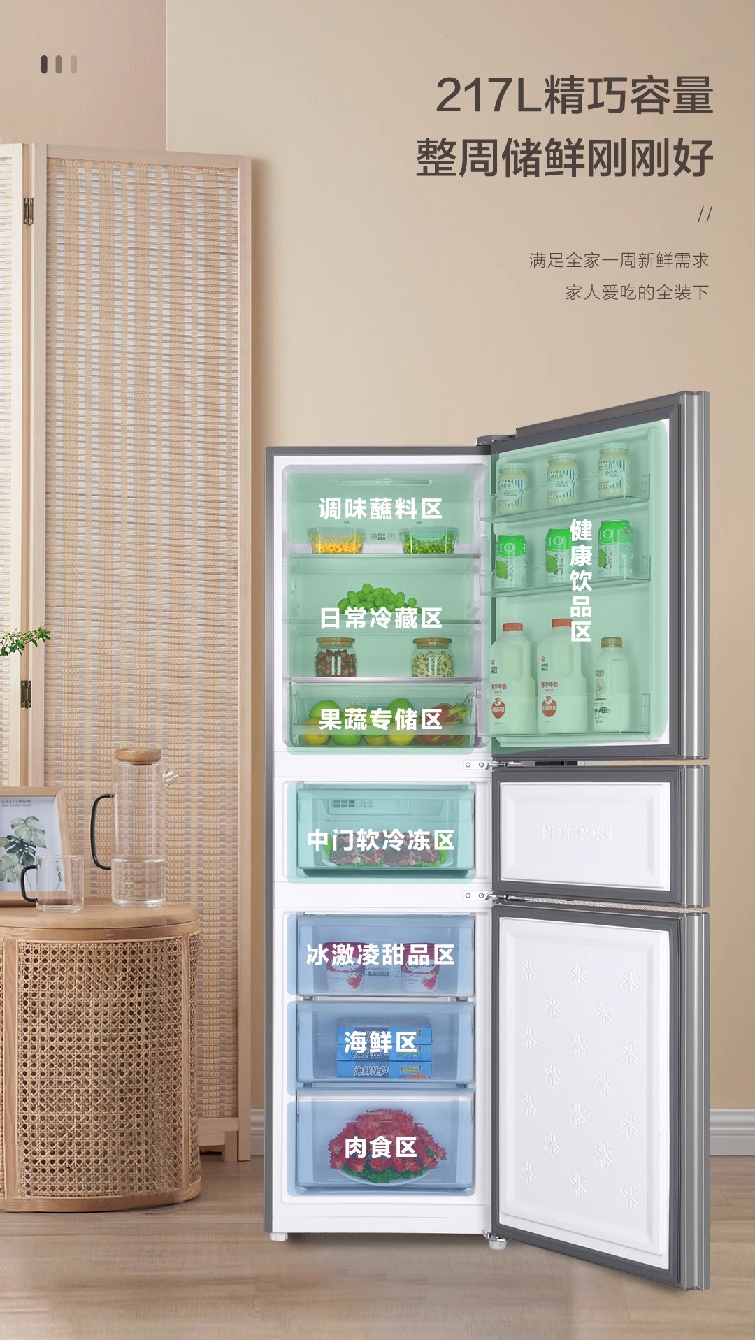 海尔三门三温区DEO净味中门软冷冻风冷无霜电冰箱 217升BCD-217WGHC3E9H9