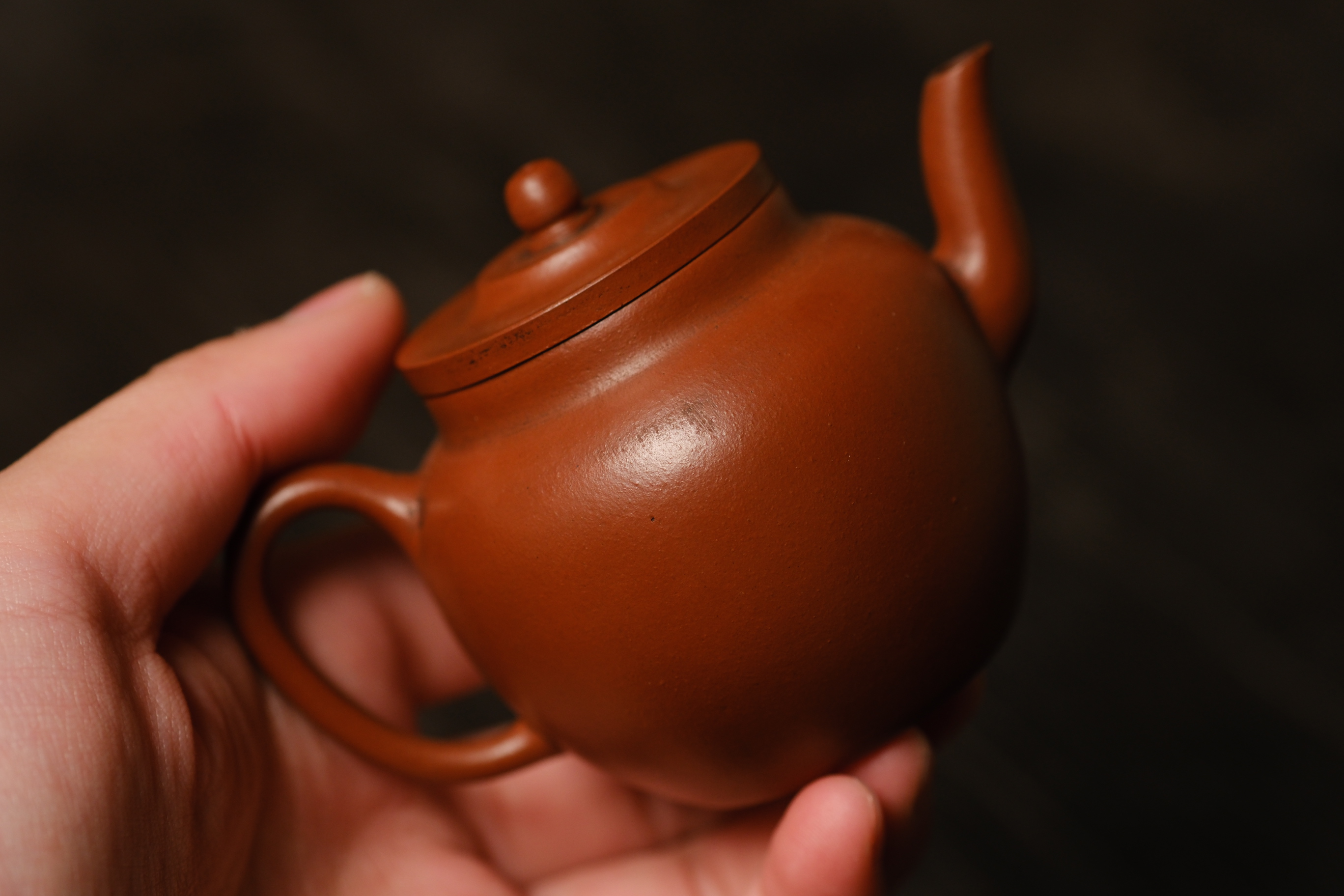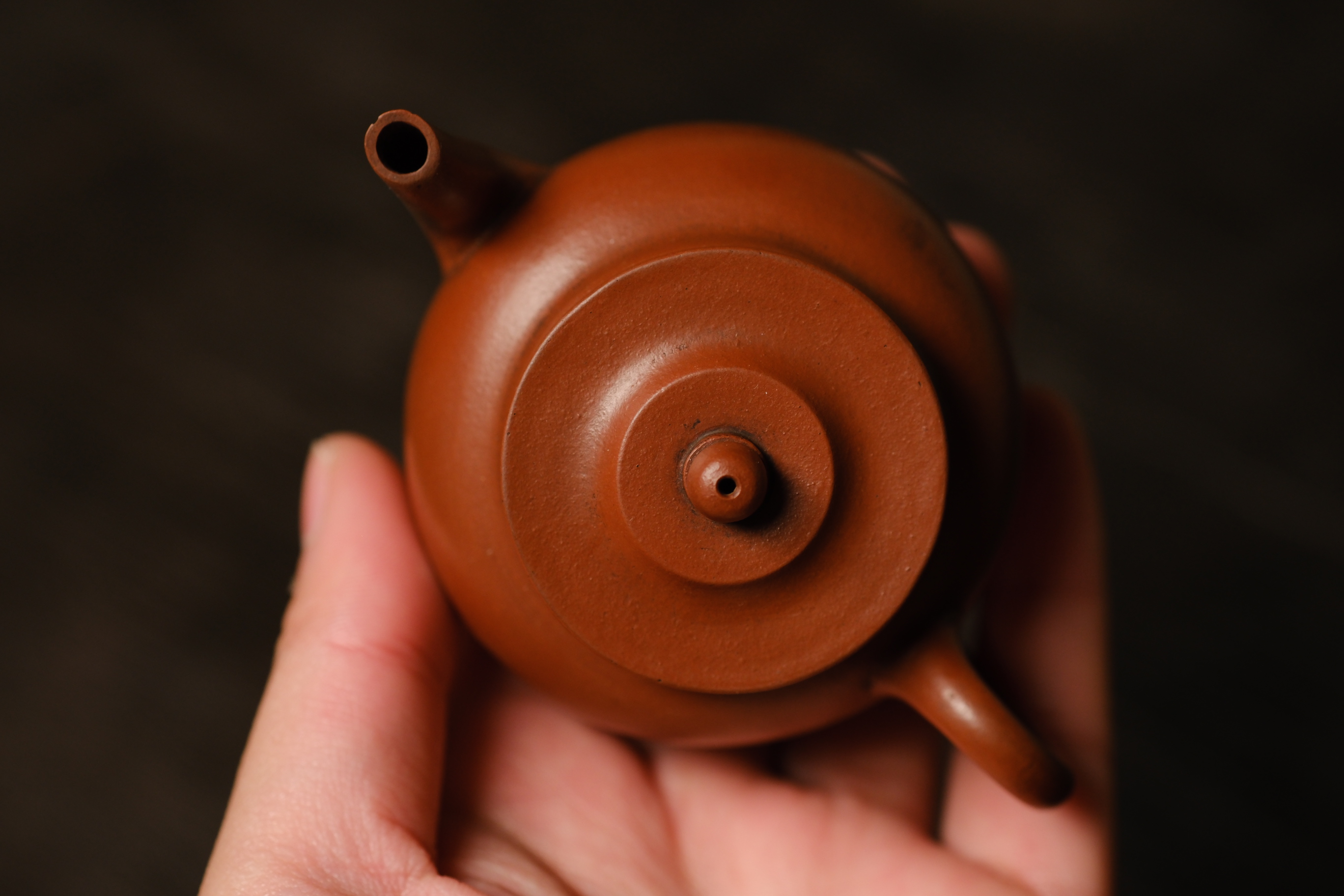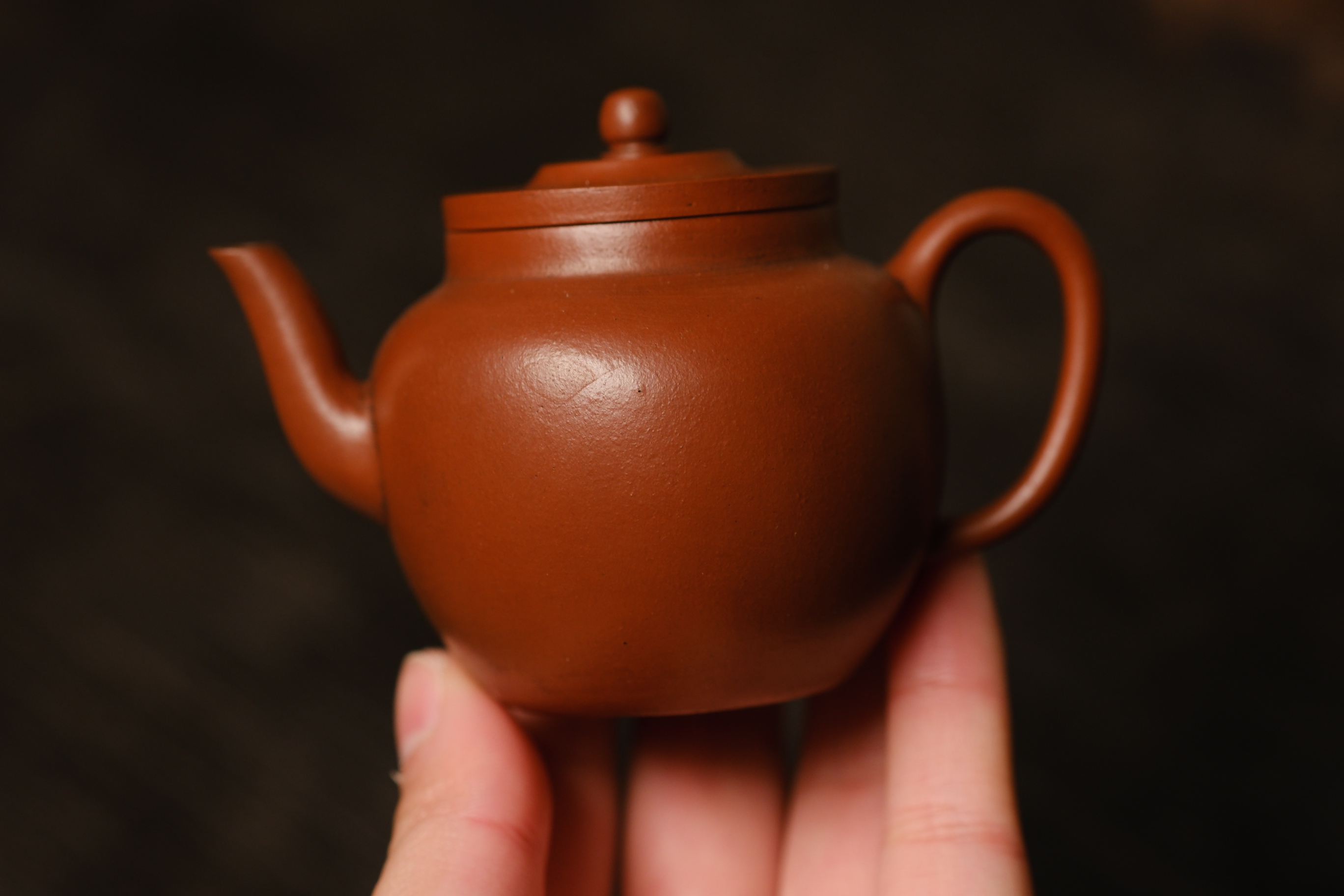 此壶采用早期老朱泥制作,这种泥料色泽古朴,质感油润,透气性极佳。老朱泥的独特质感使得文人宫灯壶在触感上更加细腻滑爽,同时其透气性也保证了泡茶时茶水的口感更加醇厚自然。其形状模仿古代宫灯,线条流畅而优雅,整体造型端庄大方。壶身饱满圆润,壶嘴、壶把和壶盖等部件设计精巧,与壶身相得益彰。