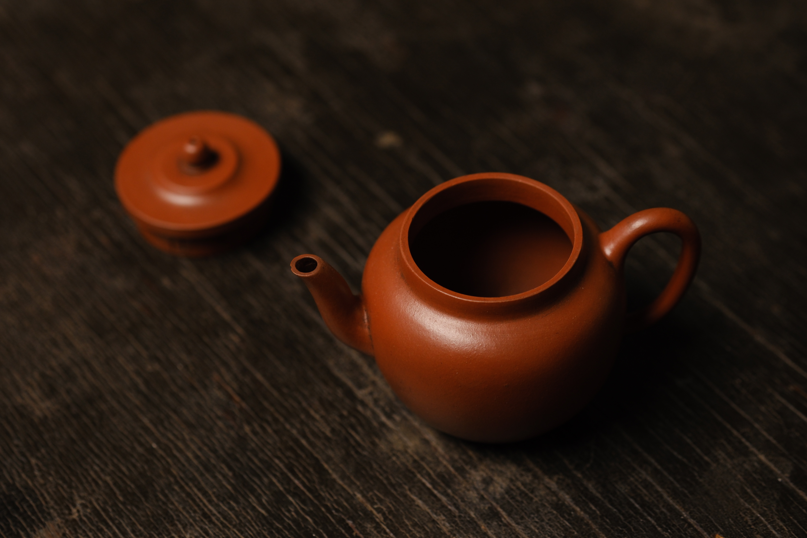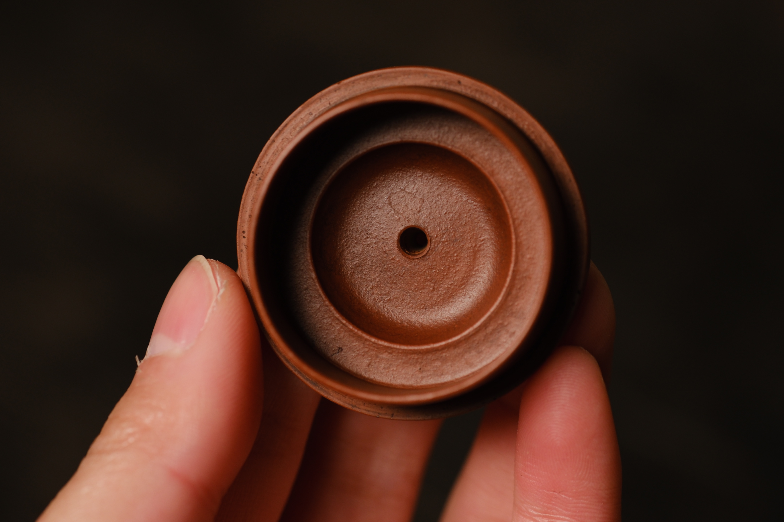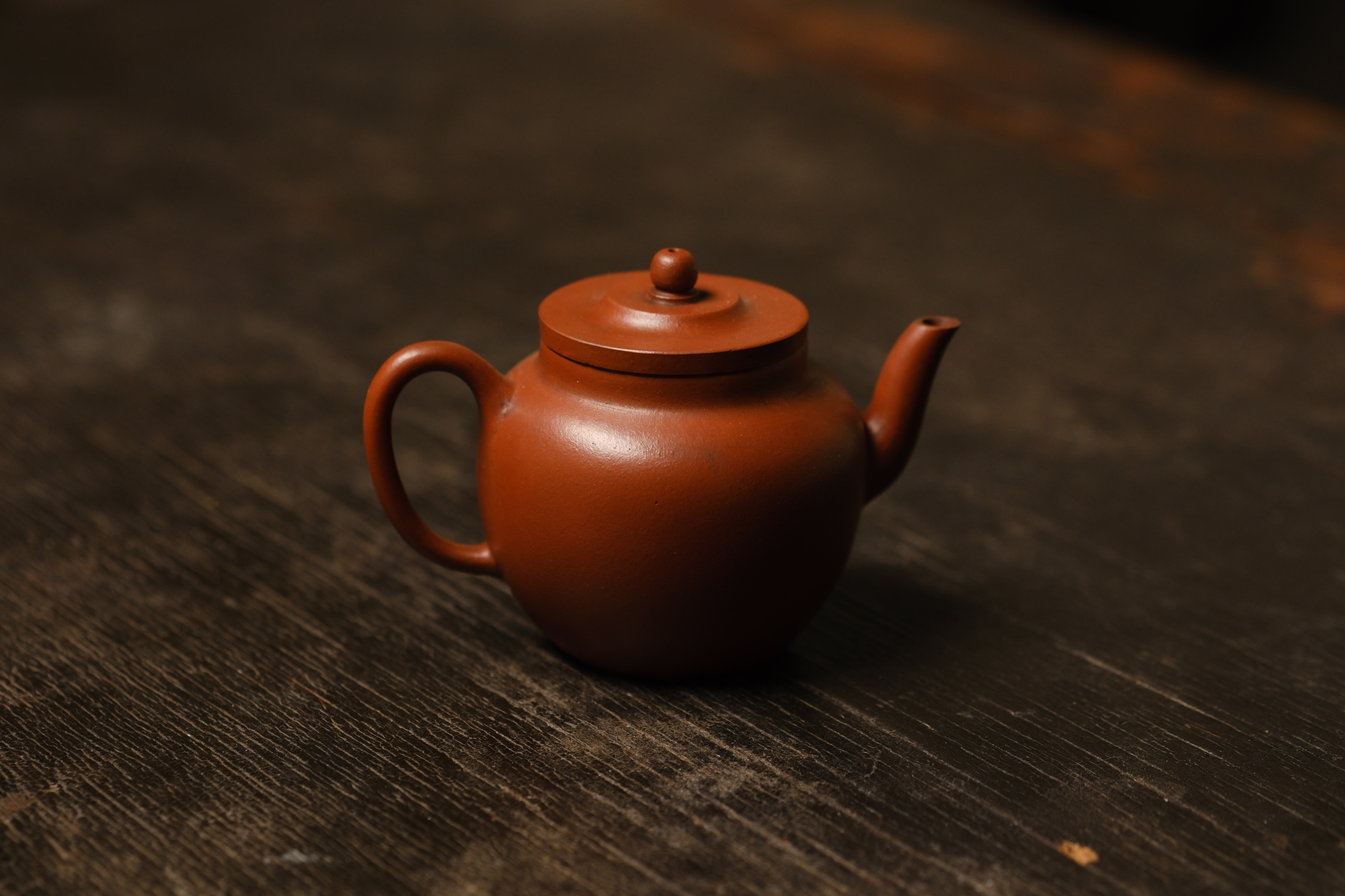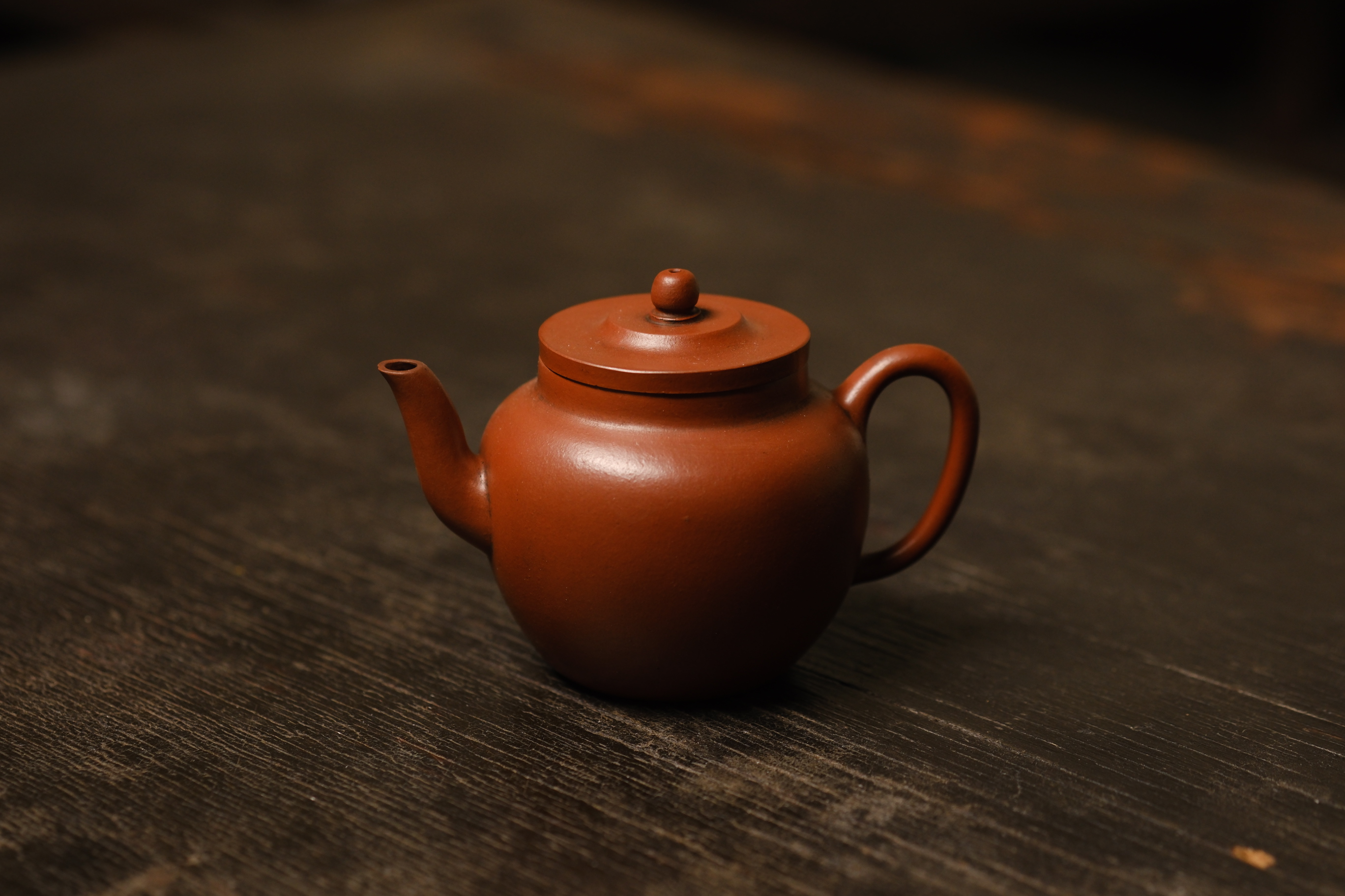 此壶采用早期老朱泥制作,这种泥料色泽古朴,质感油润,透气性极佳。老朱泥的独特质感使得文人宫灯壶在触感上更加细腻滑爽,同时其透气性也保证了泡茶时茶水的口感更加醇厚自然。其形状模仿古代宫灯,线条流畅而优雅,整体造型端庄大方。壶身饱满圆润,壶嘴、壶把和壶盖等部件设计精巧,与壶身相得益彰。