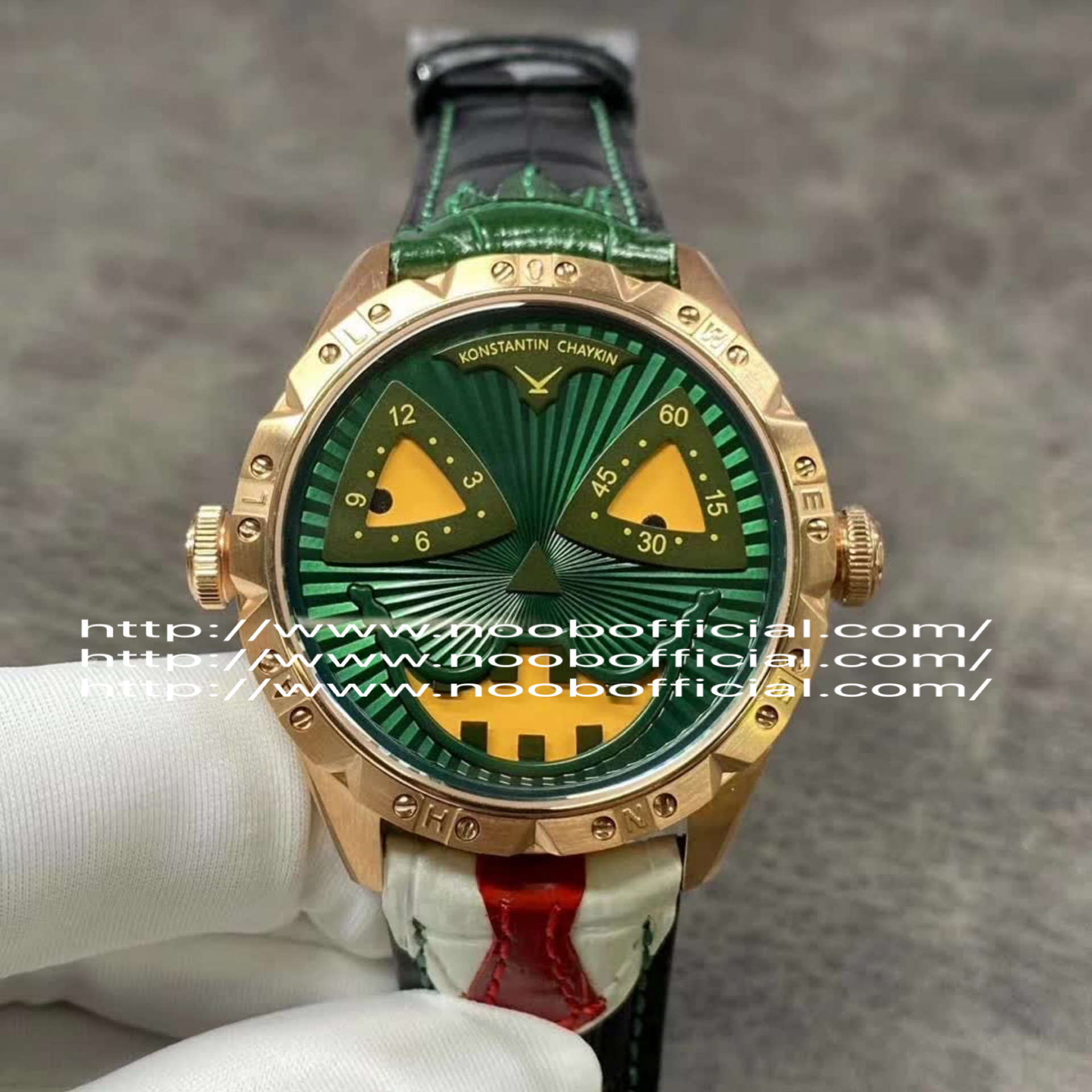 W俄罗斯小丑【最高版本V3S真功能快调月相】与原版同步,取得最大成功【没有任何盲区】全面升级【"突破"钟表行业年度大作】AHCI独立制表协会主席康斯坦丁·切金Konstantin Chaykin大师匠心之作【技术突破】表盘表情神采不断变化的小丑脸,转动的眼睛,疯狂的面容,和吐出的红色舌头,表情变化非常丰富,两只眼睛分别为分钟和小时的指示,月相显示(笑脸),每天有2万多种表情变化,幽默性质的独特的设计元素【表壳直径42mmX11.8mm与原装同步】采用进口(全自动精工机械)手表自制机芯,功能百分百同步原版,走时稳定,素质坚挺。整体细节圈口侧面精细CNC打磨耗时费力多次调整模具,确保神韵和感觉能与原装相媲美,满足您对俄罗斯小丑"笑脸"的一切美好情怀。