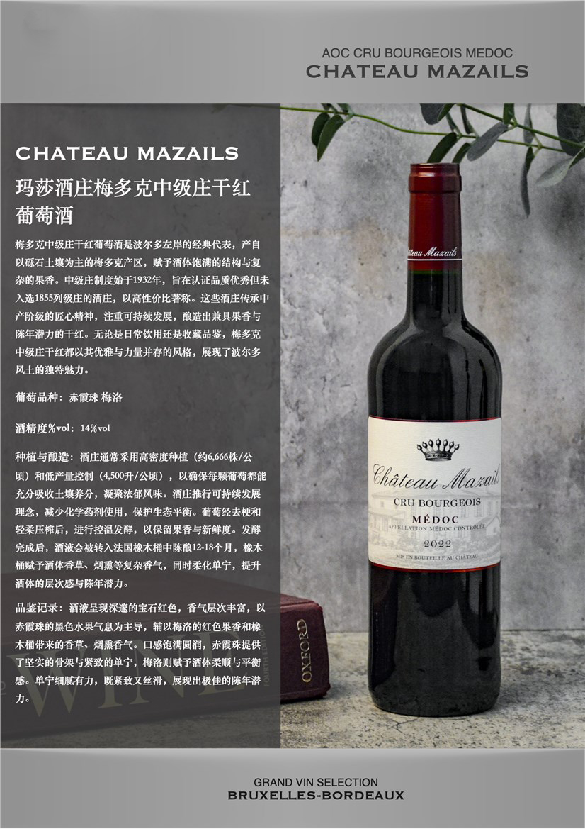 梅多克中级庄:波尔多左岸的品质之选在波尔多左岸广妾的葡萄园中,梅多克中级庄(CrusBourgeois du Médoc)犹如一颗璀璨的明珠,以其卓越的品质和悠久的历史传承,在葡萄酒世界占据着独特地位。这一始于1932年的分级制度,不仅是对优质酒庄的官方认可,更是梅多克地区酿酒传统的生动体现。
