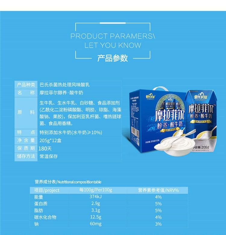 皇氏乳业 摩拉菲尔 水牛奶醇养常温酸牛奶(原味)205g*12 钻石装