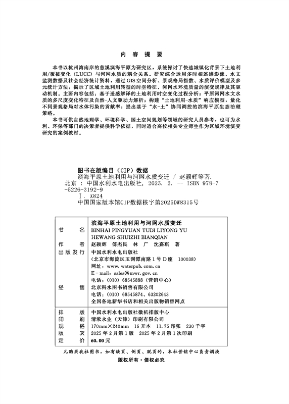 本书主要内容包括:建立了土地利用覆被变化的时空特征分析模式,定量分析和模拟再现了研究区土地利用覆被变化特征和动态演变过程。厘清了滨海平原河网水文、水质特征及其变化特点。通过对平原河网水体质量特征分析、河网产汇流及水量模拟、区域水体污染负荷调查分析以及生态调水措施影响分析,明确了滨海平原河网水文、水质特征及其变化规律。构建了“维度层-指标层-权重层”的三级水体污染风险评估框架,揭示了河流水质与土地利用覆被变化的多元响应关系。本书可供科研人员、研究生参考,特别有助于滨海平原地区水文、水动力和水质综合研究。