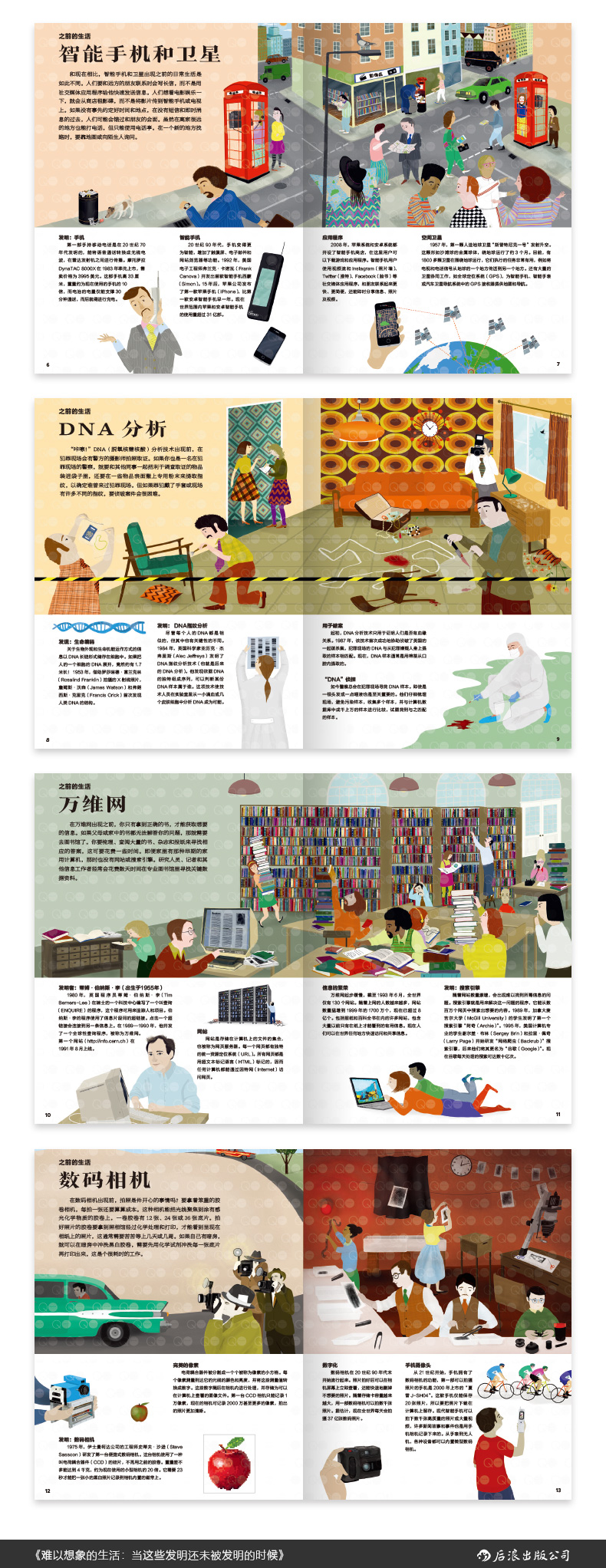 书中每一个对开页都有一幅跨页大图,图本身也是一个幽默故事,展现出不同时代里某项发明出现前人们的生活生产场景。