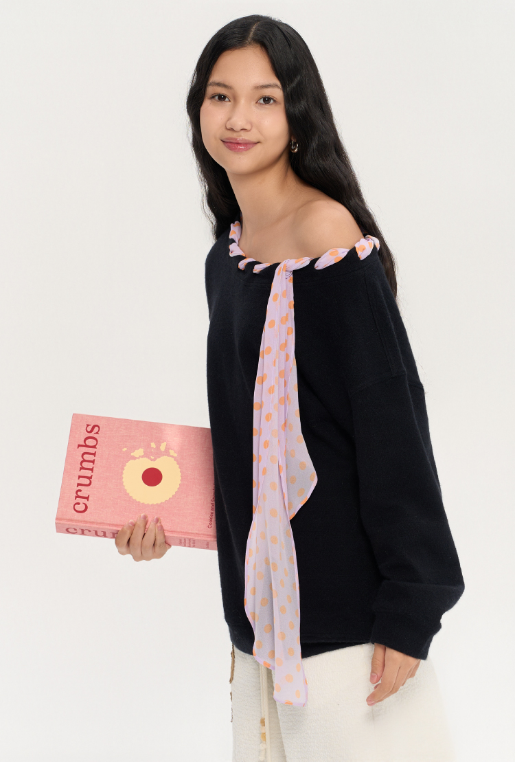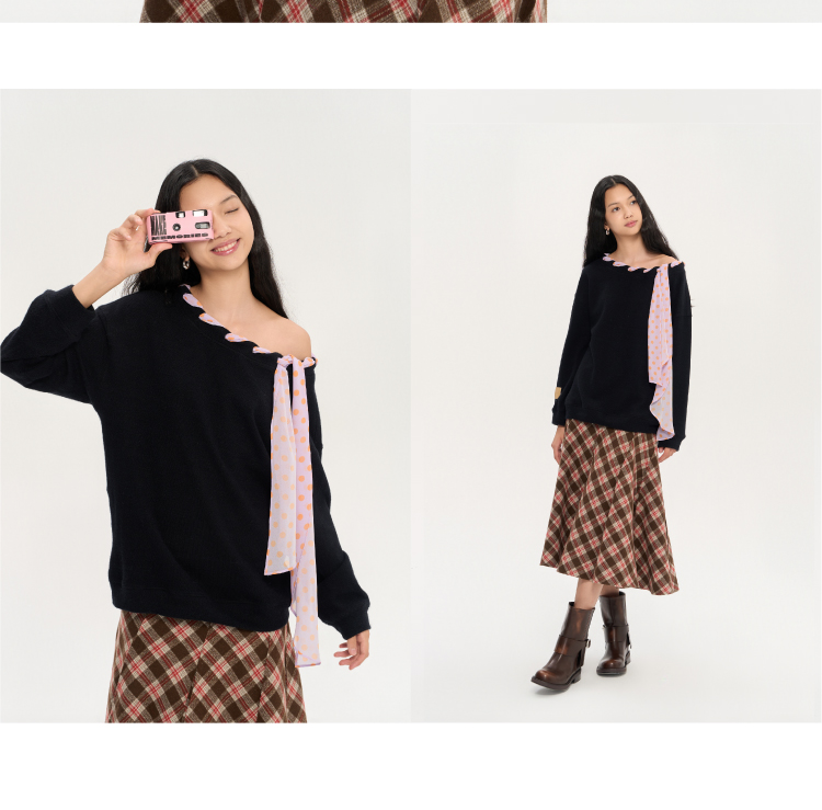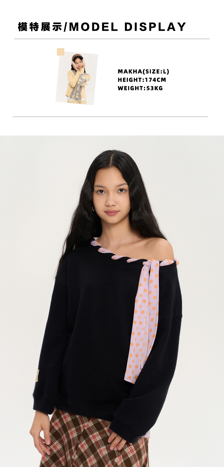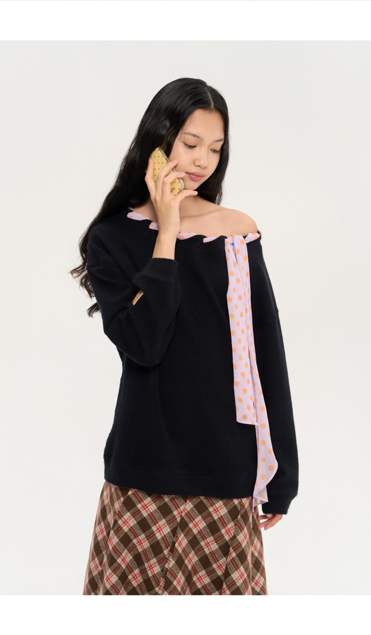 heris/H53122/彩色波点丝巾系带 一字肩/露肩两穿 慵懒氛围感针织卫衣