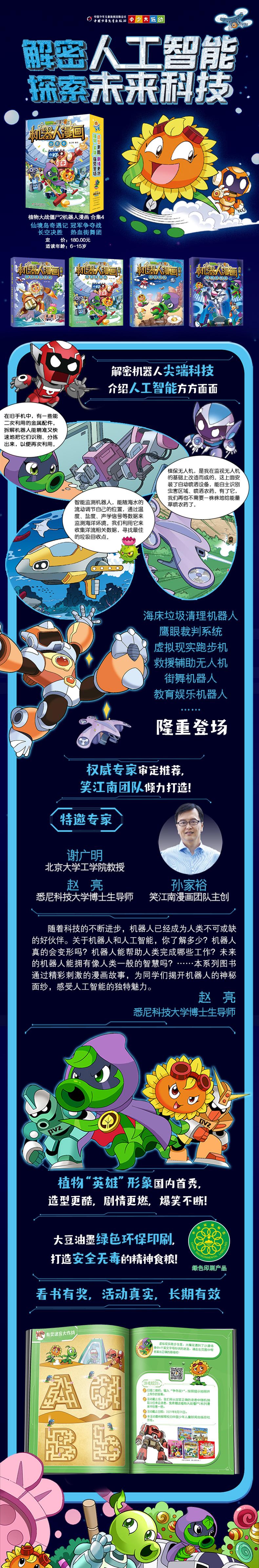 “植物大战僵尸2机器人漫画”系列图书将机器人技术、人工智能、未来科技等高精尖科学知识融人有趣的冒险故事,内容经机器人专家权威审定,引导小读者了解机器人的方方面面,培养创造力和探究精神。本合集共4册,是该系列的第4个合集,包括《仙境岛奇遇记》《冠军争夺战》《长空决胜》《热血街舞团》。