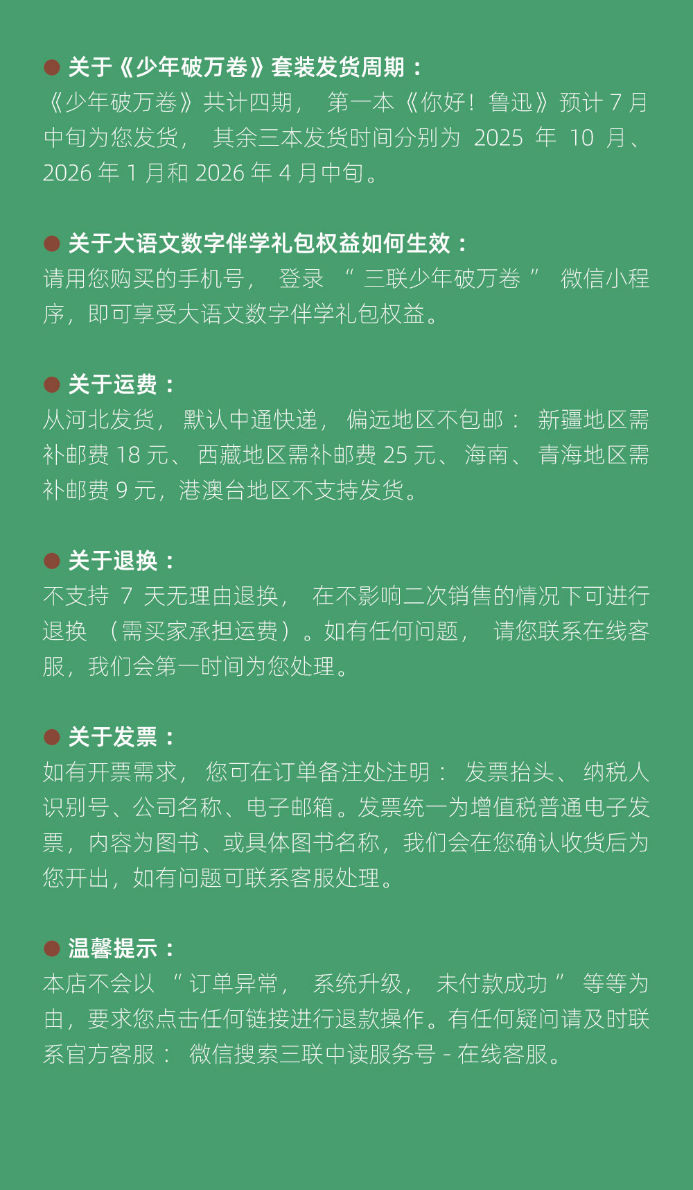 《少年破万卷》共计四期, 第一本《你好!鲁迅》预计7月中旬为您发货, 其余三本发货时间分别为2025年10 月、2026 年1月和 2026 年4月中旬。
