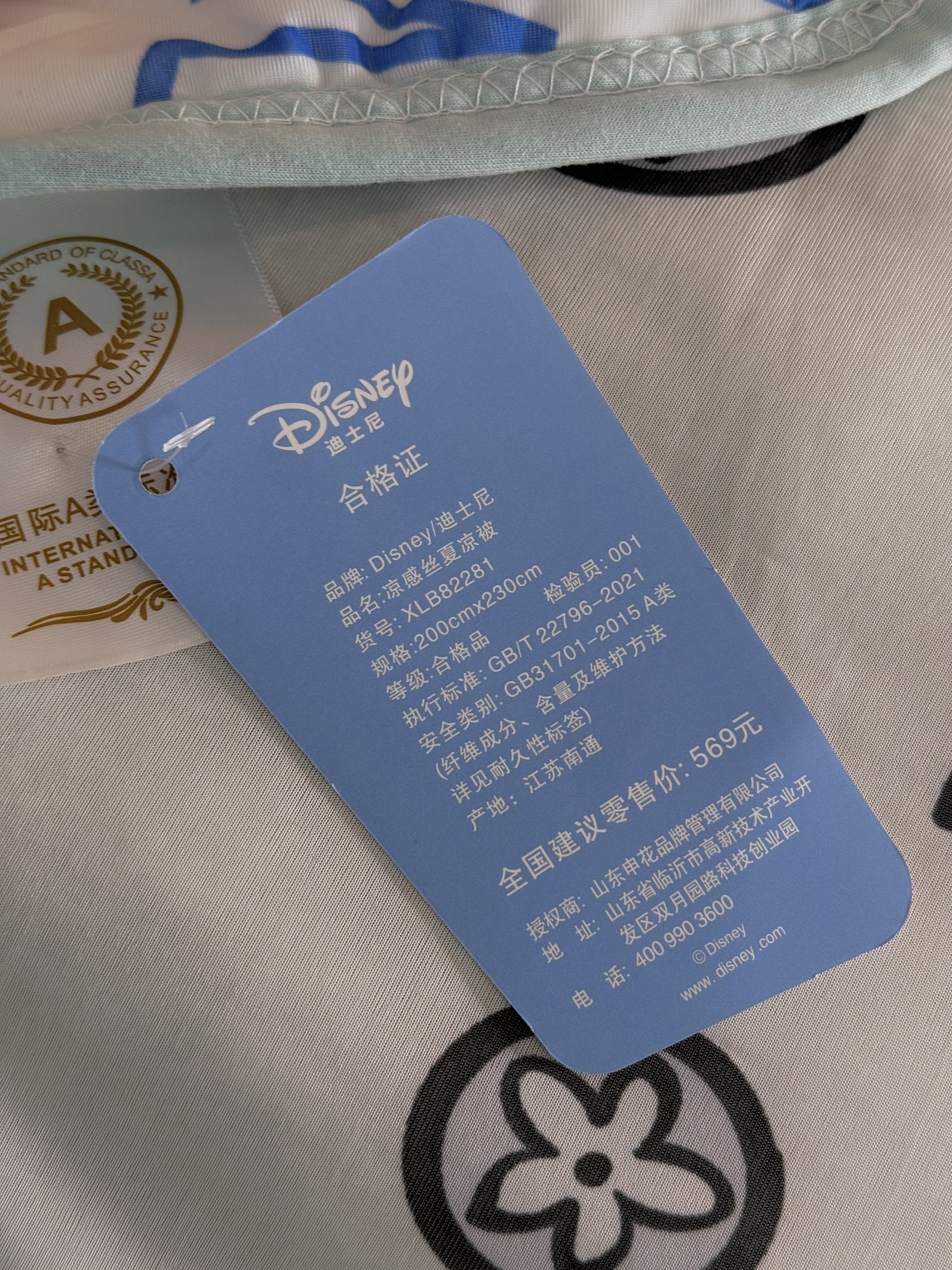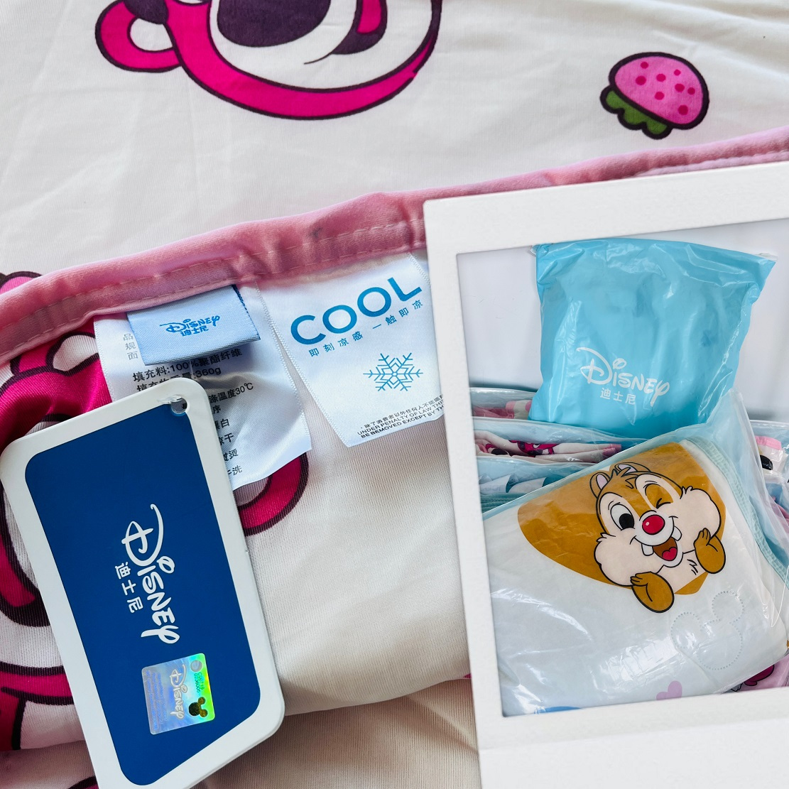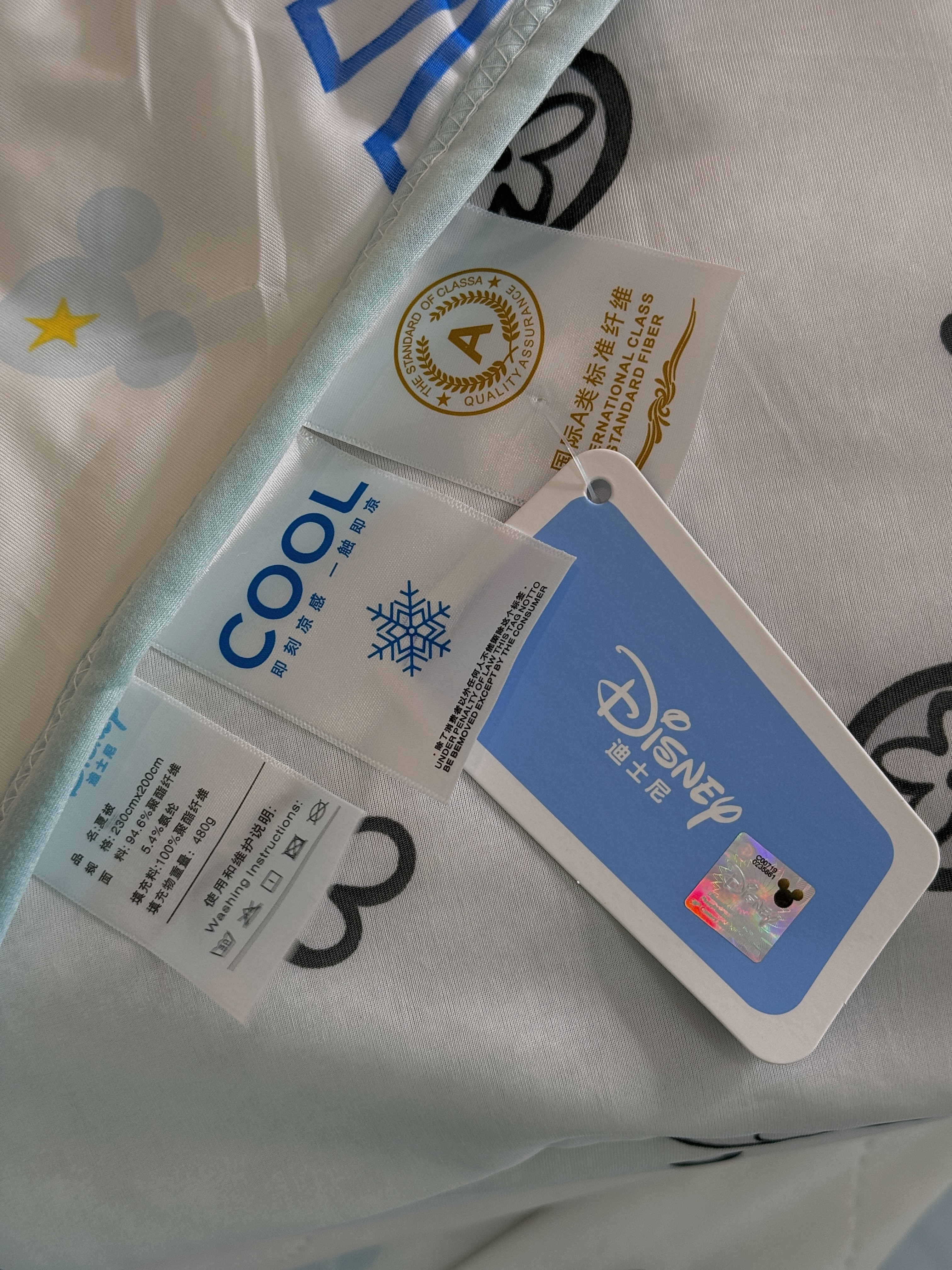 每条被子都有一个迪士尼标识, 高品质,高质量,一触即凉, 比你在市面上买到的迪士尼仿版品质好的多 品质细节很完美 加上被子的边边角角都有手包边设计 细节做工很棒 真的是一条你用上几年都完全不需要换的好被子