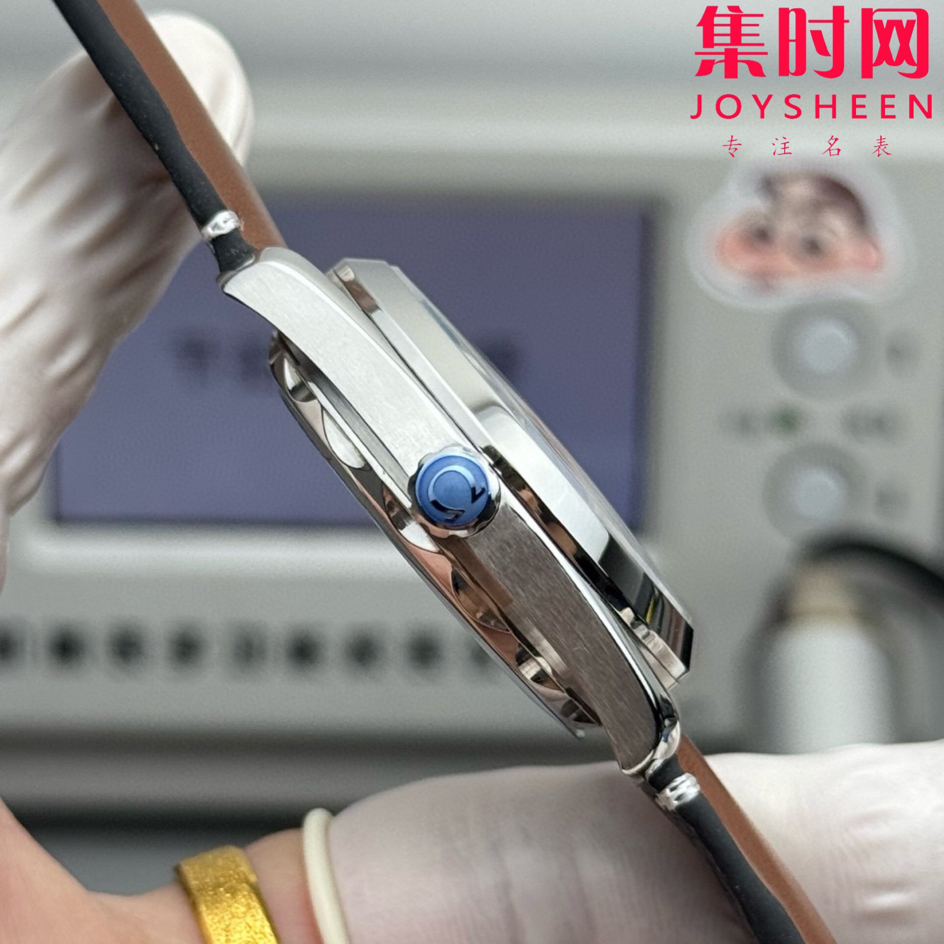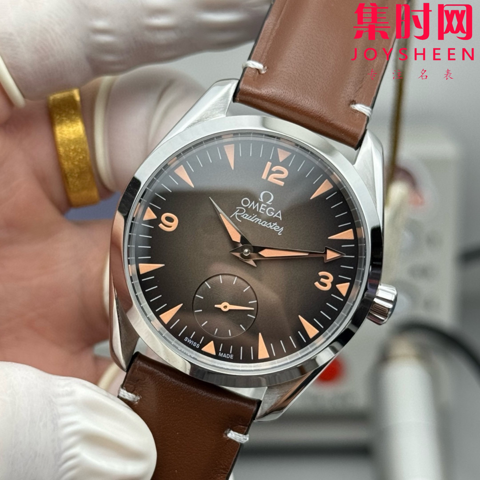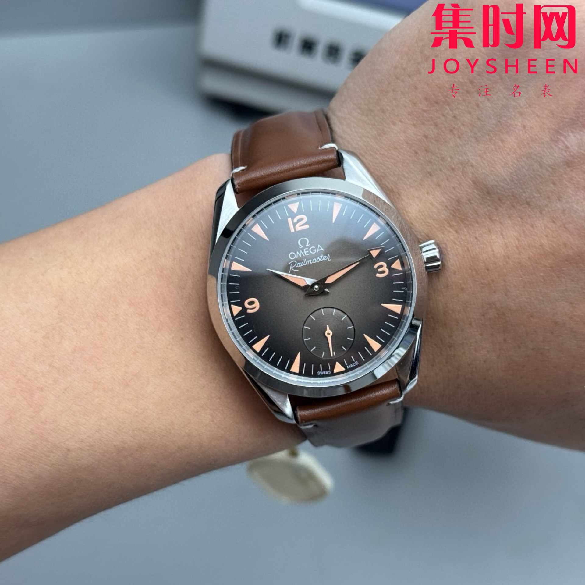 欧米茄 OMEGA 两针半 Railmaster 铁霸两针半系列 男士腕表 采用了与海马系列 Aqua Terra 相同的 38 毫米精钢表壳,厚度为 12.36 毫米,分别大三针与小三针两个版本。表盘为中心渐变过渡,哑光漆面效果,在三、六、九点位采用复古数字时标,搭配标志性的三角箭形指针,且刻度与指针均具备夜光效果。
