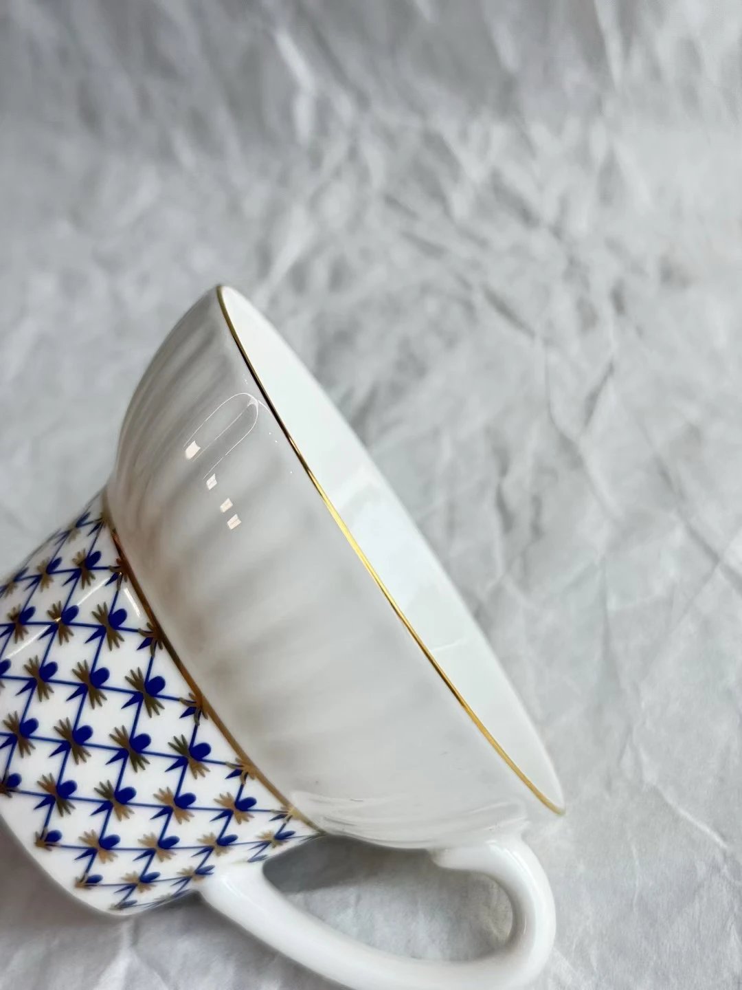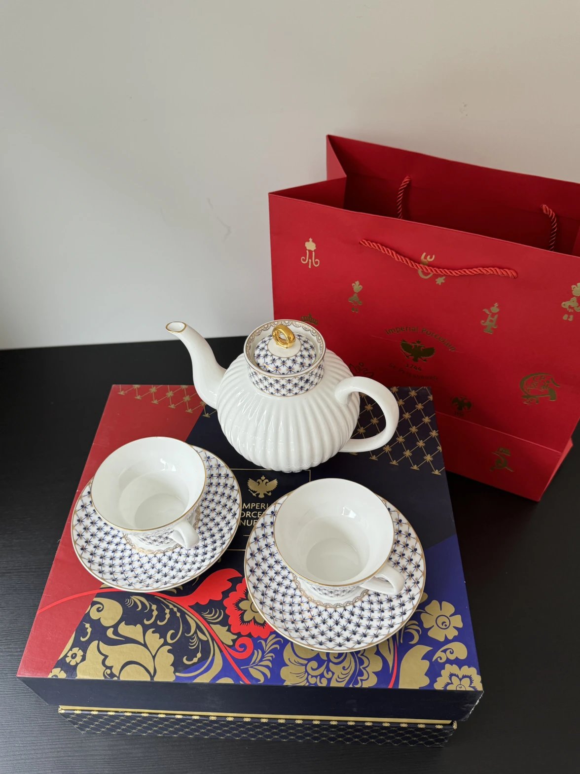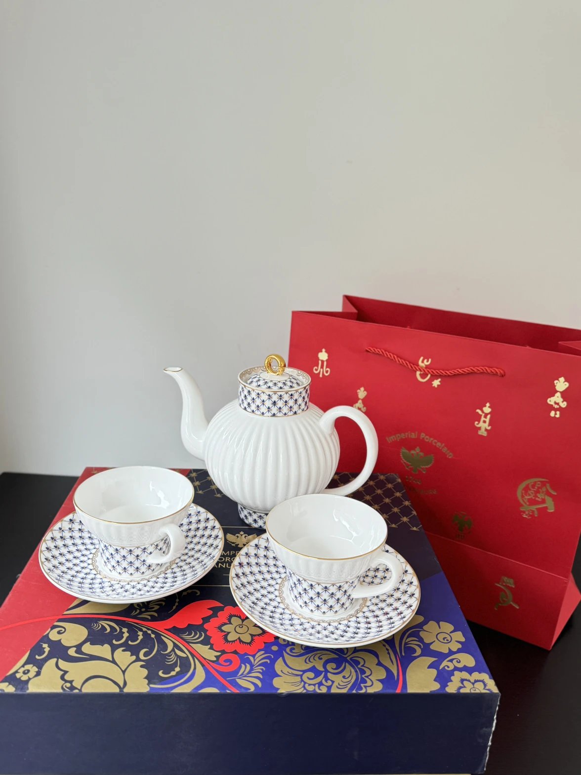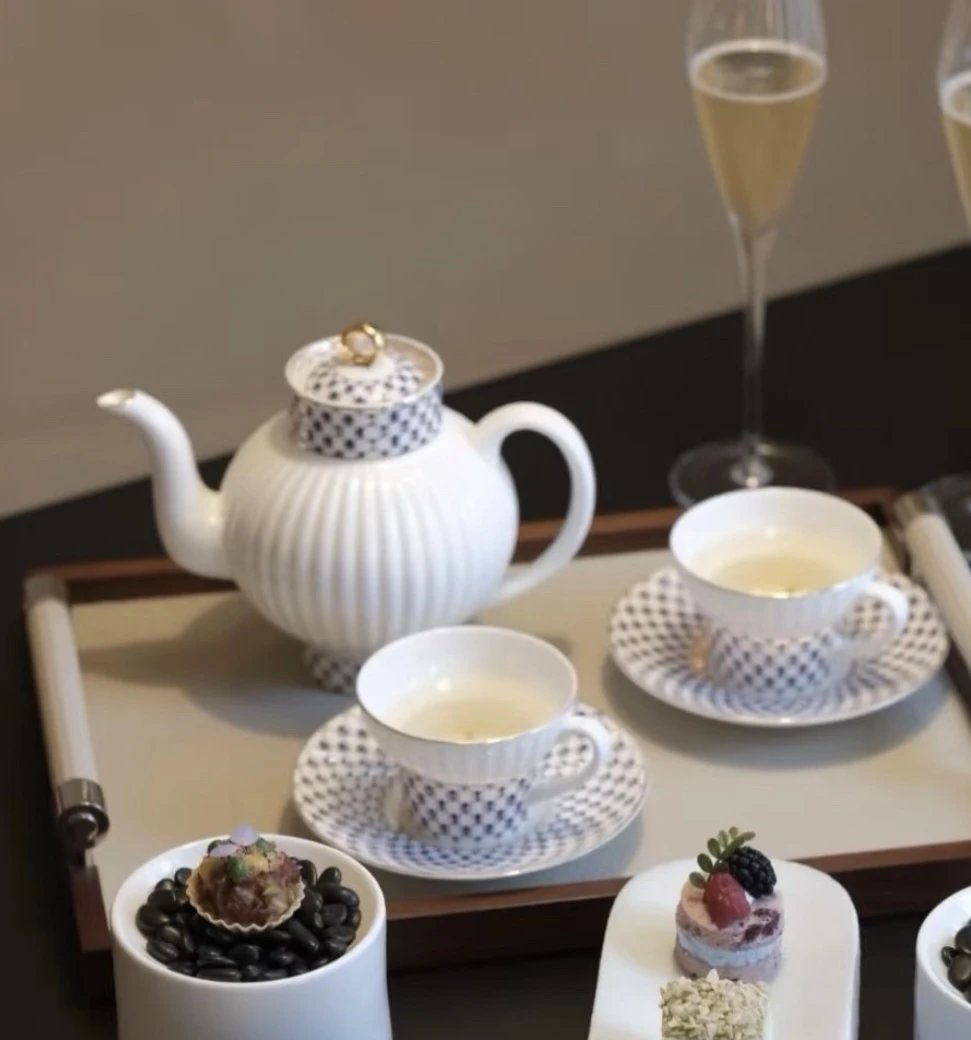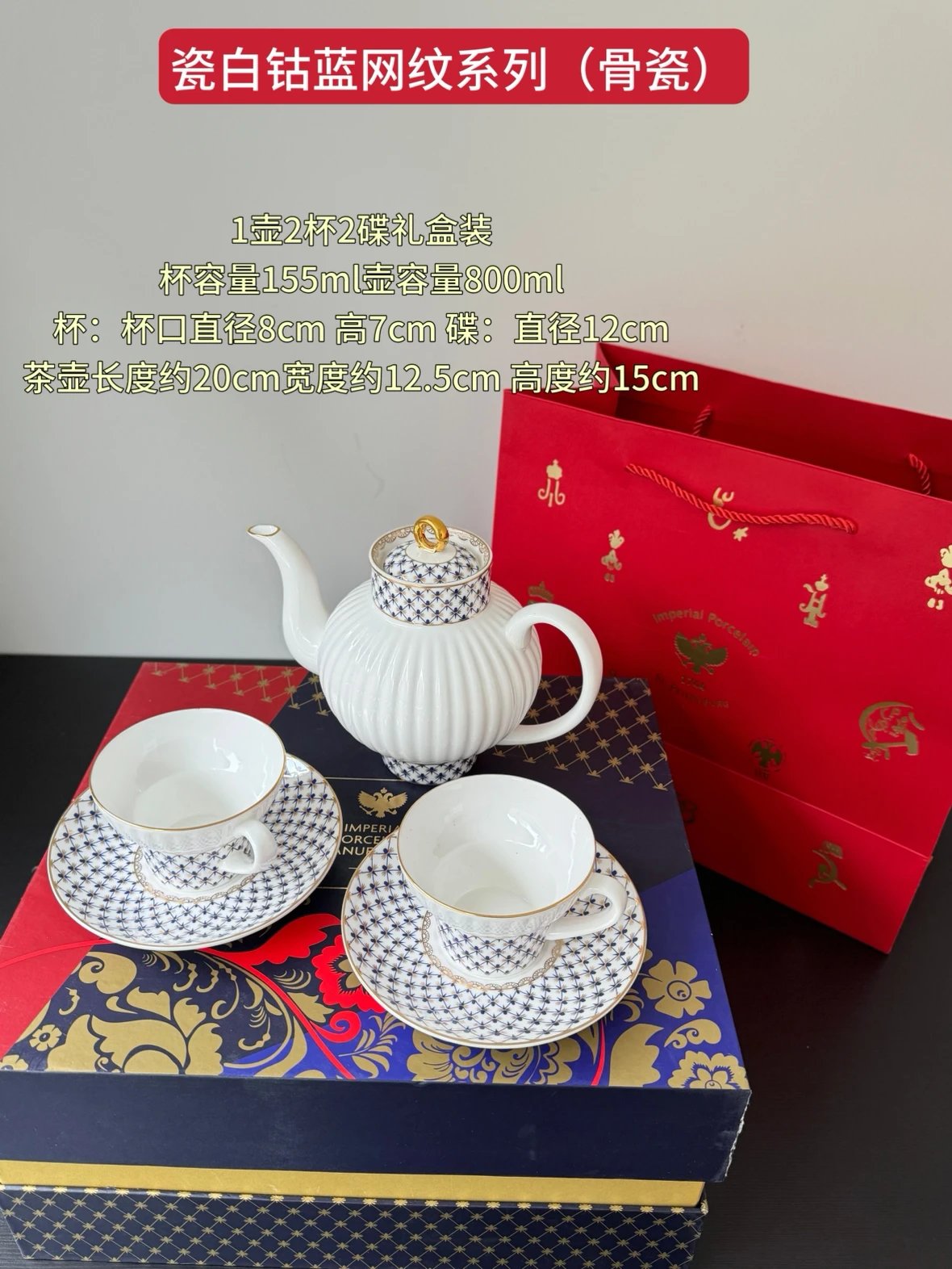 高端瓷器爱好者必入!瓷白钴蓝网纹系列 绝美骨瓷套装三件套