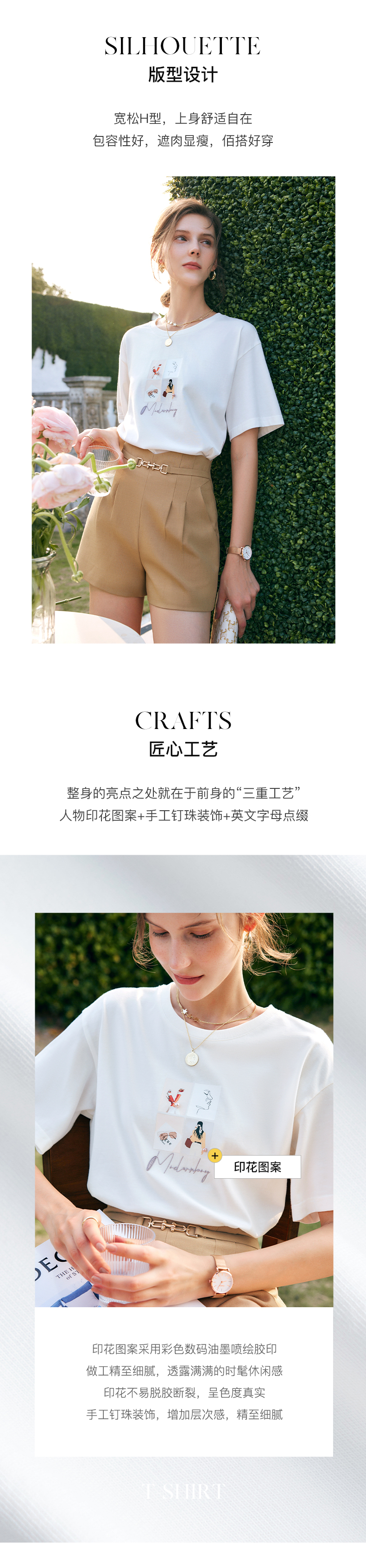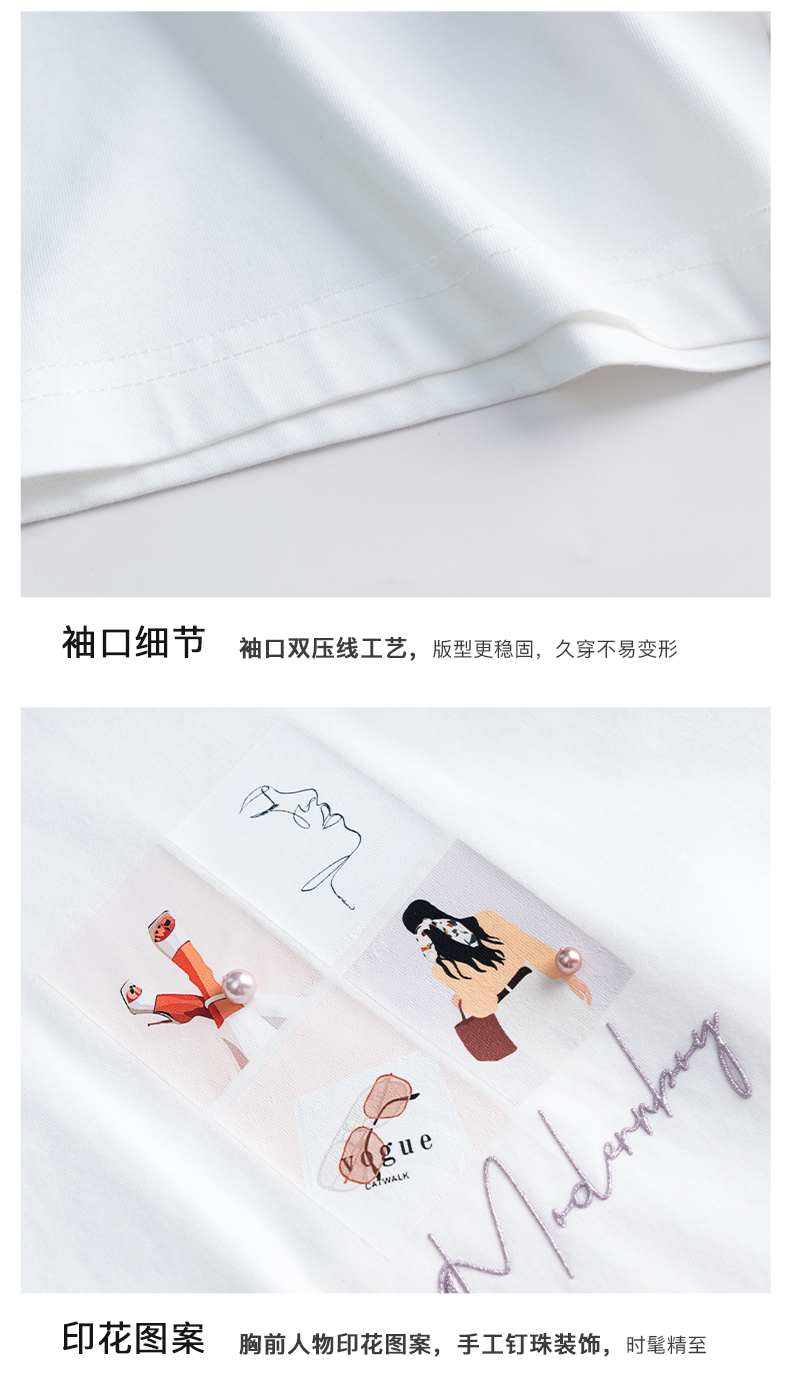 欧芮儿白色t恤女夏季2022新款宽松时尚印花落肩袖圆领纯棉上衣ins