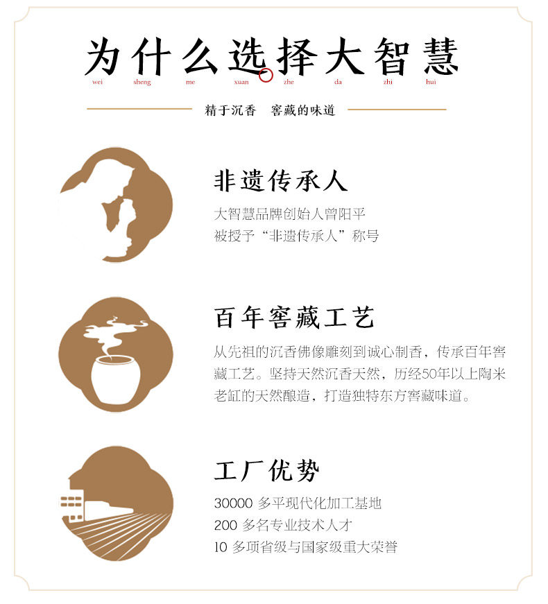 - 以沉香为媒,大智慧沉香述说中国人香事生活中的美与智慧。 将沉香与生俱来的雅与趣、净美的生活禅意, 融入现代人的生活场景。