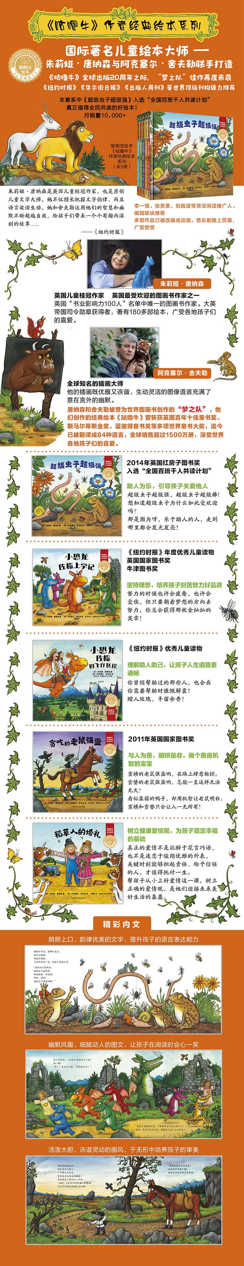 聪明豆绘本·珍藏版:《咕噜牛》作者经典绘本系列,是由国际著名儿童绘本大师朱莉娅·唐纳森和阿克塞尔·舍夫勒联手打造的经典绘本合集。朱莉娅·唐纳森幽默风趣的文笔、韵律优美的语言与阿克塞尔·舍夫勒诙谐灵动的画风,造就了享誉全球的《咕噜牛》。本系列作品延续了两位大师一贯灵动幽默的风格,让孩子在会心一笑的同时,学会幽默,培养审美,提升语言表达能力,养成良好的阅读习惯。