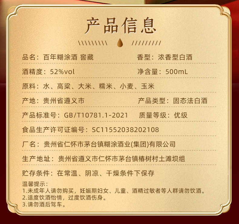 【限购】百年糊涂浓香型白酒52度500mL 窖藏 【数量有限】