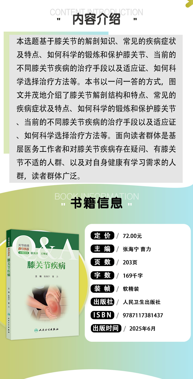 本选题基于膝关节的解剖知识、常见的疾病症状及特点、如何科学的锻炼和保护膝关节、当前的不同膝关节疾病的治疗手段以及适应证、如何科学选择治疗方法等。本书以一问一答的方式,图文并茂地介绍了膝关节解剖结构和特点、常见的疾病症状及特点、如何科学的锻炼和保护膝关节、当前的不同膝关节疾病的治疗手段以及适应证、如何科学选择治疗方法等。面向读者群体是基层医务工作者和对膝关节疾病存在疑问、有膝关节不适的人群、以及对自身健康有学习需求的人群,读者群体广泛。