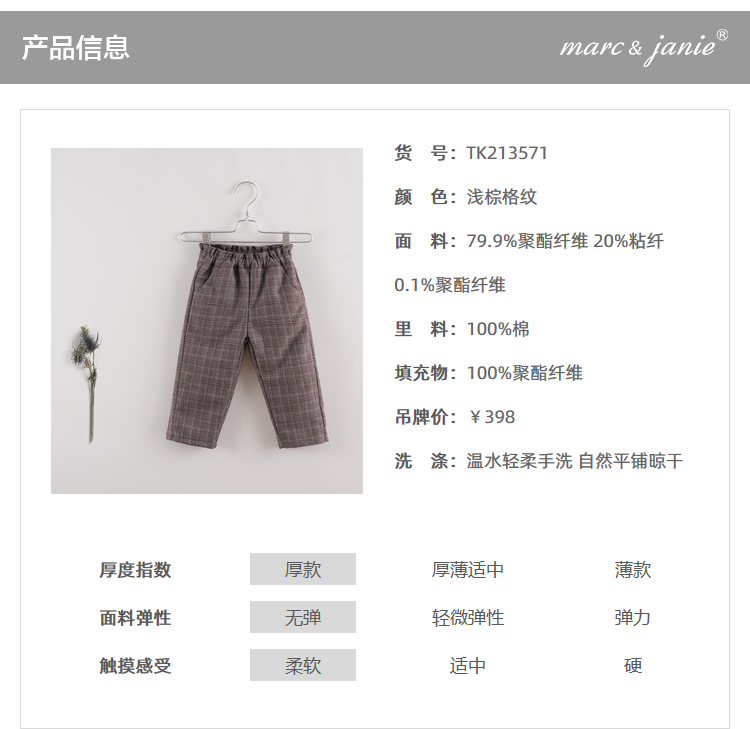 【马克珍妮 法式系列】新款宝宝冬装 女童加厚格纹棉裤213571