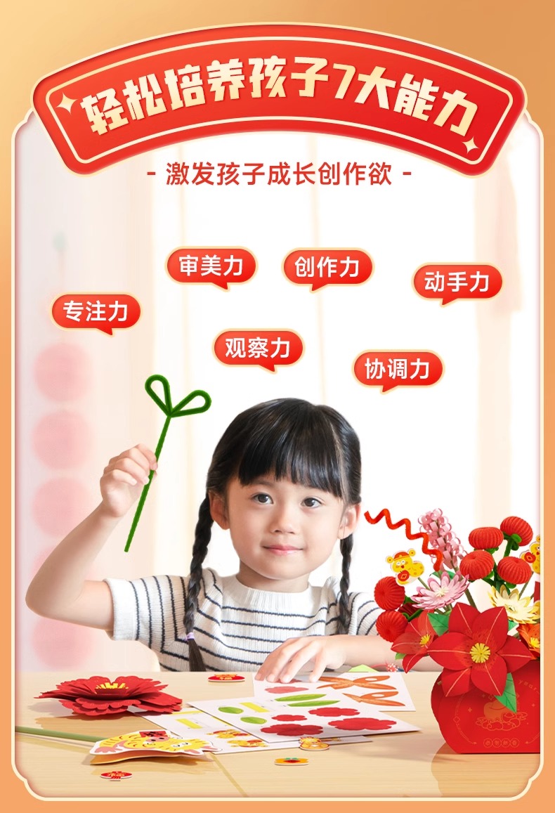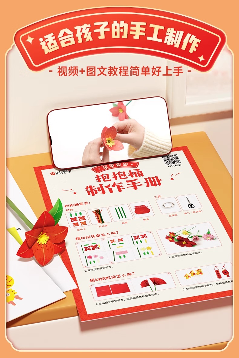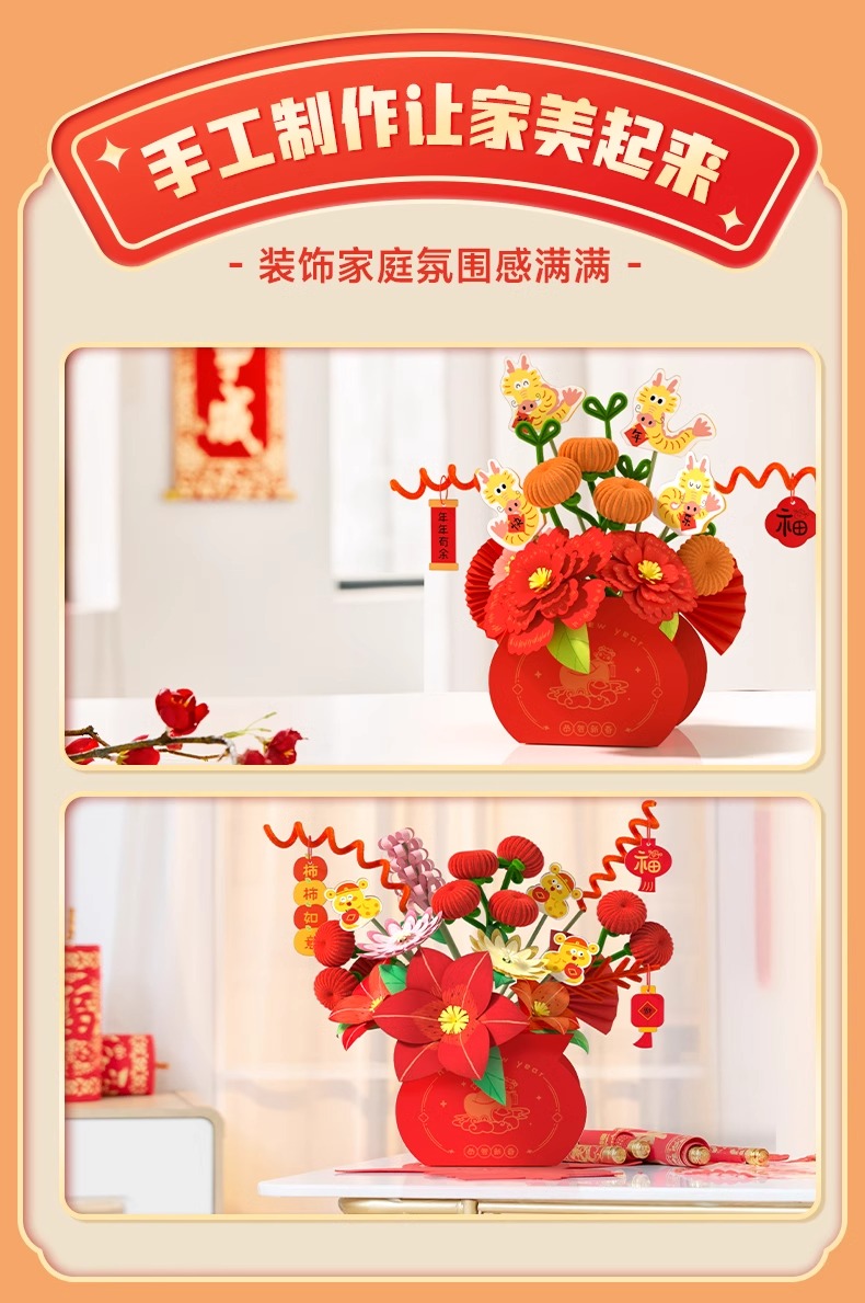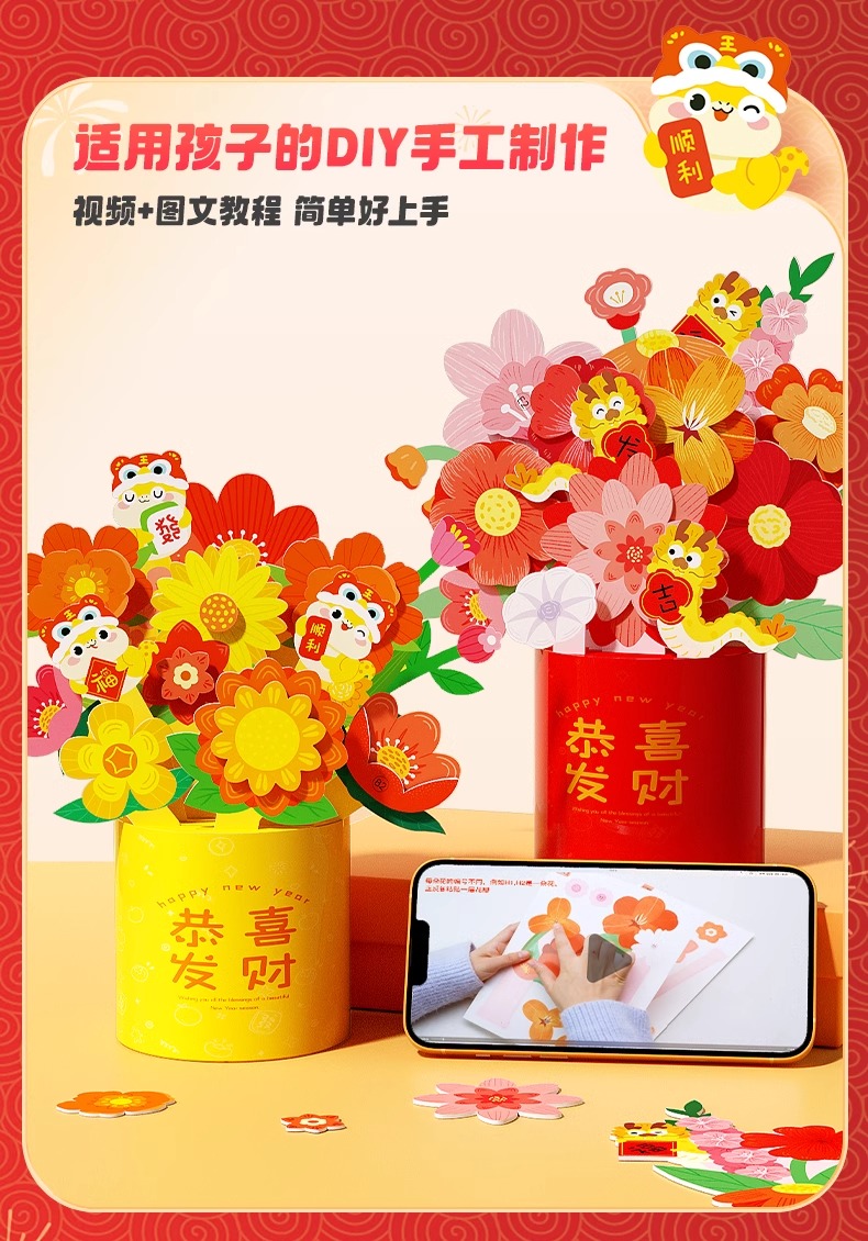 【时光学】新年手工抱抱桶花束年宵花diy材料萍萍安安柿柿如意幼儿园小学儿童创意花束