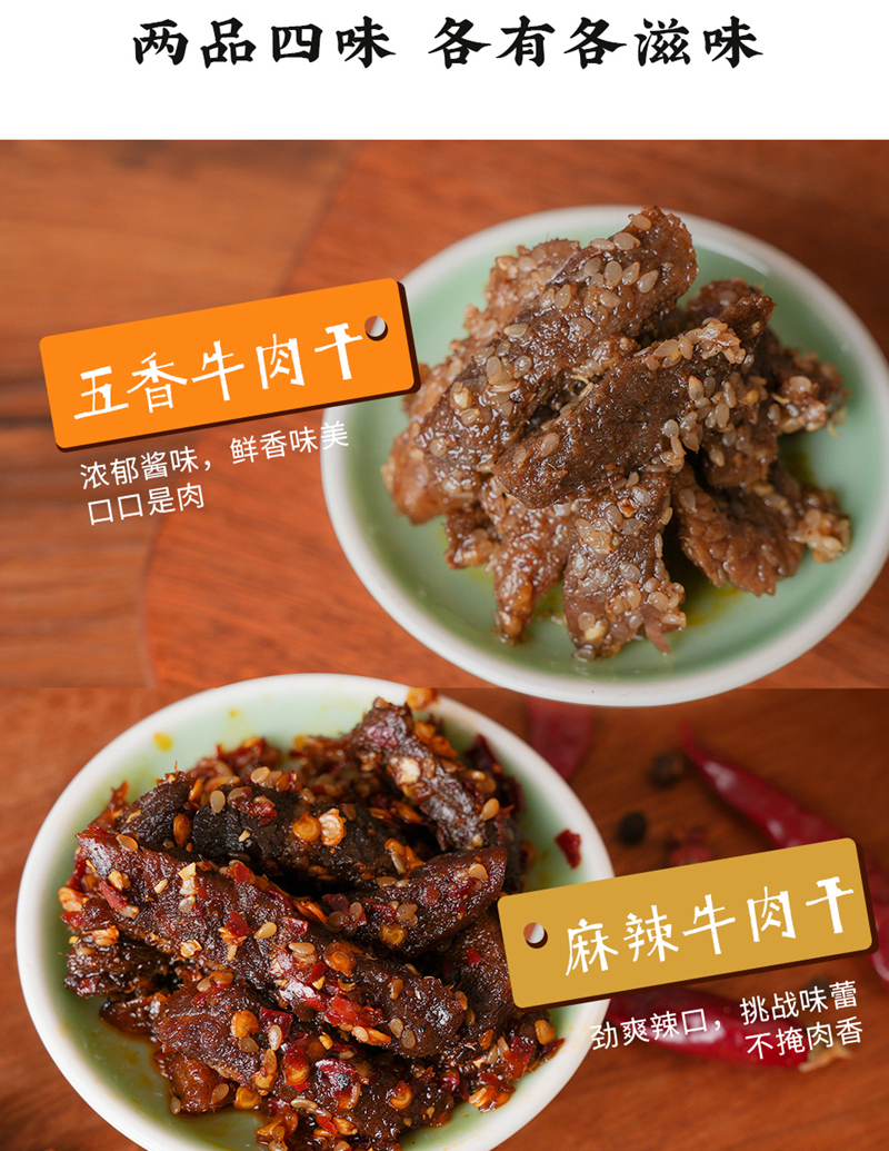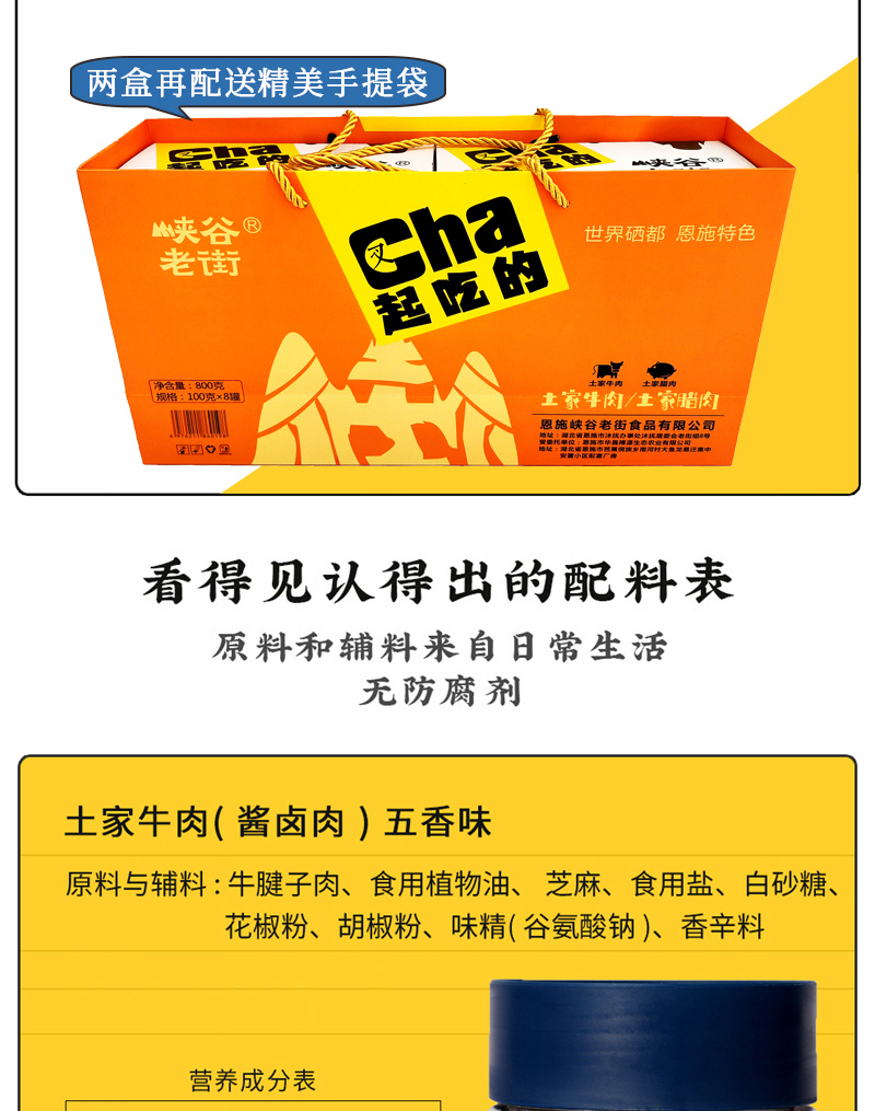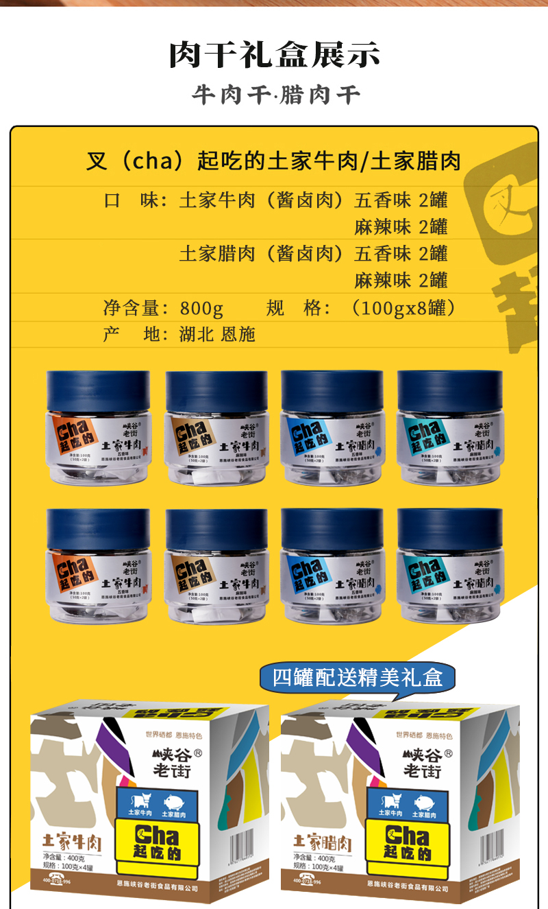 恩施 峡谷老街 土家牛肉干 腊肉干 五香麻辣组合 礼袋装 100克*8罐 800克/提