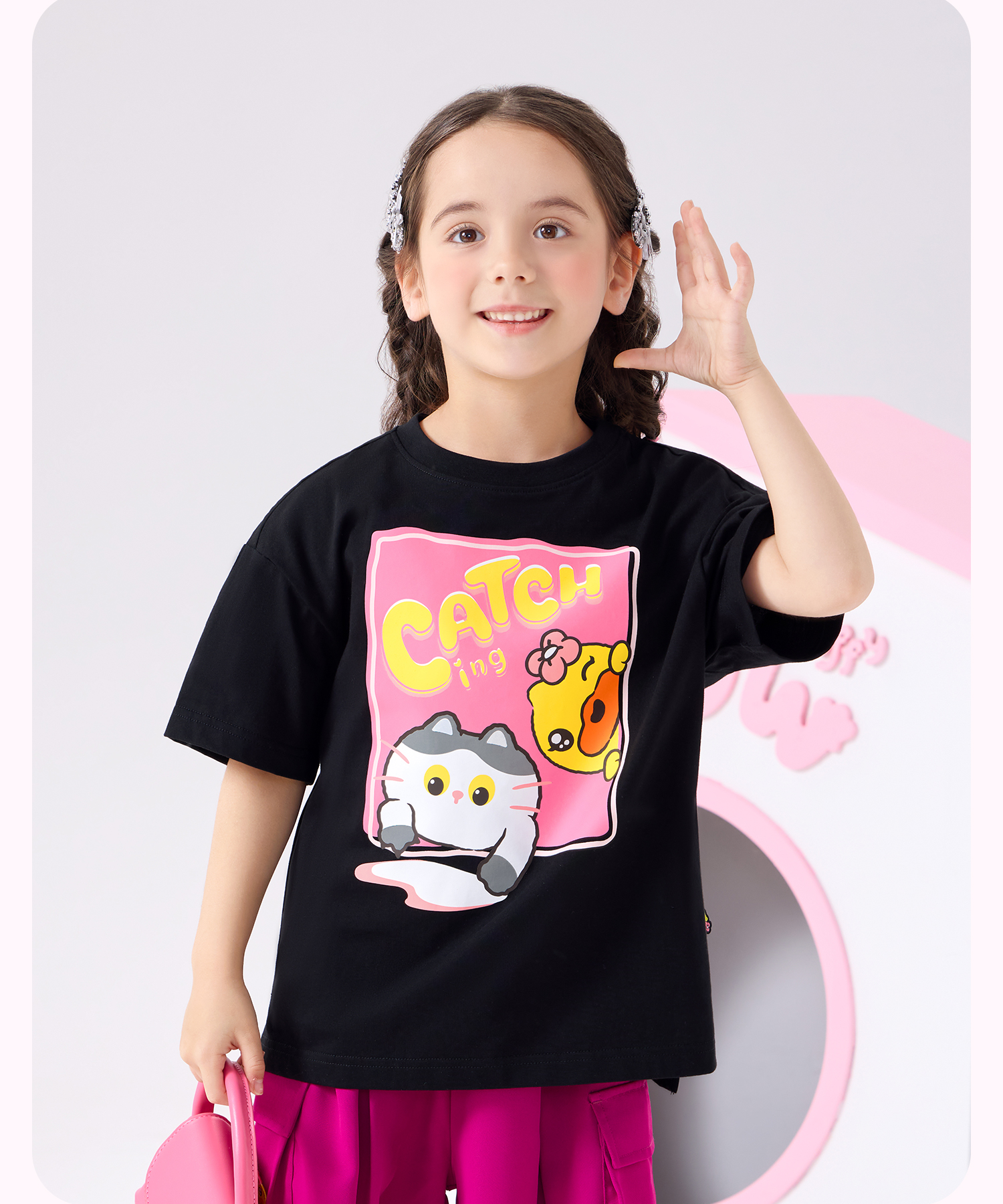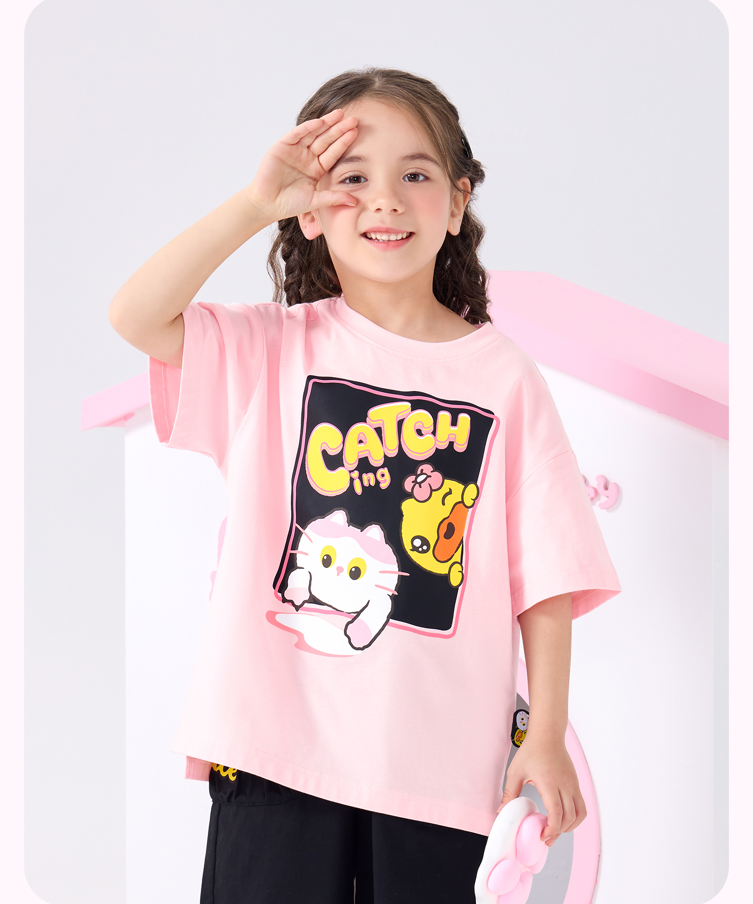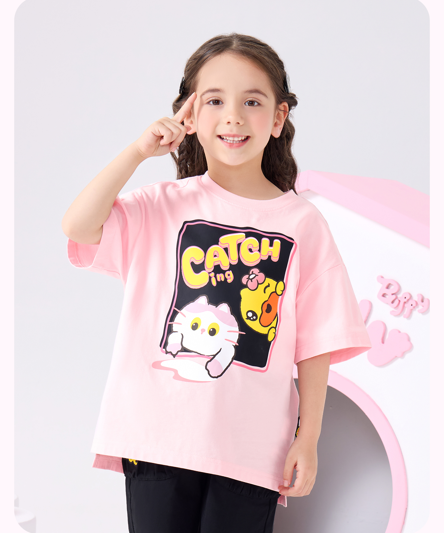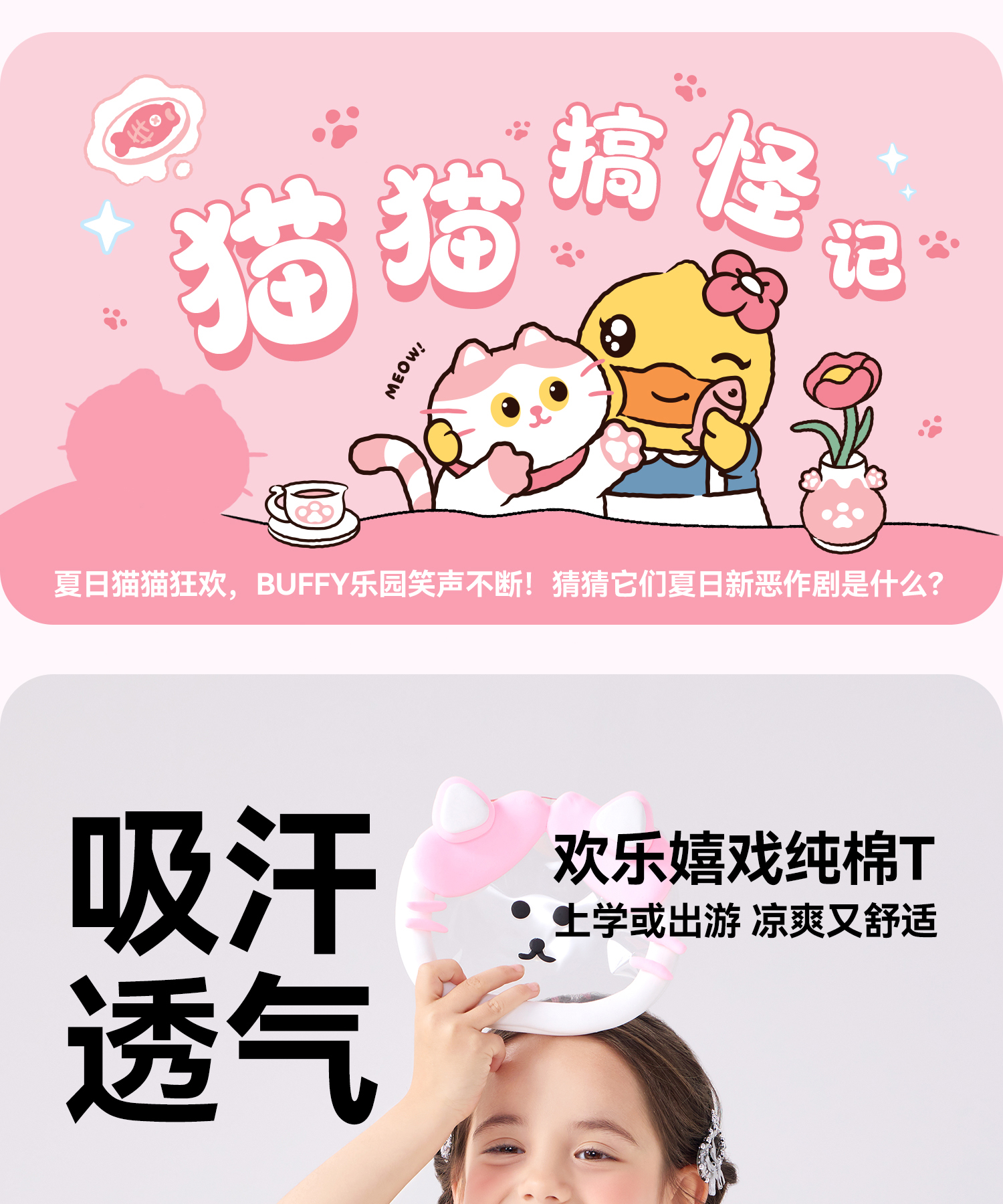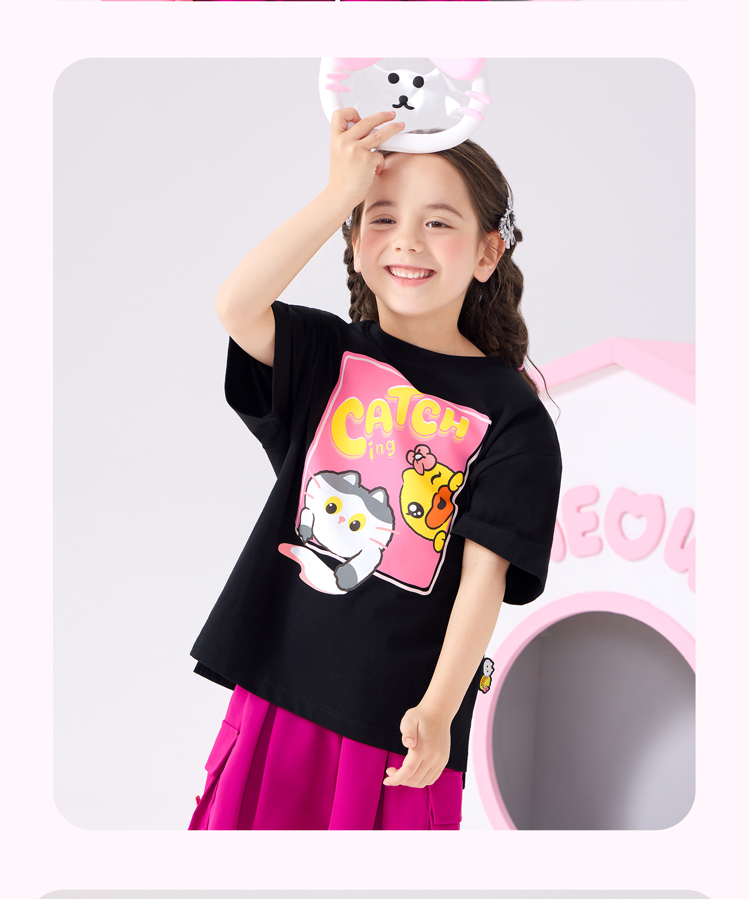 bduck小黄鸭童装夏季女童短袖T恤纯棉夏装小女孩半袖上衣儿童猫咪印花105-150 FF2601012