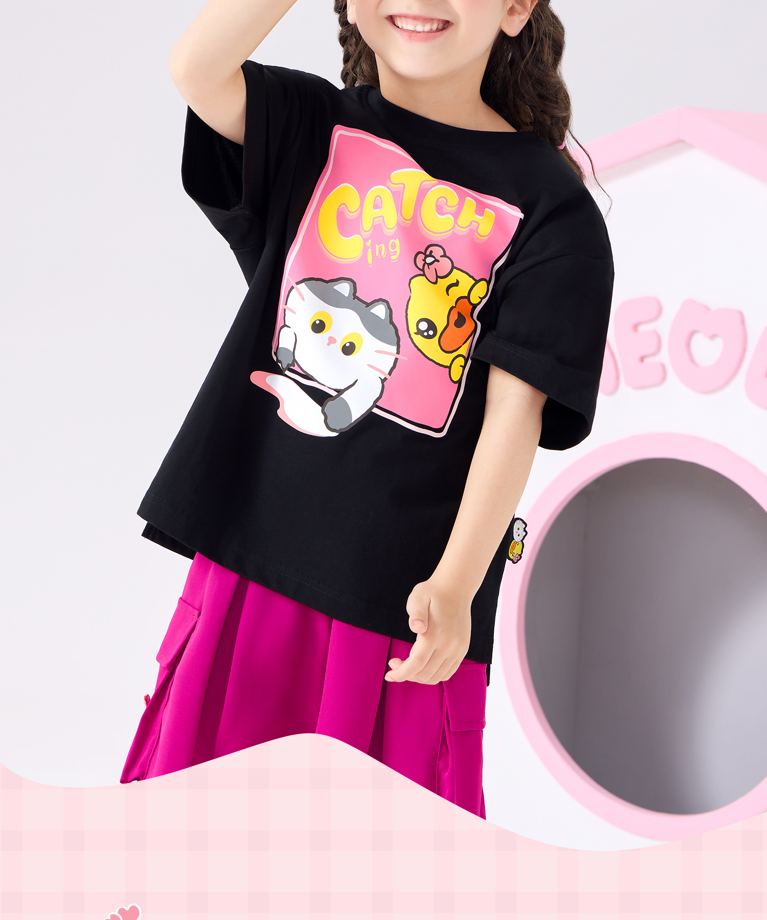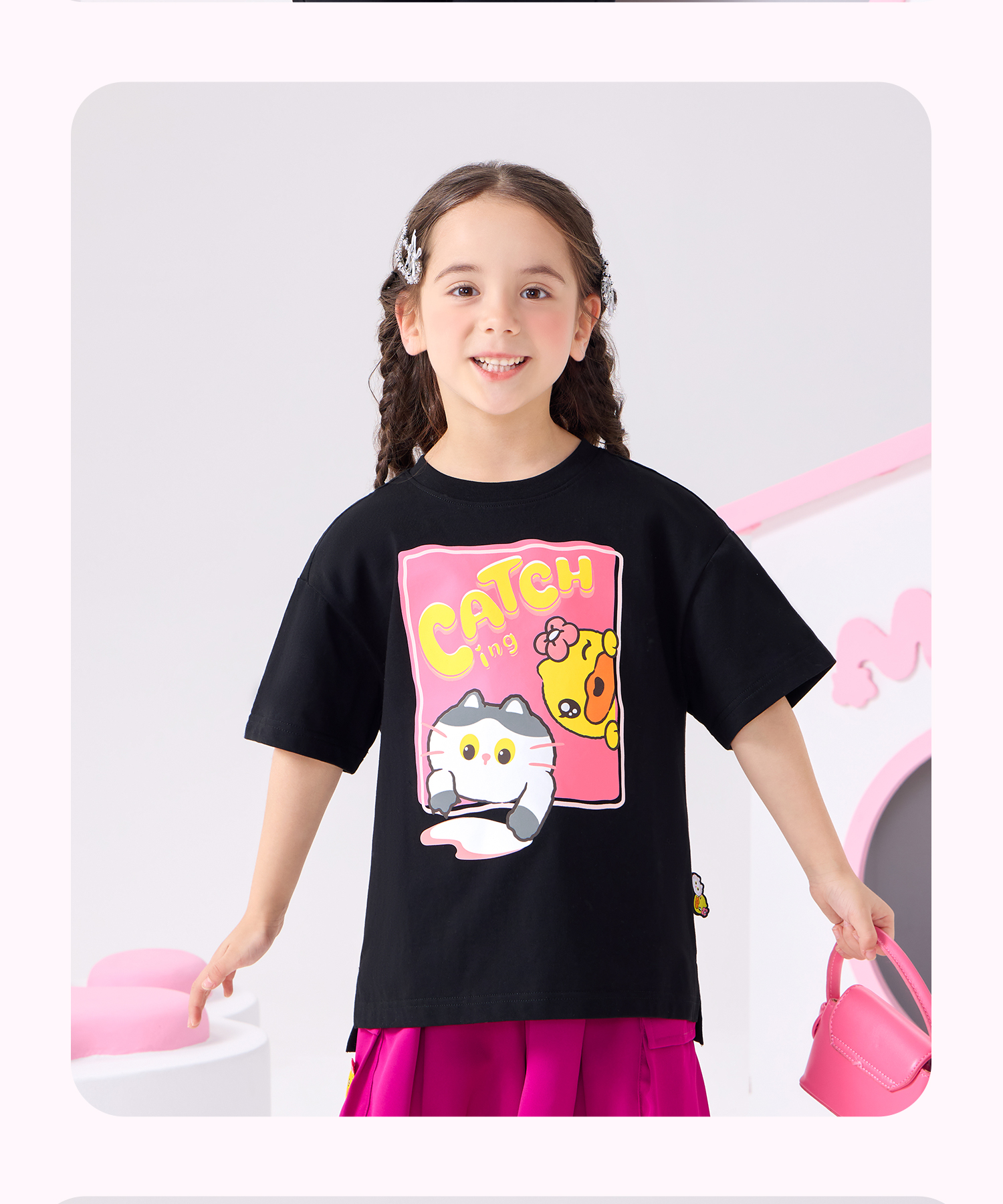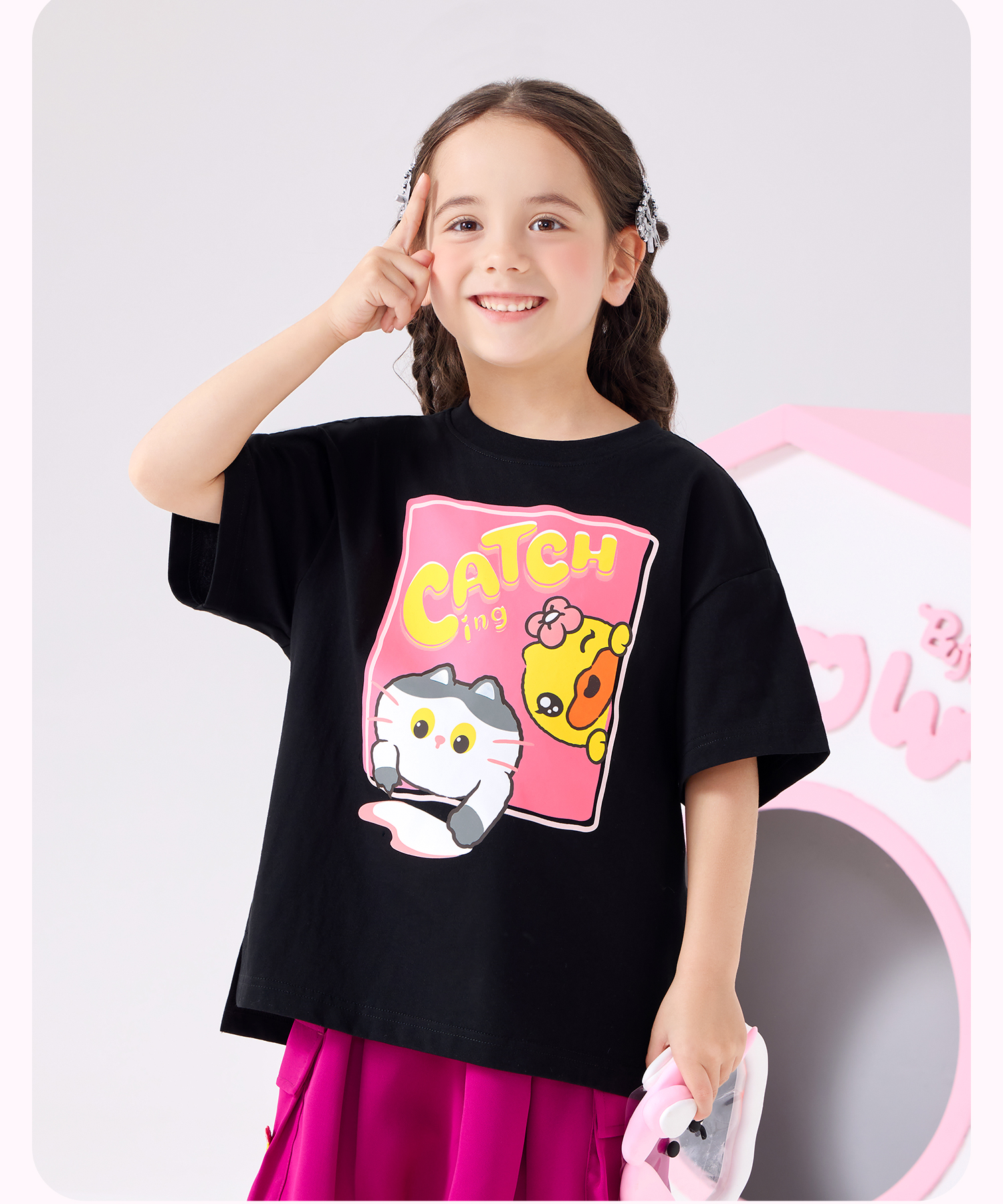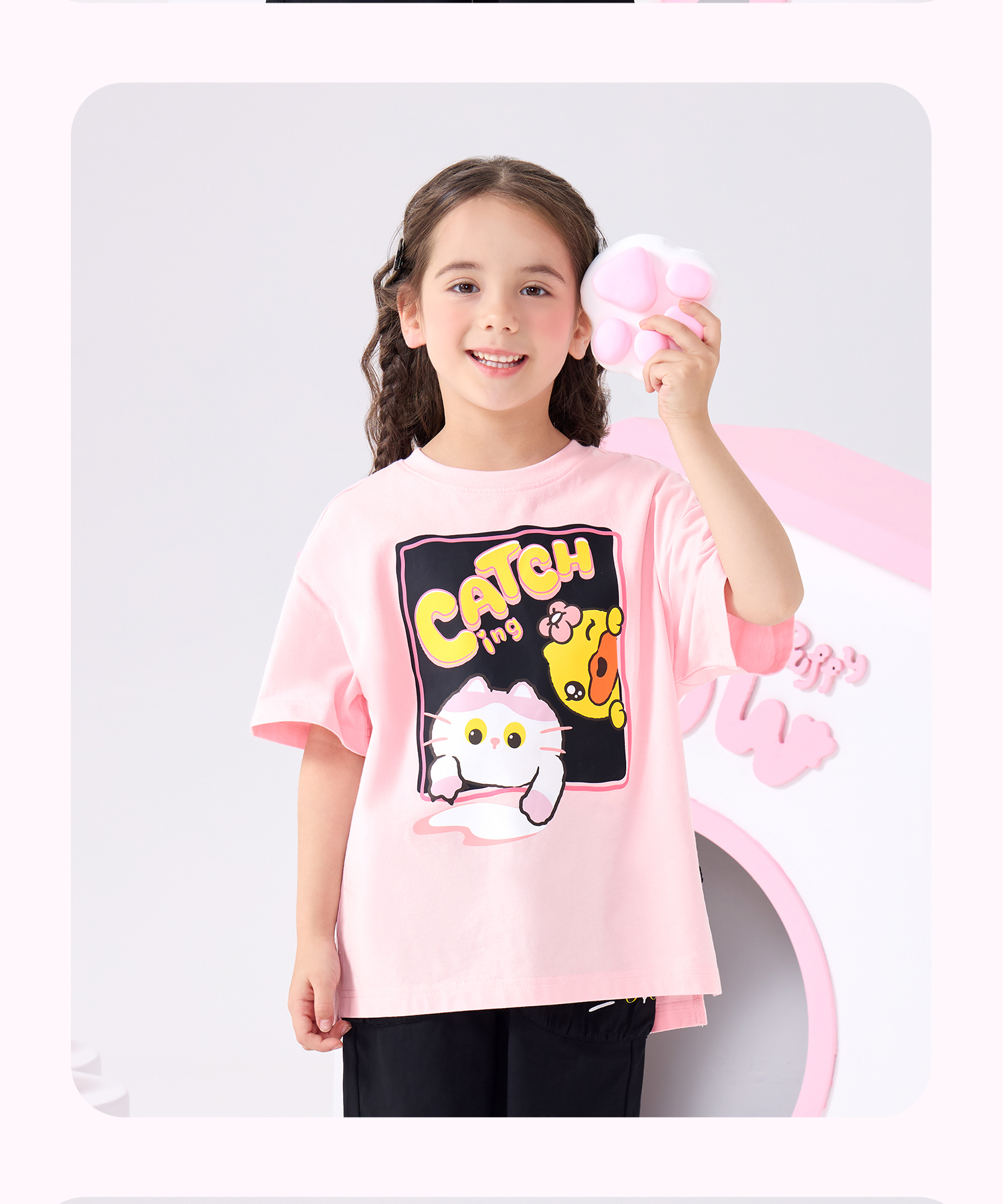 bduck小黄鸭童装夏季女童短袖T恤纯棉夏装小女孩半袖上衣儿童猫咪印花105-150 FF2601012