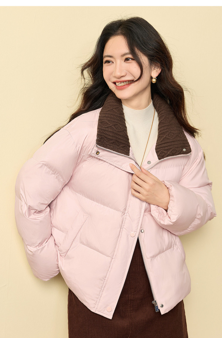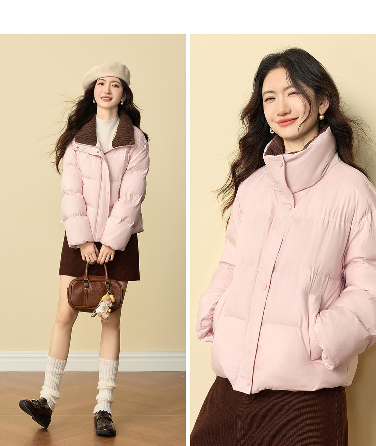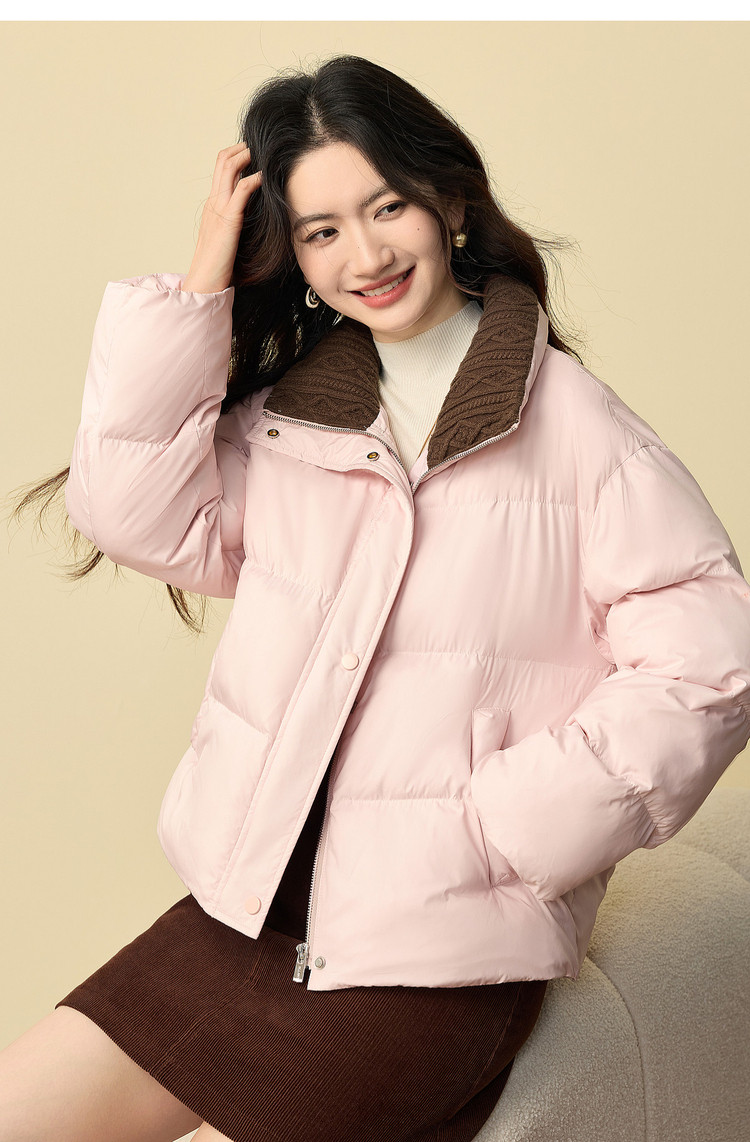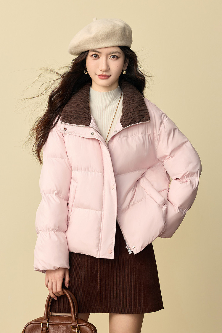 【12/24新品6.5折】熙世界泡芙保暖粉色棉服外套女2025冬装新款毛织拼接立领短款棉衣