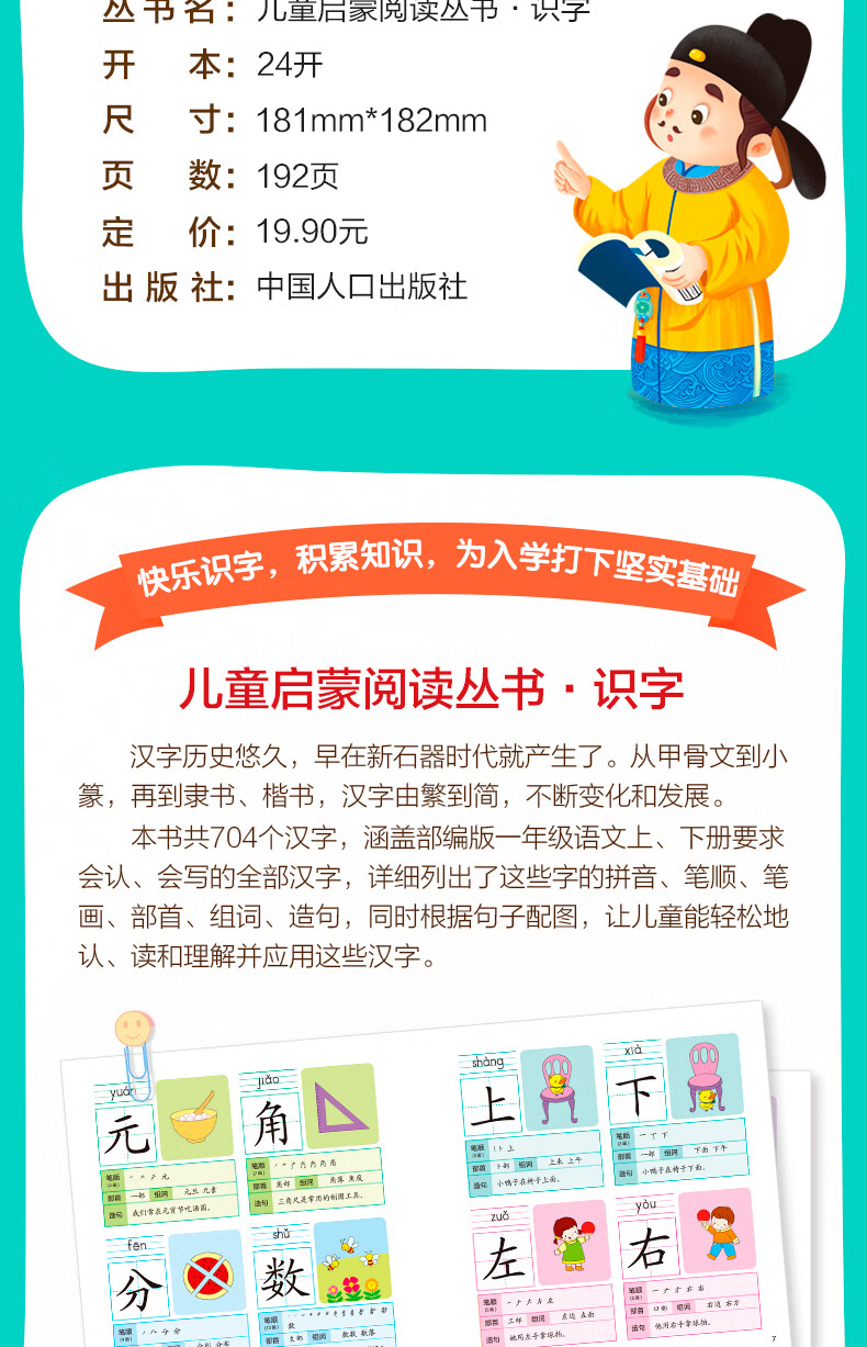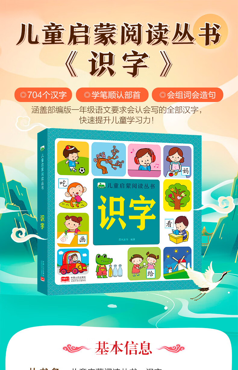 汉字历史悠久,早在新石器时代就产生了。从甲骨文到小篆,再到隶书、楷书,汉字由繁到简,不断变化和发展。《儿童启蒙阅读丛书·识字》共704个汉字,涵盖部编版一年级语文上、下册要求会认、会写的全部汉字,详细列出了这些字的拼音、笔顺、笔画、部首、组词、造句,同时根据句子配图,让儿童能轻松地认、读和理解并应用这些汉字。