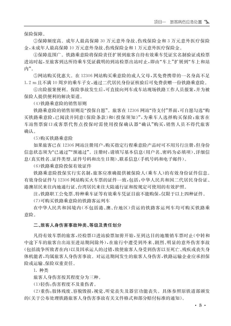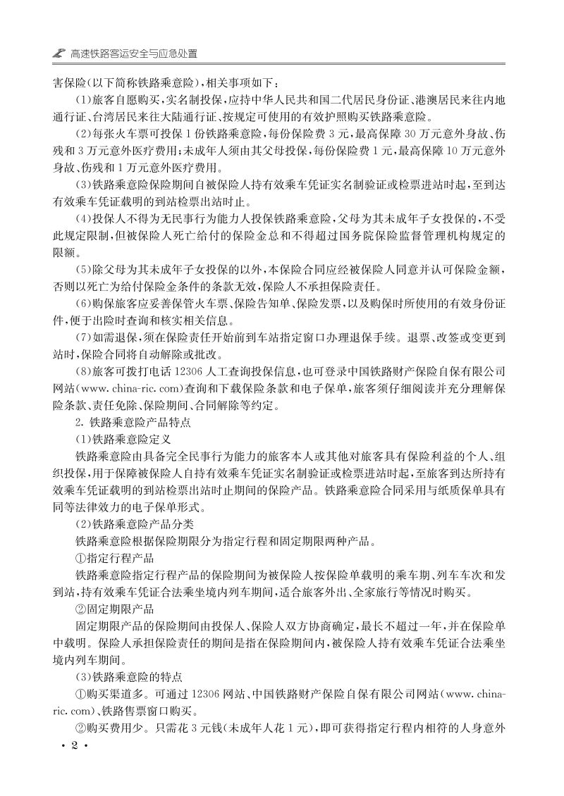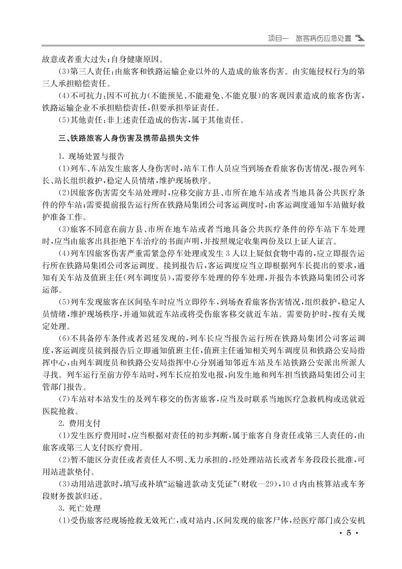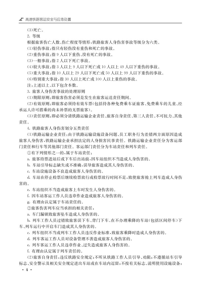 本书为高等职业教育高速铁路客运乘务专业“十三五”规划教材之一,以《铁路客运运输规程》《铁路旅客人身伤害及携带品损失处理暂行办法》《铁路安全管理条例》《铁路消防管理办法》《铁路旅客运输安全检查办法》《电气化铁路有关人员电气安全规则》等有关规定资料作为依据,系统地结合高速铁路客运站和动车组列车工作中所涉及安全应急类业务技能知识。本书分为六个项目:旅客病伤应急处置、火灾爆炸应急处置、突发公共卫生事件应急处置、设备故障应急处置、扰乱治安秩序应急处置和乘务组织异常应急处置。每个项目包含若干个任务,每个任务包含任务说明、知识链接(岗位说明、应急物品、应急流程、安全防控点)、知识拓展(案例分析和应急演练)。