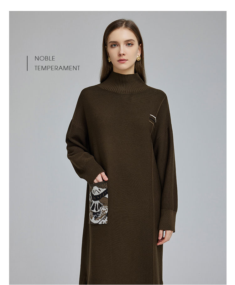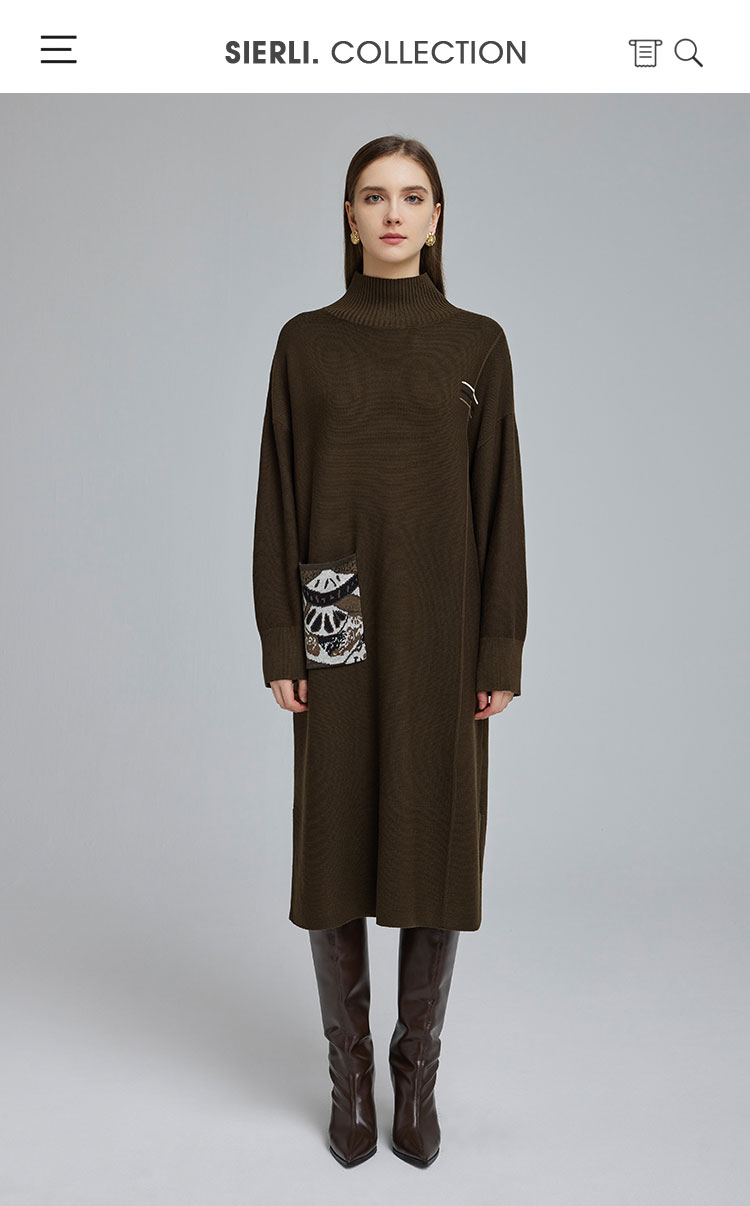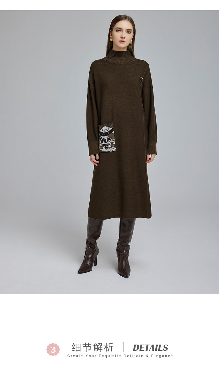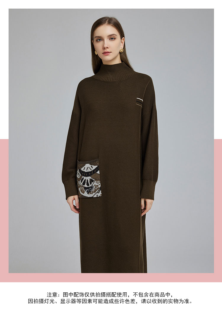 NG680斯尔丽2023秋冬新款半高领宽松口袋提花宽松显瘦显高针织连衣裙