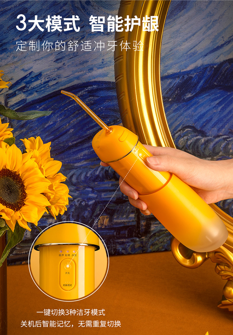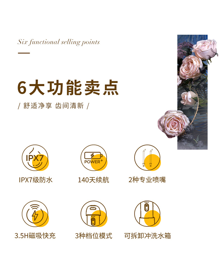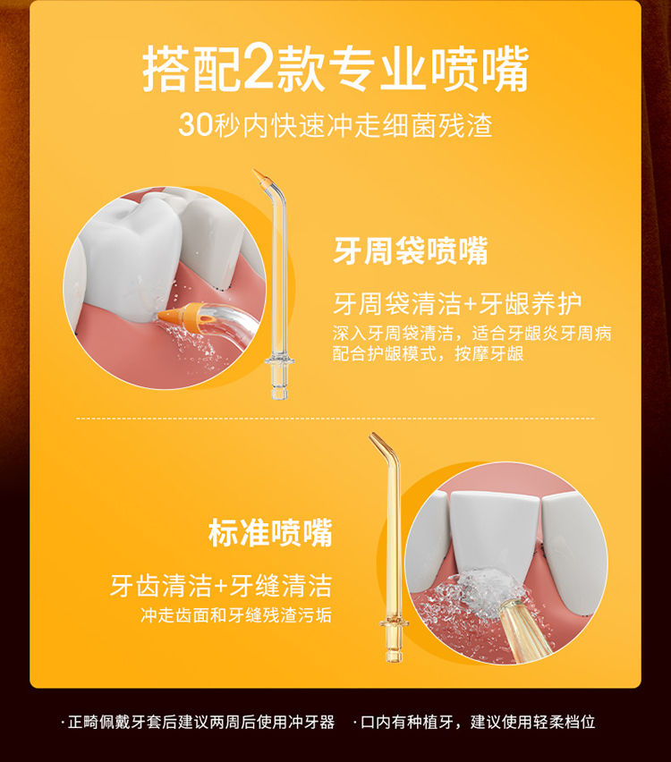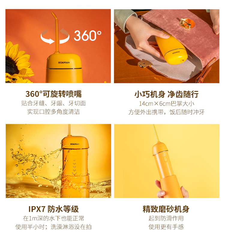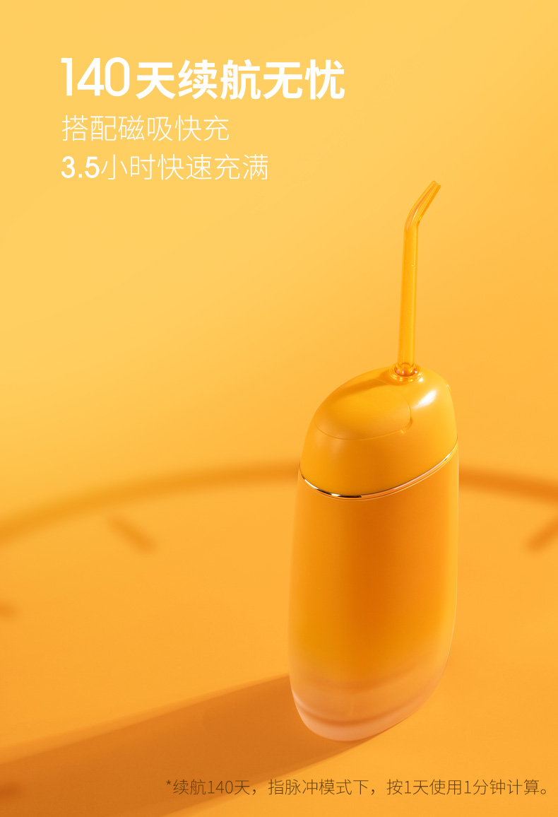 特点:①3种洁牙模式,配备360°可旋转多种专业喷头,随心选择解决多种口腔问题;②0.6mm精准定向聚焦水柱,1600次/分钟高频脉冲;③mini机身,轻净随行,水箱容量140ml,水箱可拆卸冲洗,预防细菌滋生;④低损耗充电快,3.5小时磁吸接触式快充,140天超长续航;⑤IPX7级安全防水。
