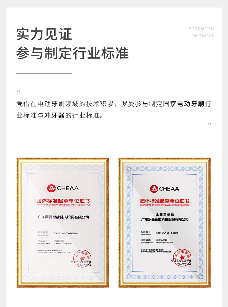 作为中国《电动冲牙器》团体标准的主起草单位,打破了目前电动冲牙器无标准可依的行业现状,以专业性推动口腔护理行业有序发展,助力国人口腔健康。