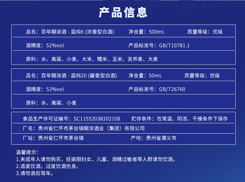 百年糊涂蓝纯620整箱52度(500mL+50mL)*6盒装(特惠)