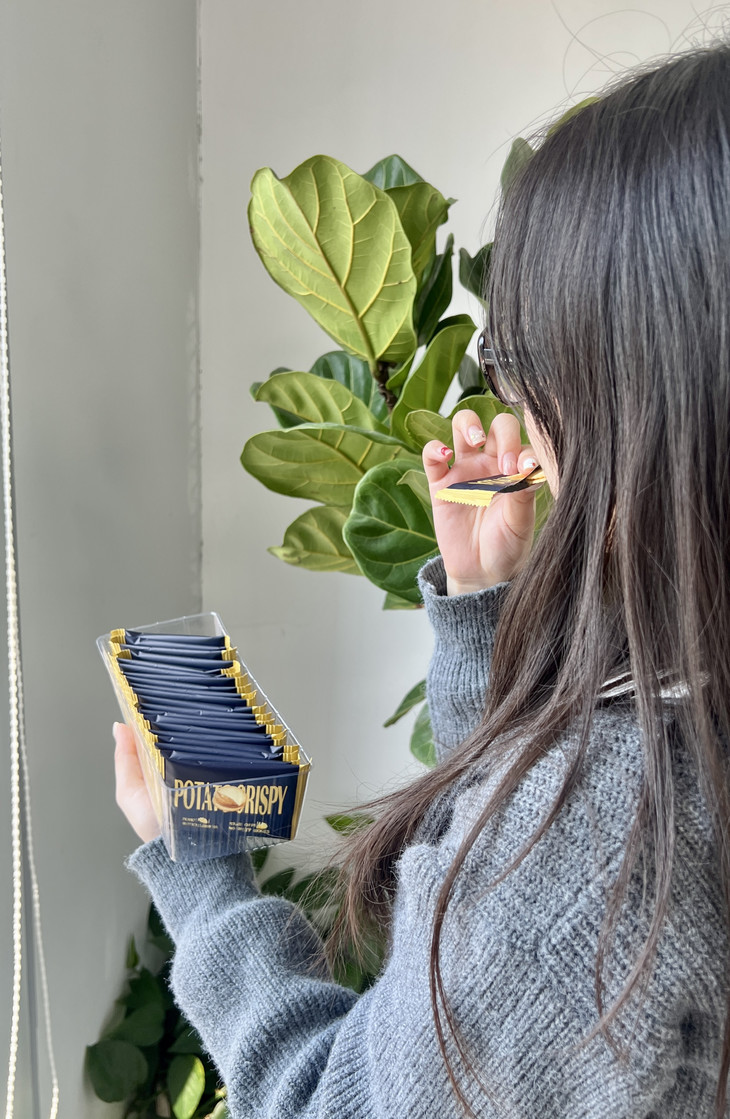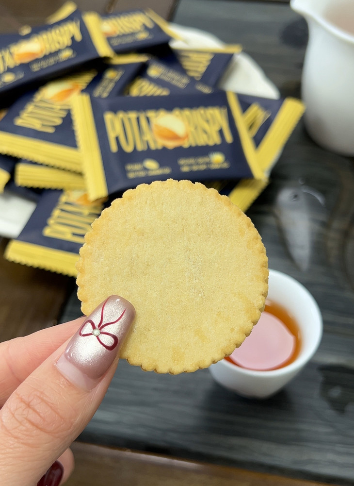 双重酥脆,匠心工艺 外层马铃薯薄饼含≥6.5%马铃薯雪花全粉,叠加安佳黄油(≥5%)烘焙,酥脆加倍,奶香浓郁。 独特膨松工艺,打造空气感薄脆质地,单片饼干薄度≤1.5mm。